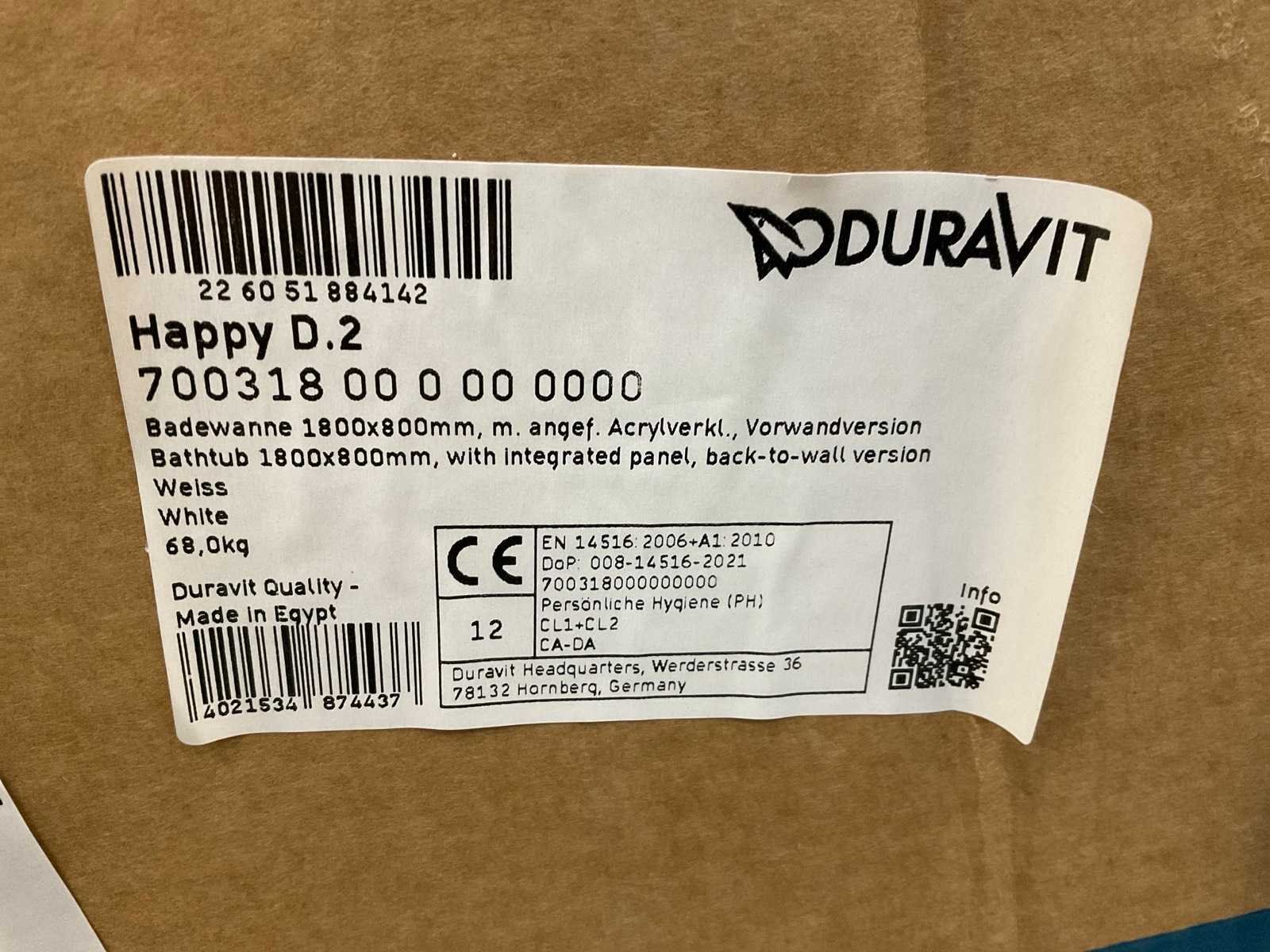Excl. afvoergarnituur. Merk: Duravit Model: Happy D.2 180x80cm Kleur: Wit Gewicht: 68kg Lengte: 180cm Breedte: 80cm Hoogte: 46cm Materiaal: Acryl