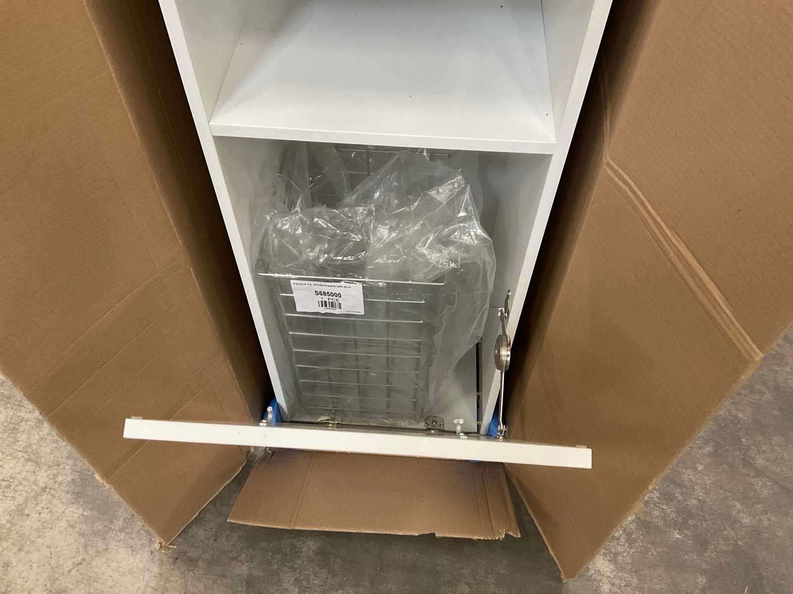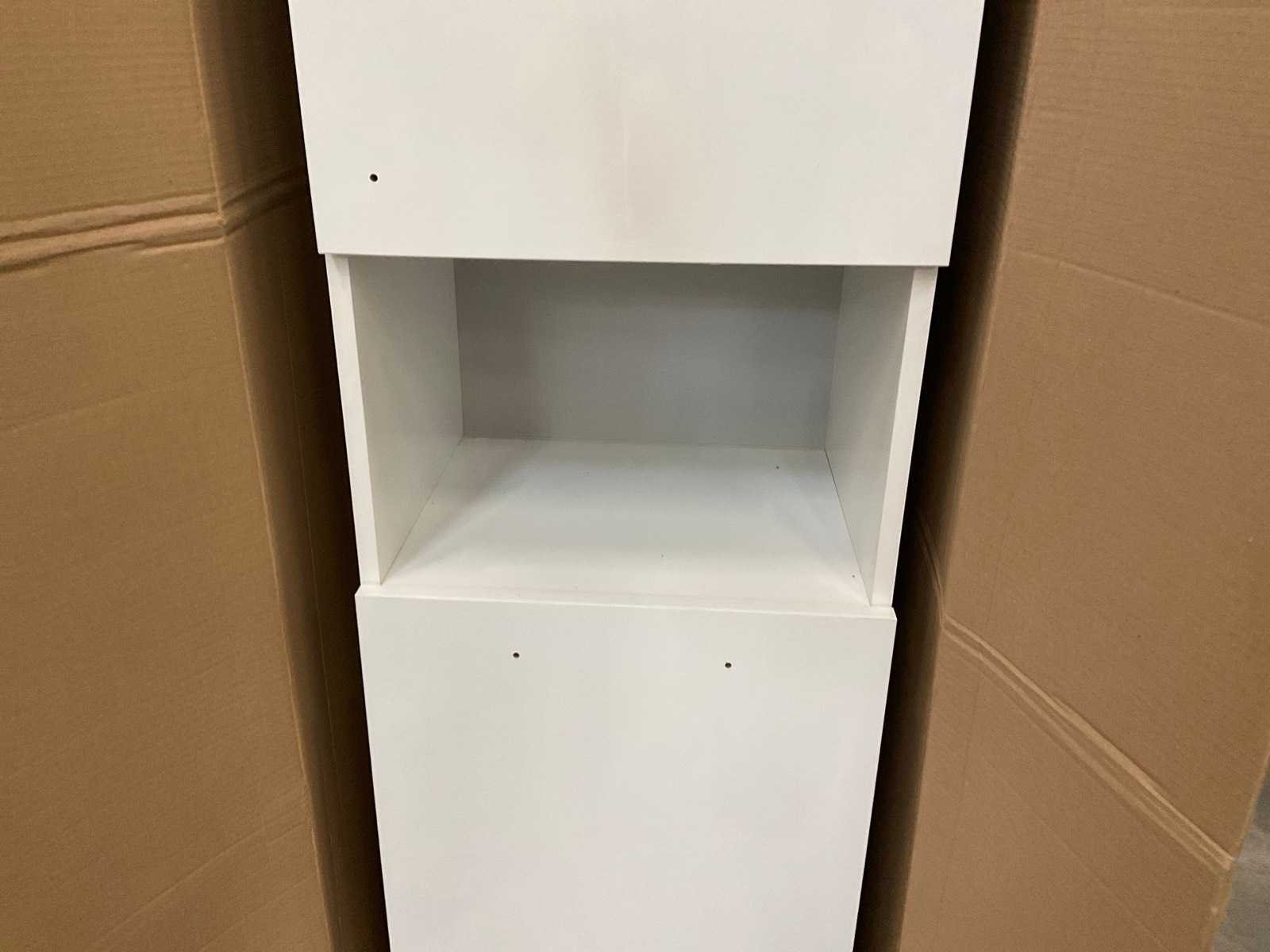 Met 1x deur en 1x klapdeur met linnenmand, deurgrepen aanwezig. Let op! Achterwand bovenste kast heeft transportschade. Merk: Sanijura Model: Elemento Kleur: Wit Lengte: 40cm Breedte: 34cm Hoogte: 175cm Materiaal: Hout