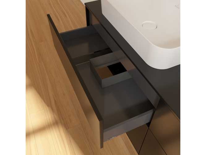 Met 4x lade en LED verlichting. Voor het bedienen van de verlichting is afstandsbediening G999 02 00 nodig. Deze wordt niet standaard meegeleverd. Let op! Excl. kranen en waskommen. Merk: Villeroy & Boch Model: Finion 160cm Product type: G72200PD Kleur: Mat zwart Gewicht: 98kg Lengte: 160cm Breedte: 50cm Hoogte: 60cm