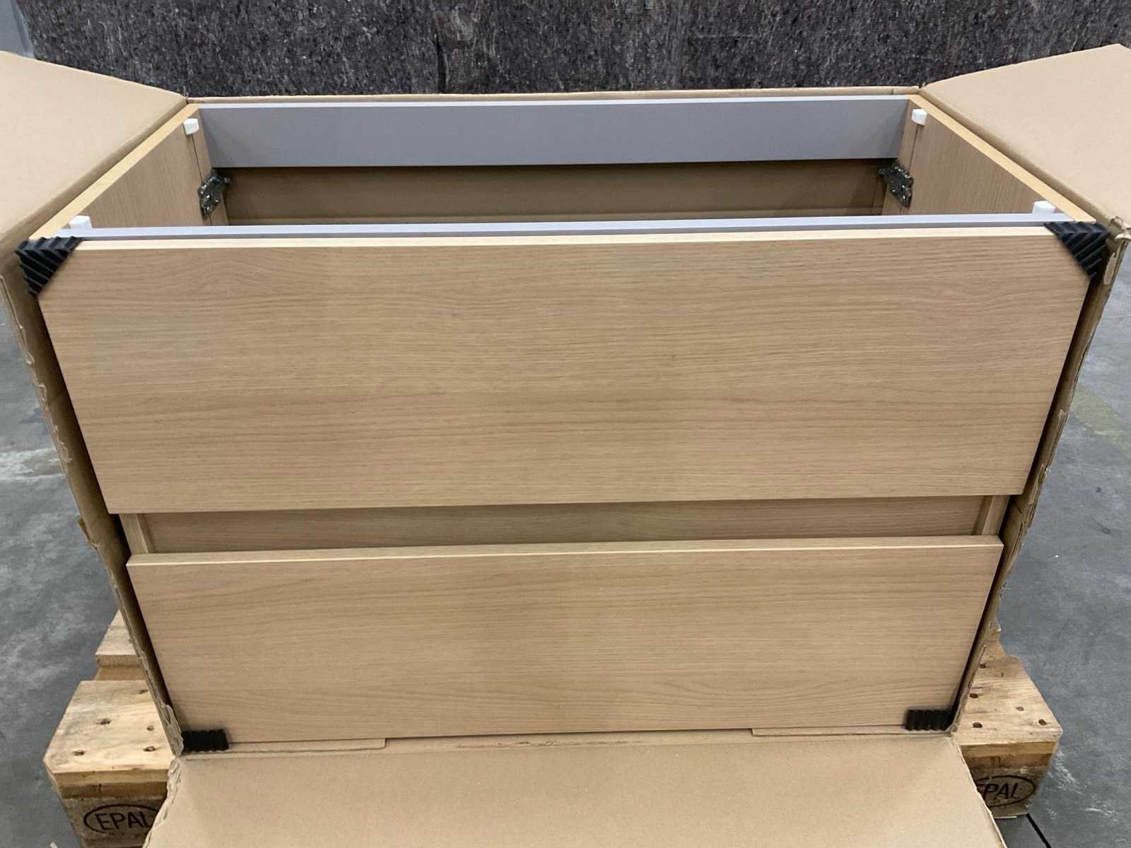 Met 2x lade. Merk: Sanijura Model: D-Motion 90cm Kleur: Licht natura Lengte: 90cm Breedte: 46cm Hoogte: 62cm