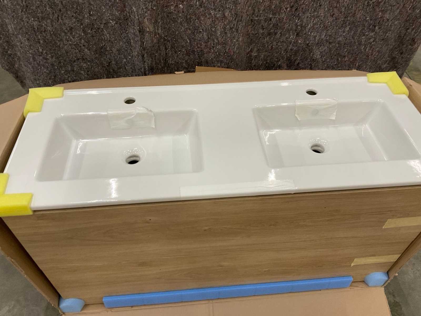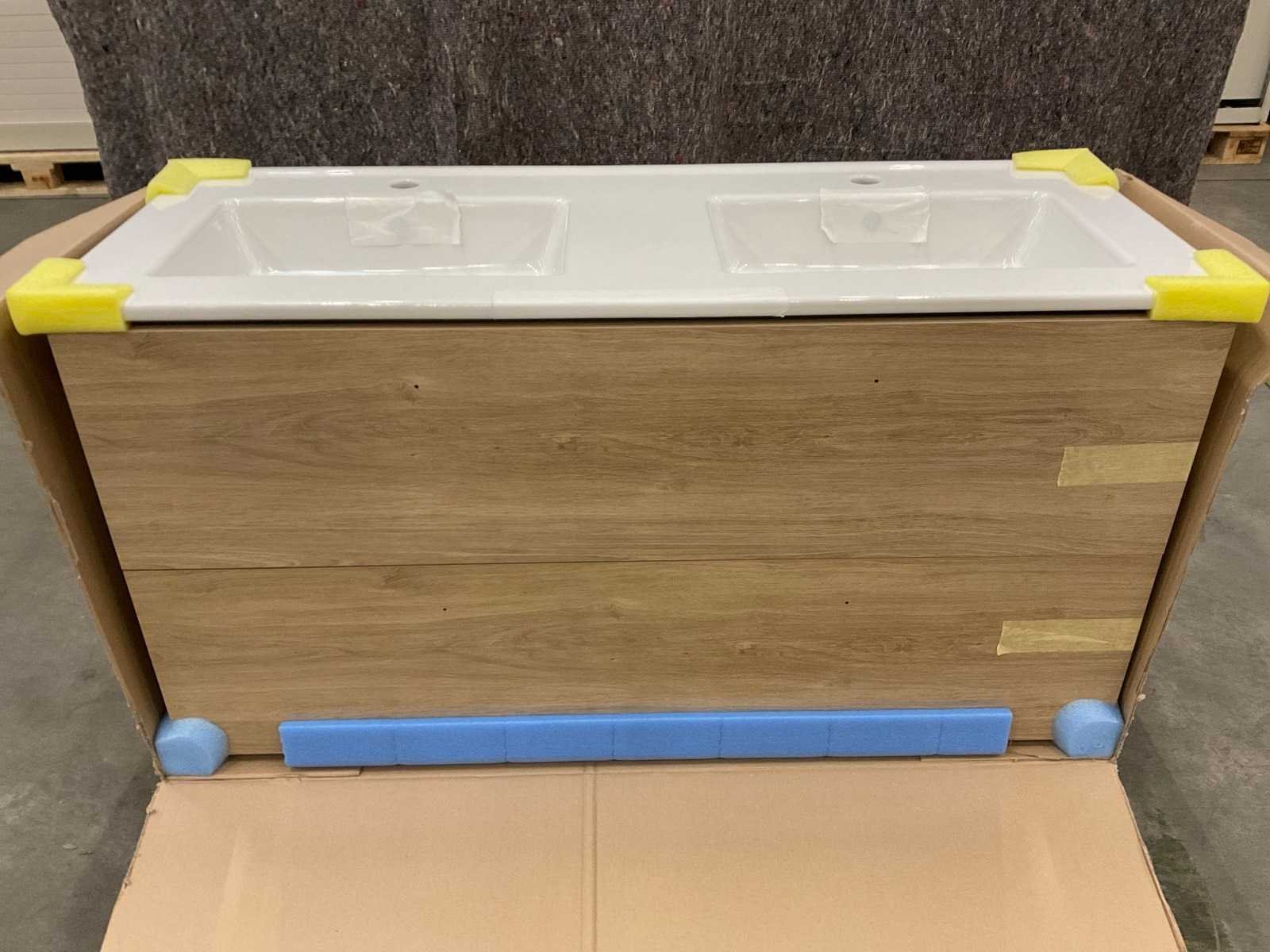 Met 2x lade. Incl. Sanijura Mundo dubbele waskomtafel, kleur wit, met 2x kraangat en 2x overloop. Merk: Sanijura Model: Mundo 120cm Lengte: 120cm Kleur: Eiken Québec Kraan: Nee Spiegel: Nee Lades: 2