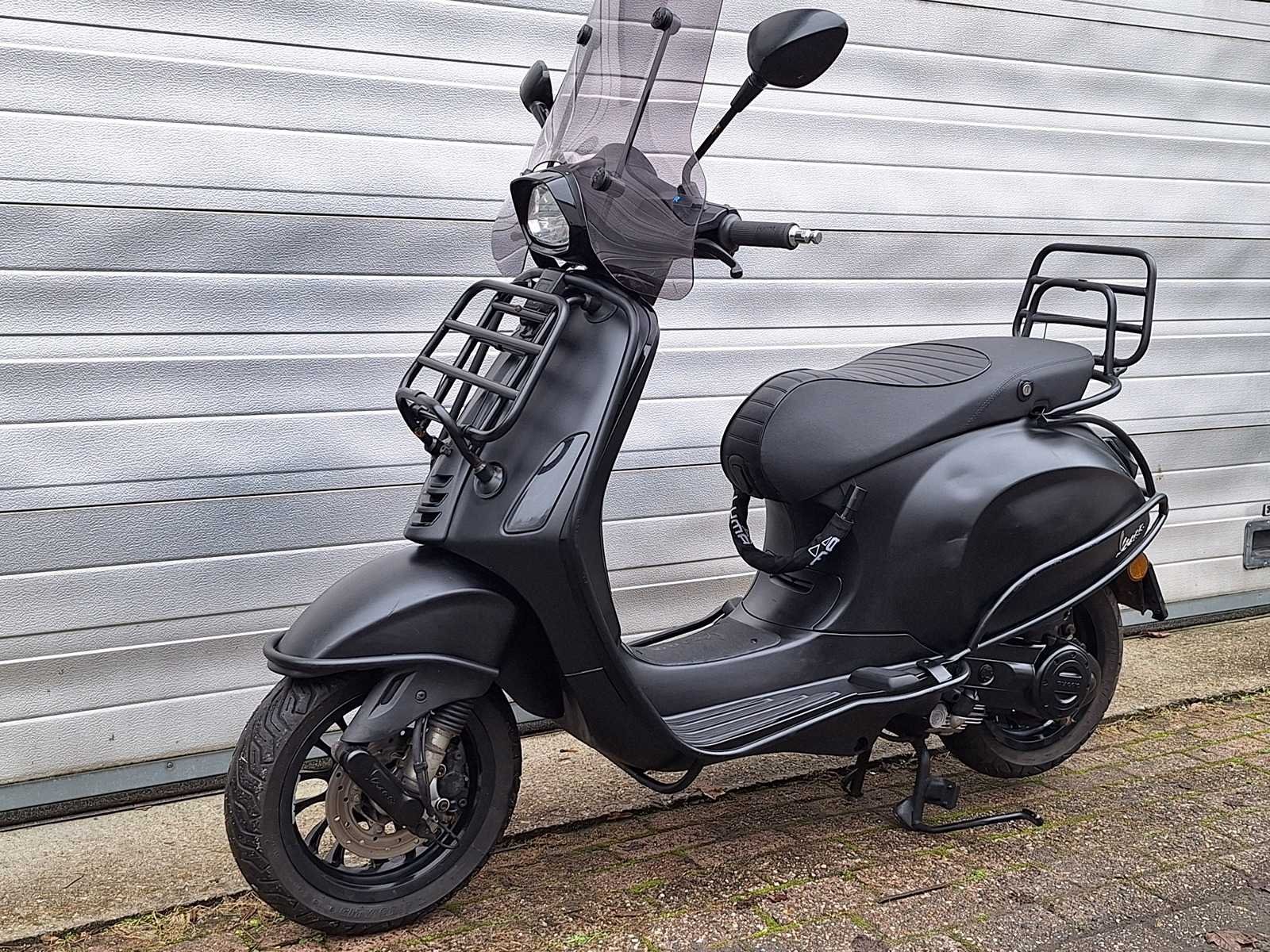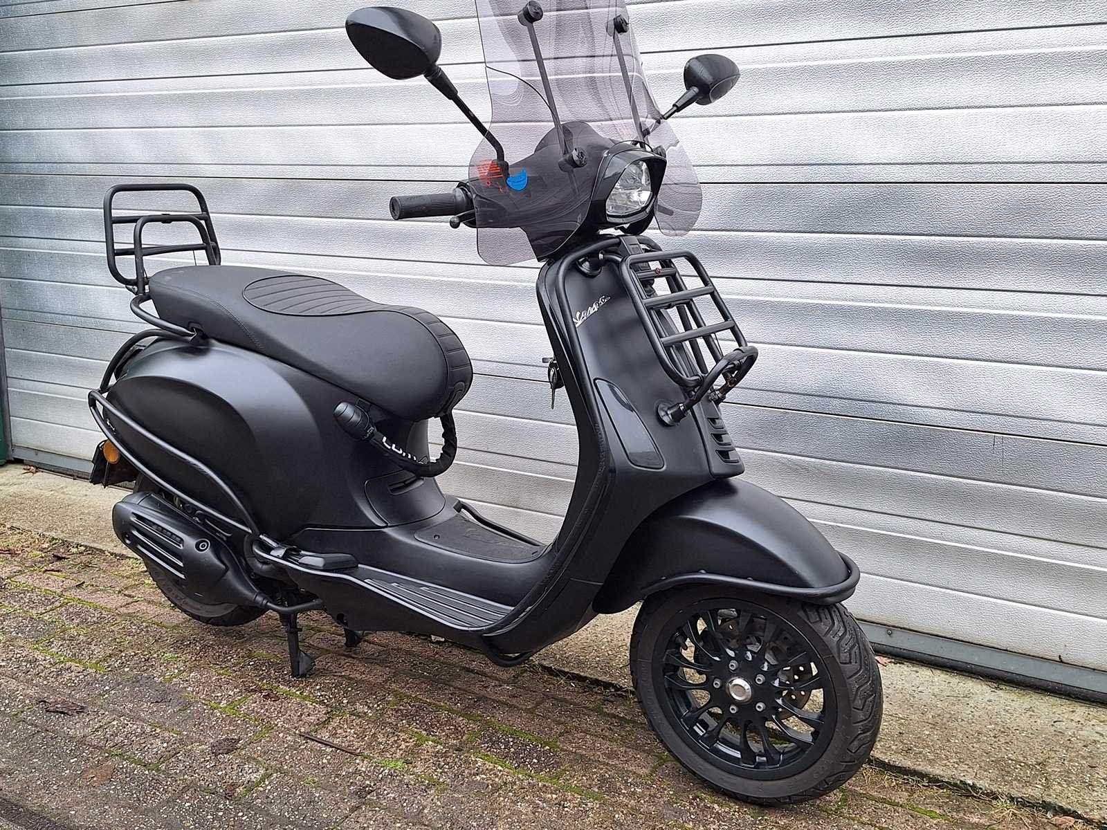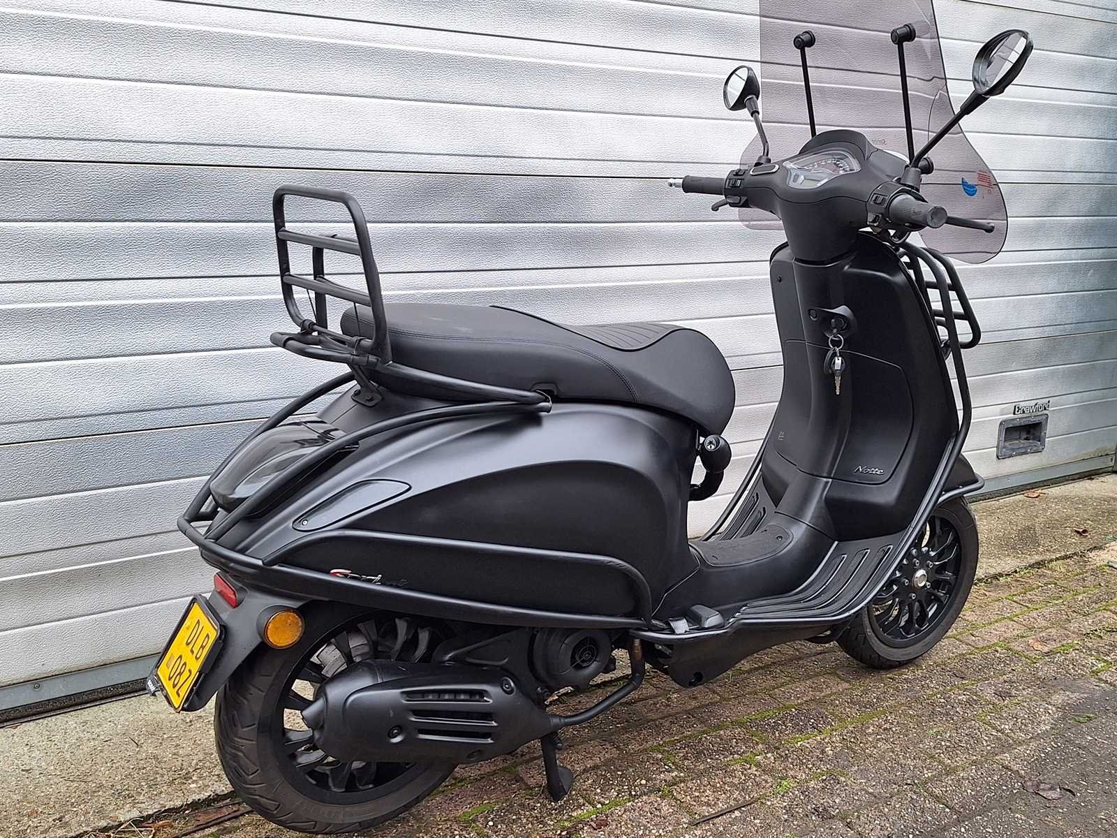 1 sleutel voor scooter, 1 sleutel voor extra stuurslot en 1 alarmkastje aanwezig voor scooter. Accessoires: hoog windscherm, beugelset, extra stuurslot, voor- en achterklapdrager, ledverlichting en beenkleed. Merk: Piaggio Vespa Model: 45 km bromscooter 4takt Type: Sprint Notte Snelheid: 45km/h Kenteken: DLB08Z Datum eerste toelating: 08-07-2017 Bouwjaar: 2017 Kleur: mat zwart Afgelezen kilometerstand: 16808km