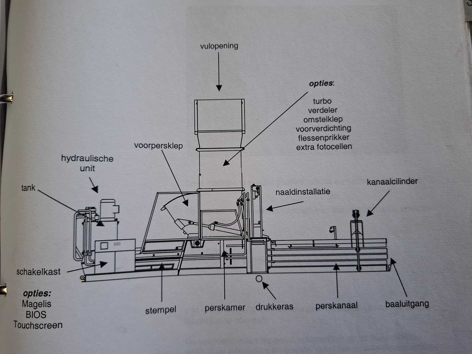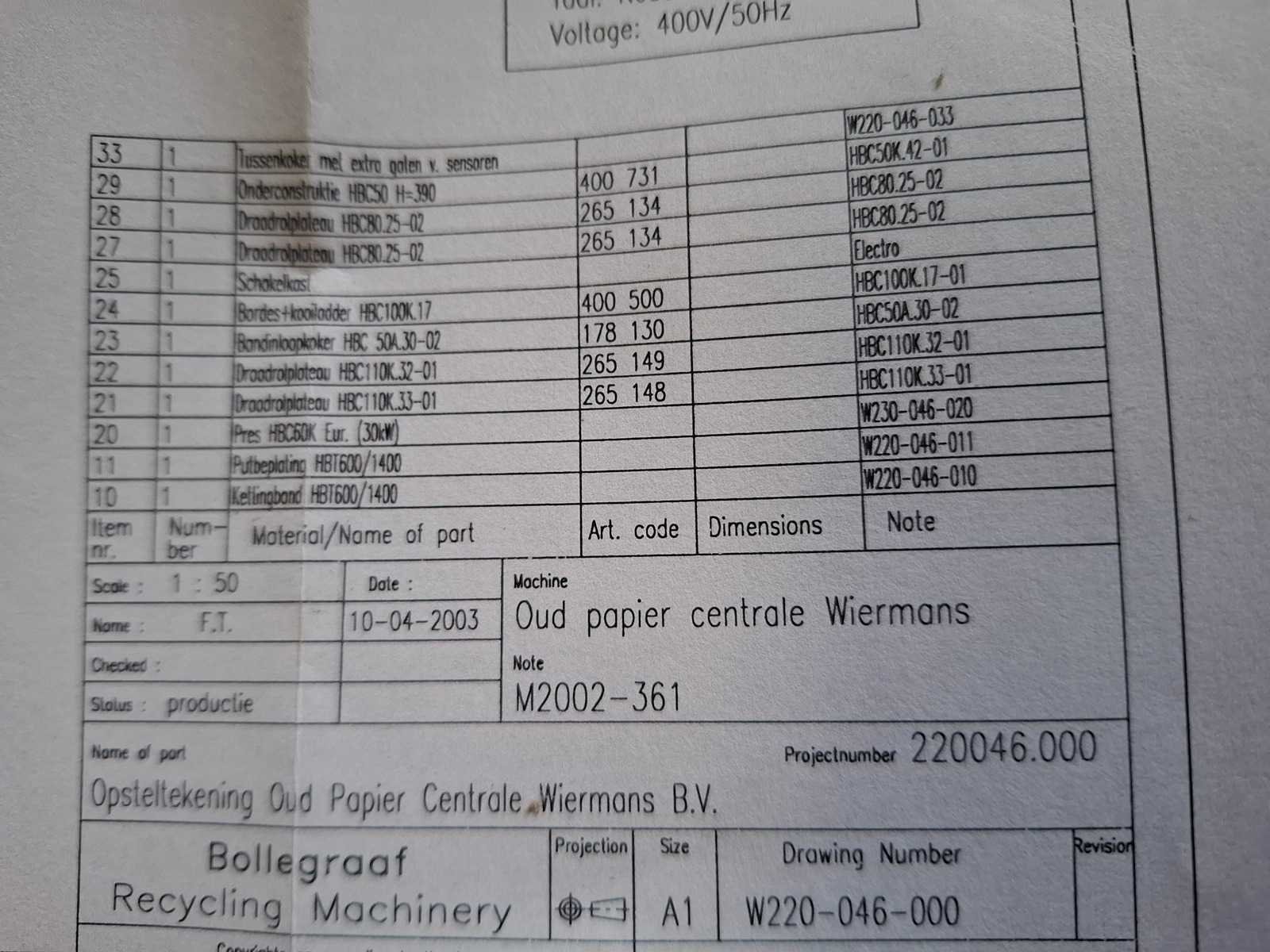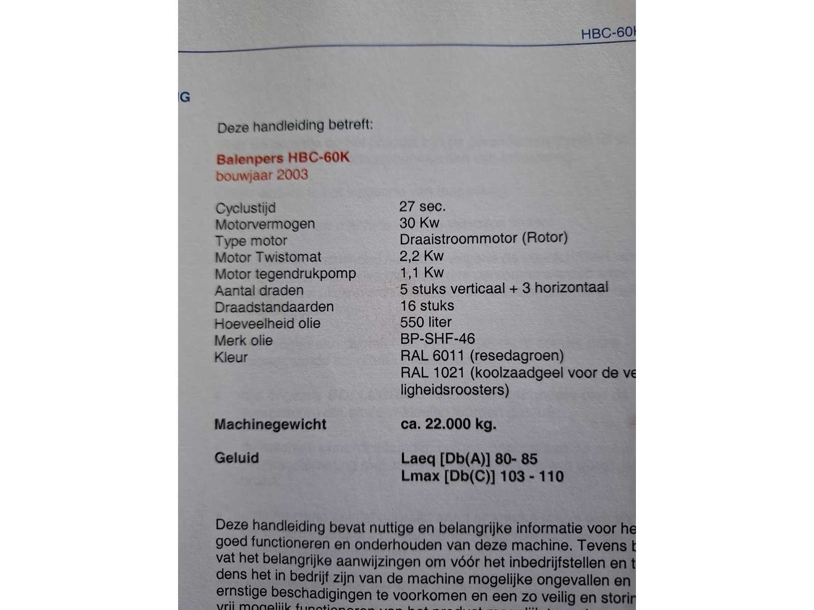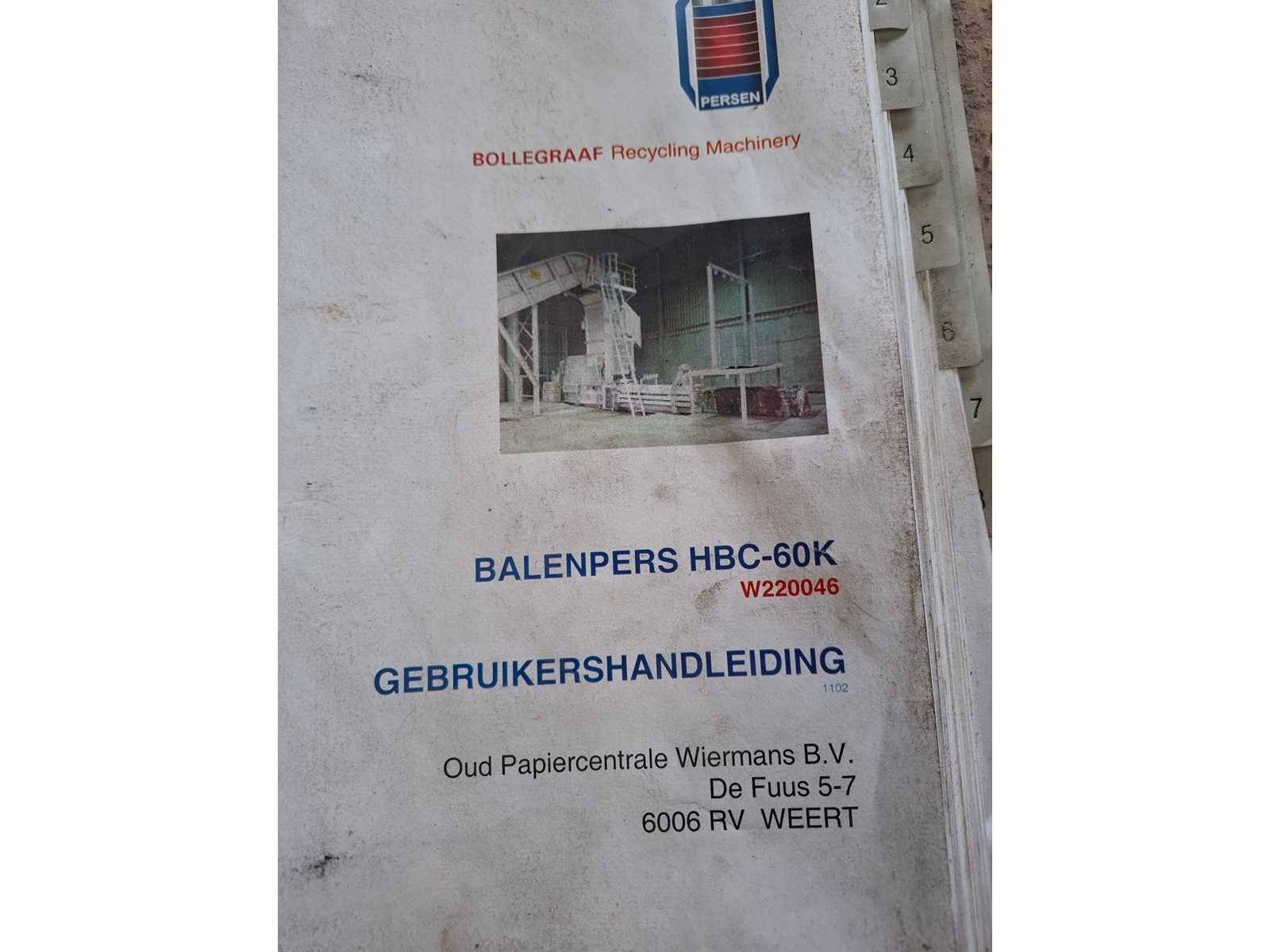 Complete persinstallatie bestaande uit volautomatische balenpers Bollegraaf HBC-60A (30kW) uit 2003 met kettingband aanvoerband HBT-600/1.400 * 19.486 - 30/15gr, draadstation en plastic ventiel. Voor horizontaal en verticaal inbinden. Afgelezen urenstand: ca 3.492 uur. Lengte balenpers ca 9 meter, lengte aanvoerlijn: ca 17 meter. Draadstation dient gereviseerd te worden. Demontage dient door koper te worden uitgevoerd. Datum ophalen in overleg binnen 1 maand na sluiting veiling. Voor demontage dient het damwandprofiel wand te worden gedemonteerd. Koper dient de wand weer wind en water dicht terug te plaatsen. Merk: Bollegraaf Type: HBC-60 Bouwjaar: 2003 Serienummer: W220046 Balenpers type: true Folie / kartonpers type: true