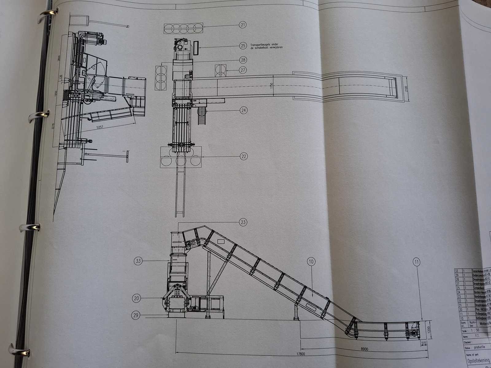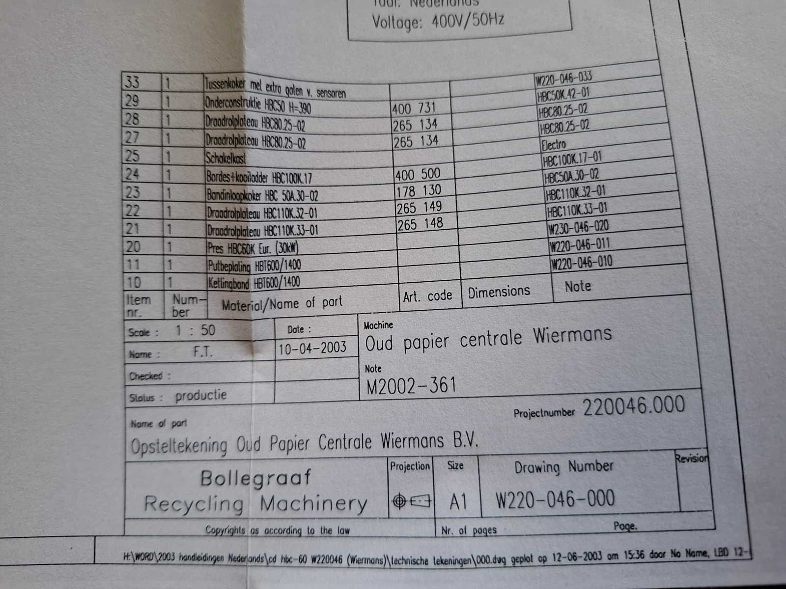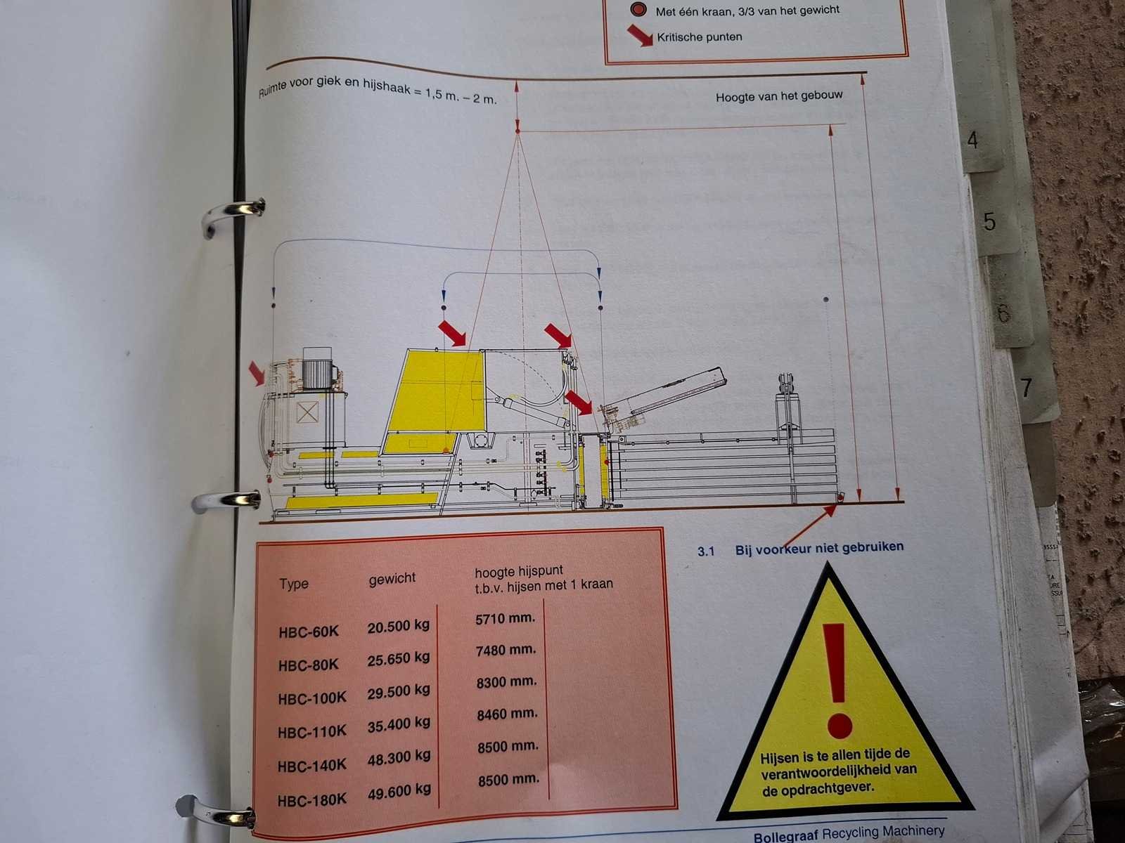 Complete persinstallatie bestaande uit volautomatische balenpers Bollegraaf HBC-60A (30kW) uit 2003 met kettingband aanvoerband HBT-600/1.400 * 19.486 - 30/15gr, draadstation en plastic ventiel. Voor horizontaal en verticaal inbinden. Afgelezen urenstand: ca 3.492 uur. Lengte balenpers ca 9 meter, lengte aanvoerlijn: ca 17 meter. Draadstation dient gereviseerd te worden. Demontage dient door koper te worden uitgevoerd. Datum ophalen in overleg binnen 1 maand na sluiting veiling. Voor demontage dient het damwandprofiel wand te worden gedemonteerd. Koper dient de wand weer wind en water dicht terug te plaatsen. Merk: Bollegraaf Type: HBC-60 Bouwjaar: 2003 Serienummer: W220046 Balenpers type: true Folie / kartonpers type: true
