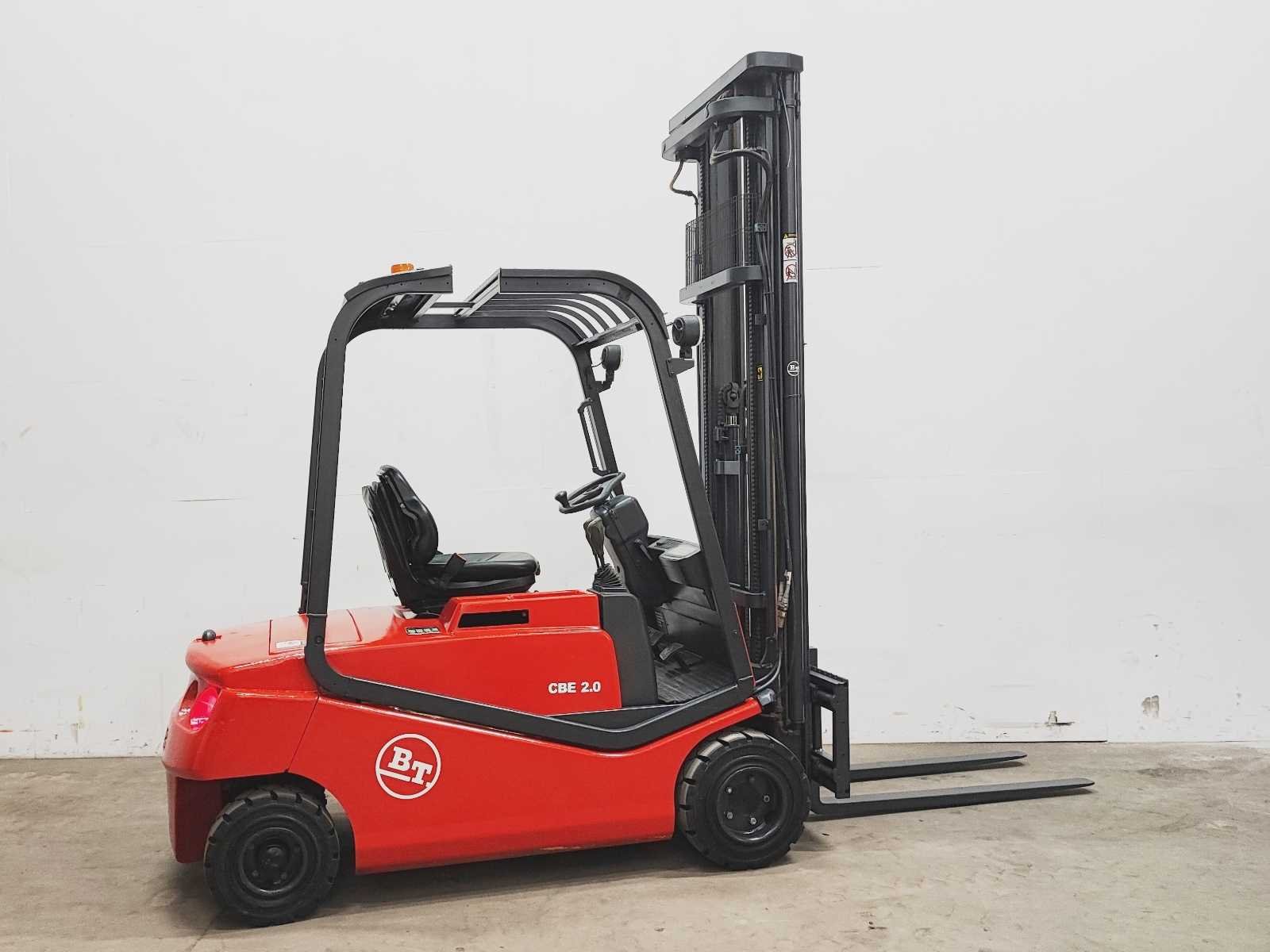 Merk: BT Type: CBE 2.0F Bouwjaar: 2002 Serienummer: 216633 Mast: Triplo freelift Aantal wielen: 4 Accu lader: true Free-lift: true Side-shift: true Triple mast: true Eigen gewicht: 3975kg Hefvermogen: 2000kg Lepellengte: 1150mm Hefhoogte: 6200mm Vol rubber banden: true Minimale doorrijhoogte: 2720mm Totale afmeting L: 2300mm Totale afmeting Breedte: 1050mm Totale afmeting Hoogte: 2720mm