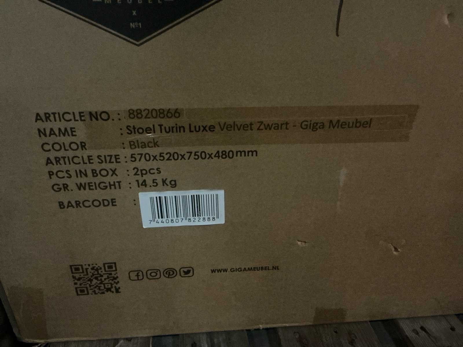 Merk: Gigameubel Model: Turin Luxe Kleur: Velvet zwart Lengte: 48cm Breedte: 57cm Hoogte: 75cm Materiaal: Velvet stoffen bekleding op zwartkleur frame