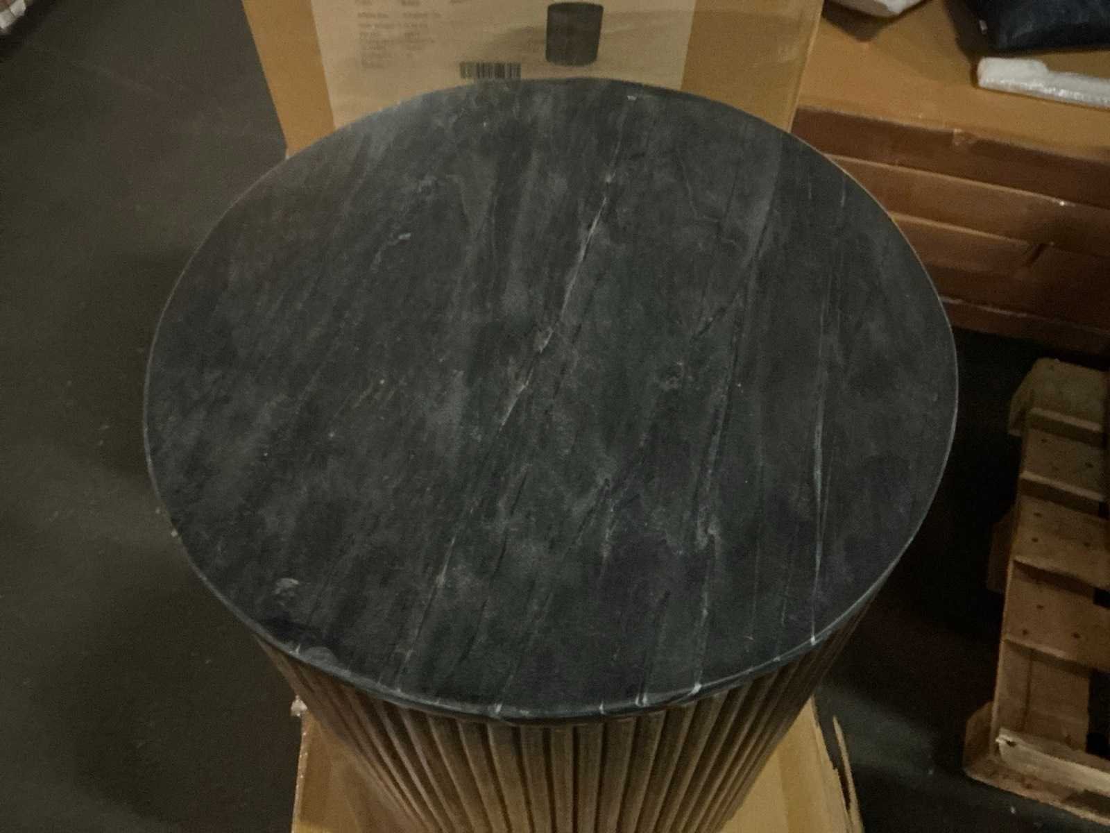 Merk: Gigameubel Model: Glitzie Kleur: Marble black marine & wood brown Lengte: 40cm Breedte: 40cm Hoogte: 50cm Materiaal: Hout en marmer