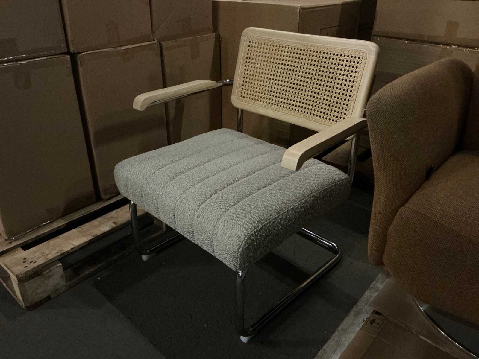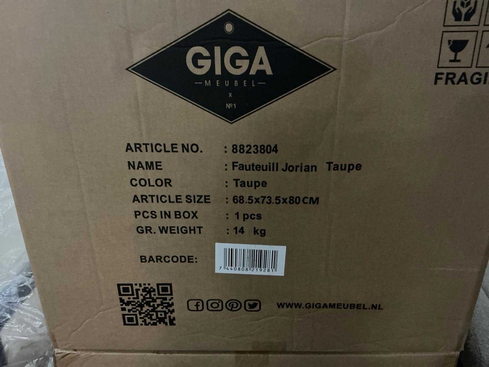 Merk: Gigameubel Model: Jorian Kleur: Taupe Lengte: 63cm Breedte: 73cm Hoogte: 80cm Materiaal: Stoffen bekleding met hout/metaal