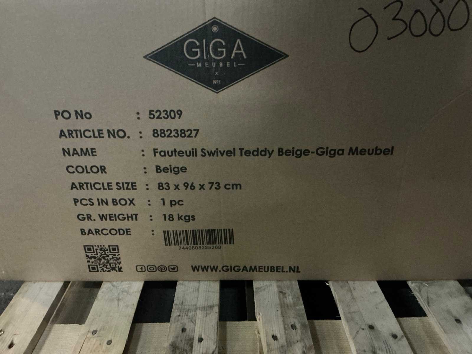 Draaibare voet Merk: Gigameubel Model: Swivel Teddy Beige Kleur: Beige Lengte: 83cm Breedte: 96cm Hoogte: 73cm Materiaal: Stoffen bekleding