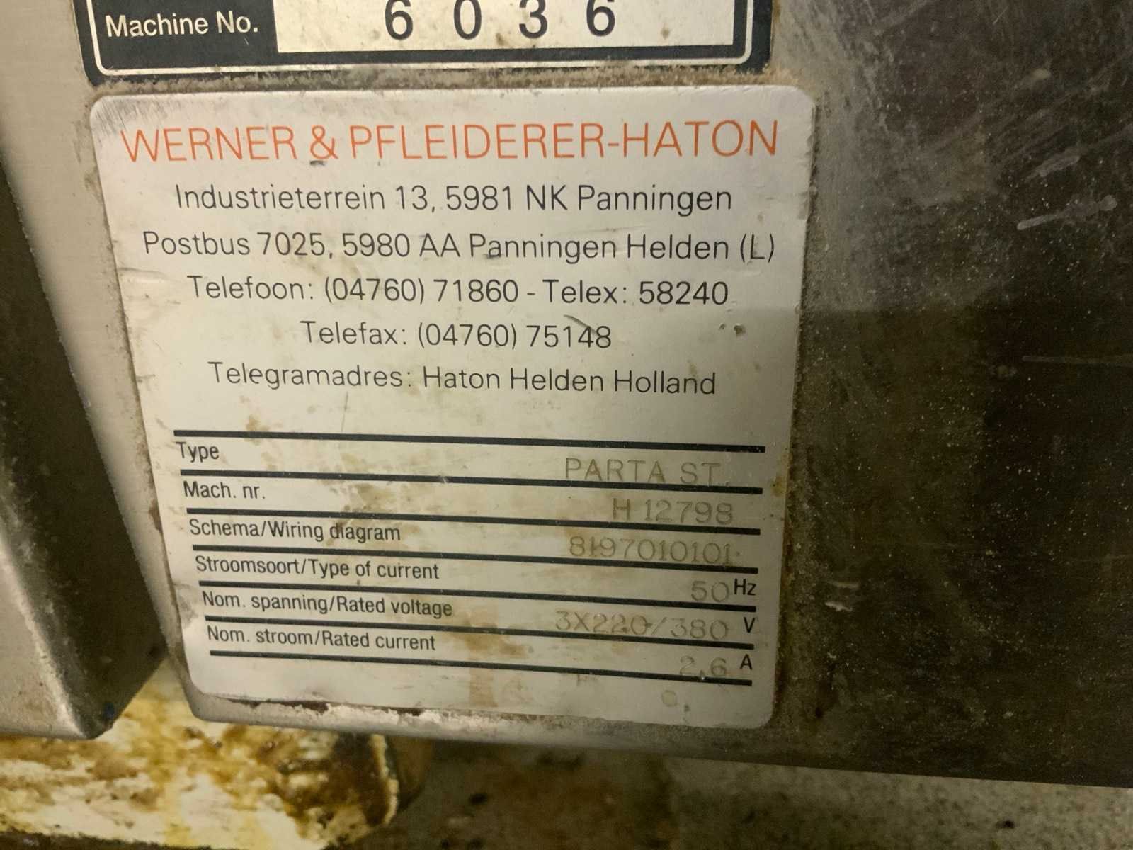 Capaciteit: gewichtsbereik 200-1700 gram Merk: Werner & Pfleiderer-Haton Type: Parta ST Serienummer: H12798 Aansluiting: 400V Totale afmeting L: 1630mm Totale afmeting Breedte: 520mm Totale afmeting Hoogte: 1620mm Capaciteit.: 1215pcs/hr