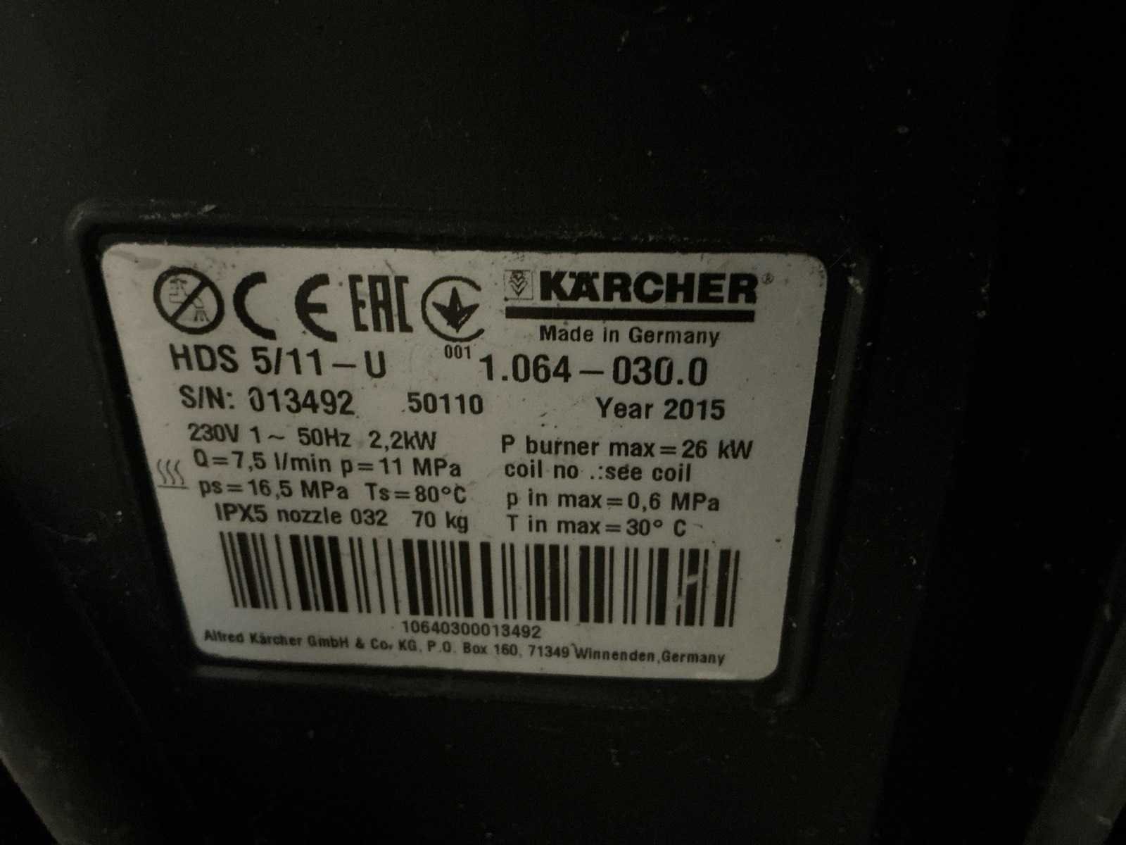 Merk: Kärcher Type: HDS 5/11U Bouwjaar: 2015 Serienummer: 013492 Dieselgestookt: true Mobiel: true Aansluiting: 230V Eigen gewicht: 70kg Totale afmeting L: 580mm Totale afmeting Breedte: 600mm Totale afmeting Hoogte: 1020mm