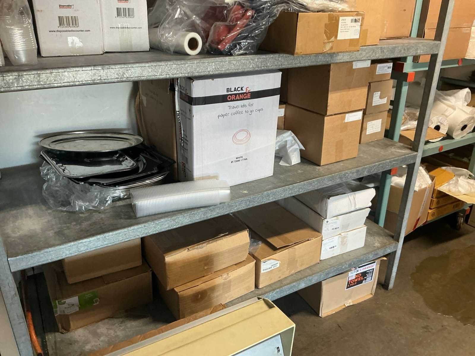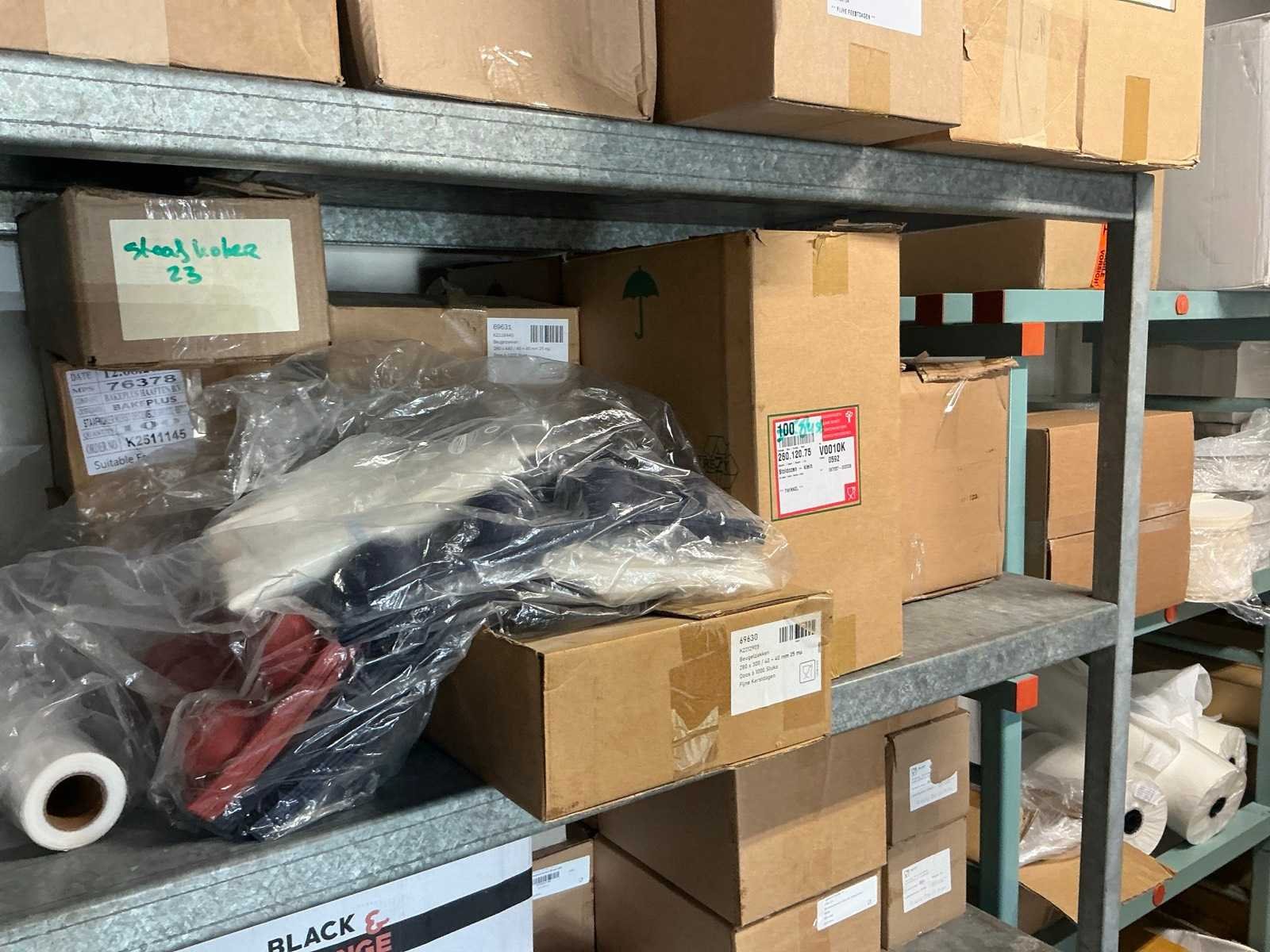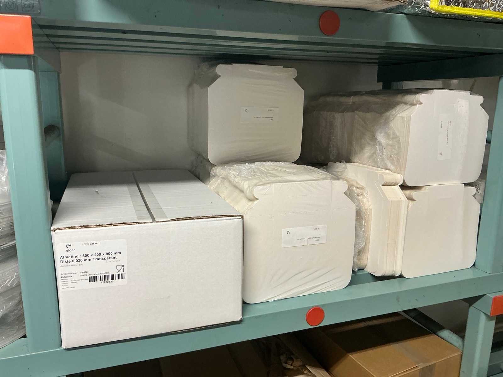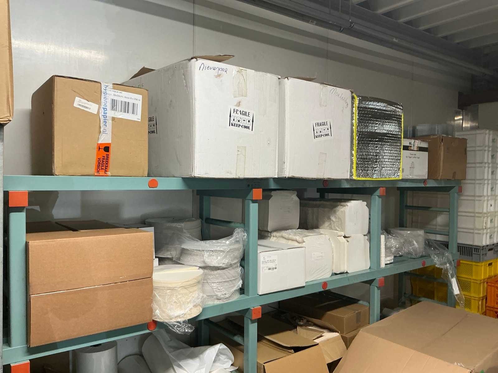 Bestaande uit onder andere: inhoud 2 stellingen met kartonnen dozen, bekers, deksels, zakken, servetten, taartkartons. Inclusief 2 stellingen (LxBxH): 700x1960x2000mm en 500x3020x1880 op wielen.