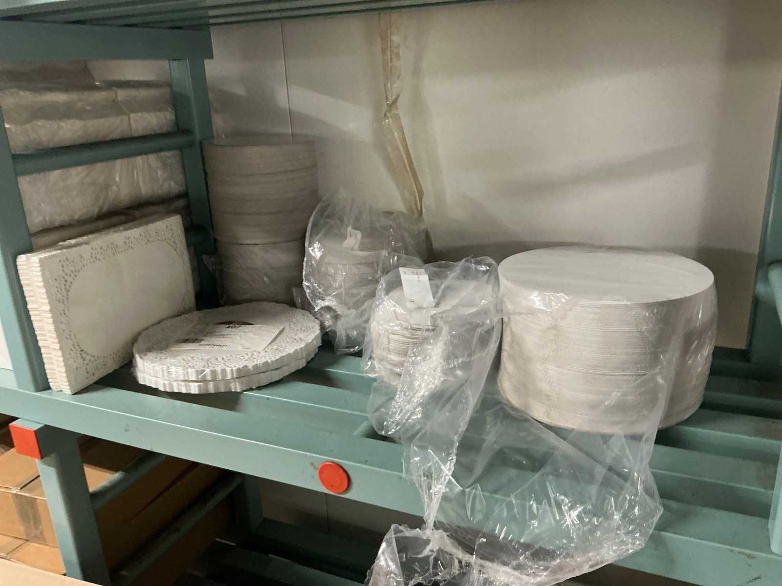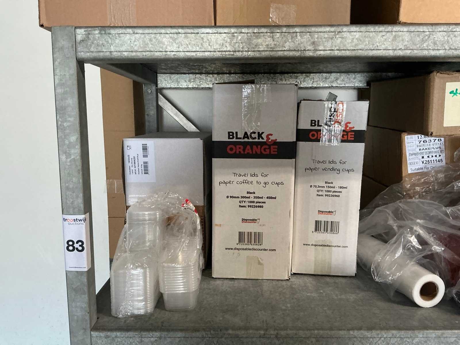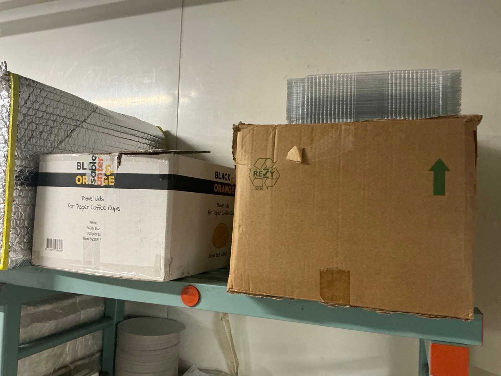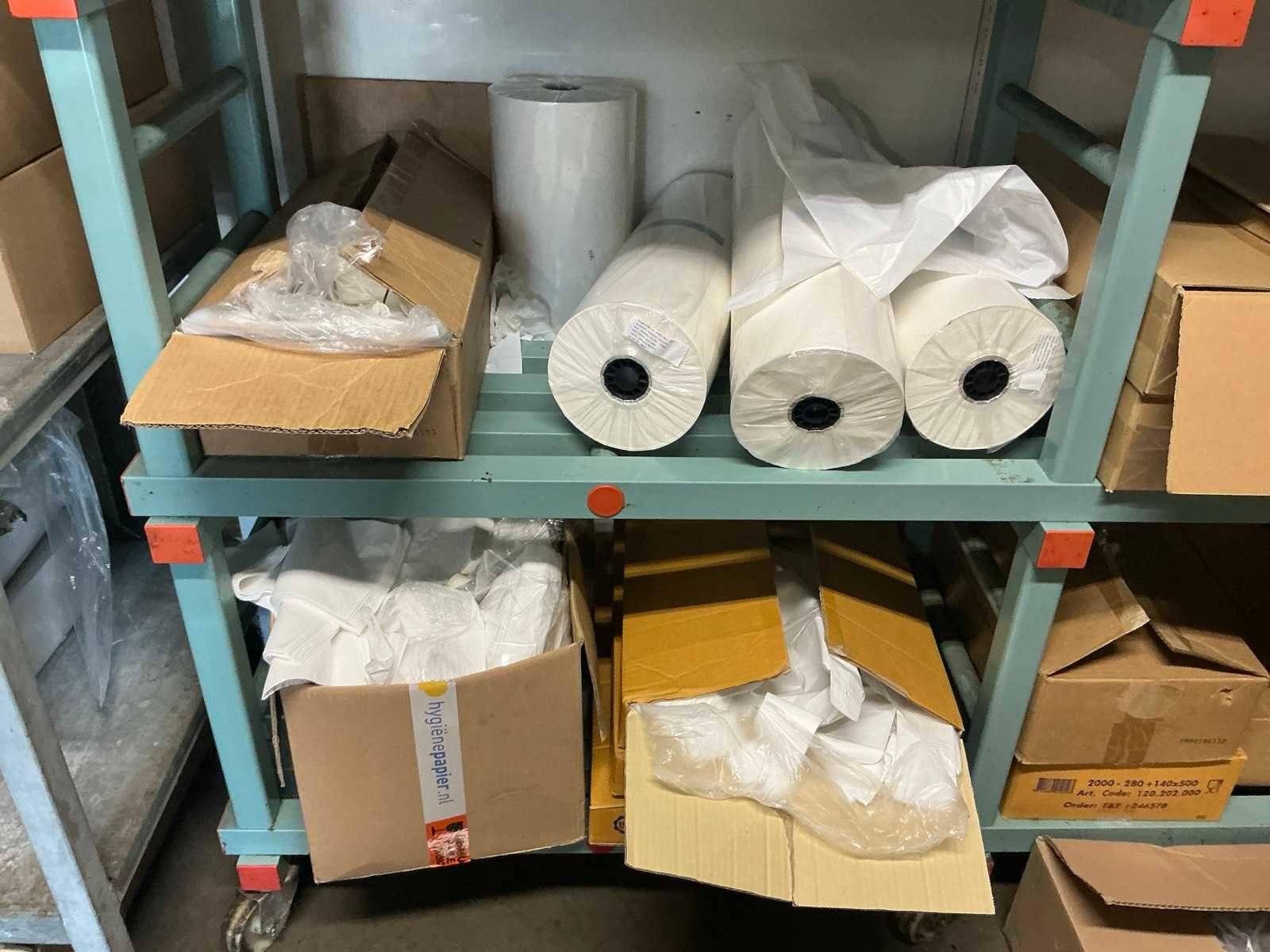 Bestaande uit onder andere: inhoud 2 stellingen met kartonnen dozen, bekers, deksels, zakken, servetten, taartkartons. Inclusief 2 stellingen (LxBxH): 700x1960x2000mm en 500x3020x1880 op wielen.