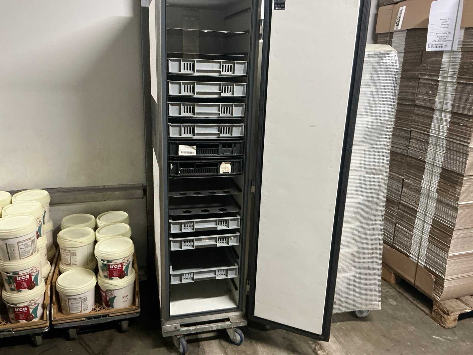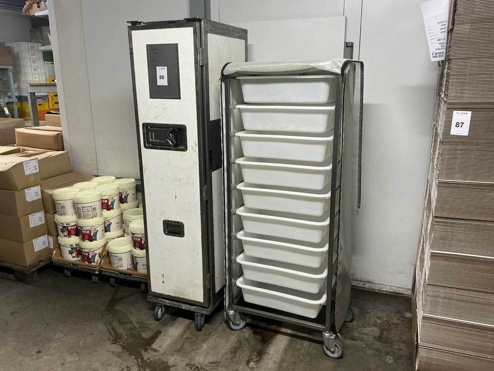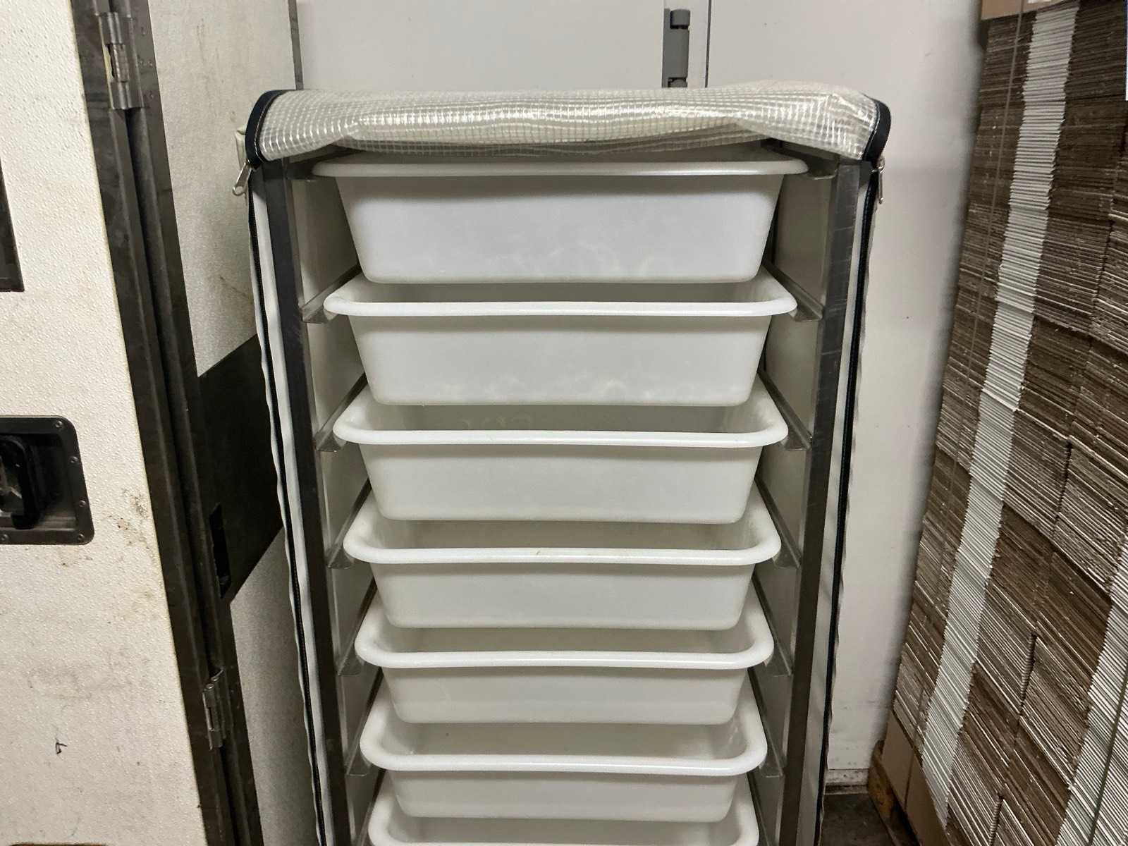 Verrijdbaar, 9 kunststof bakken, beschermhoes. 1 verrijdbare trolley, met kratten. LxBxH: 710x500x1980mm