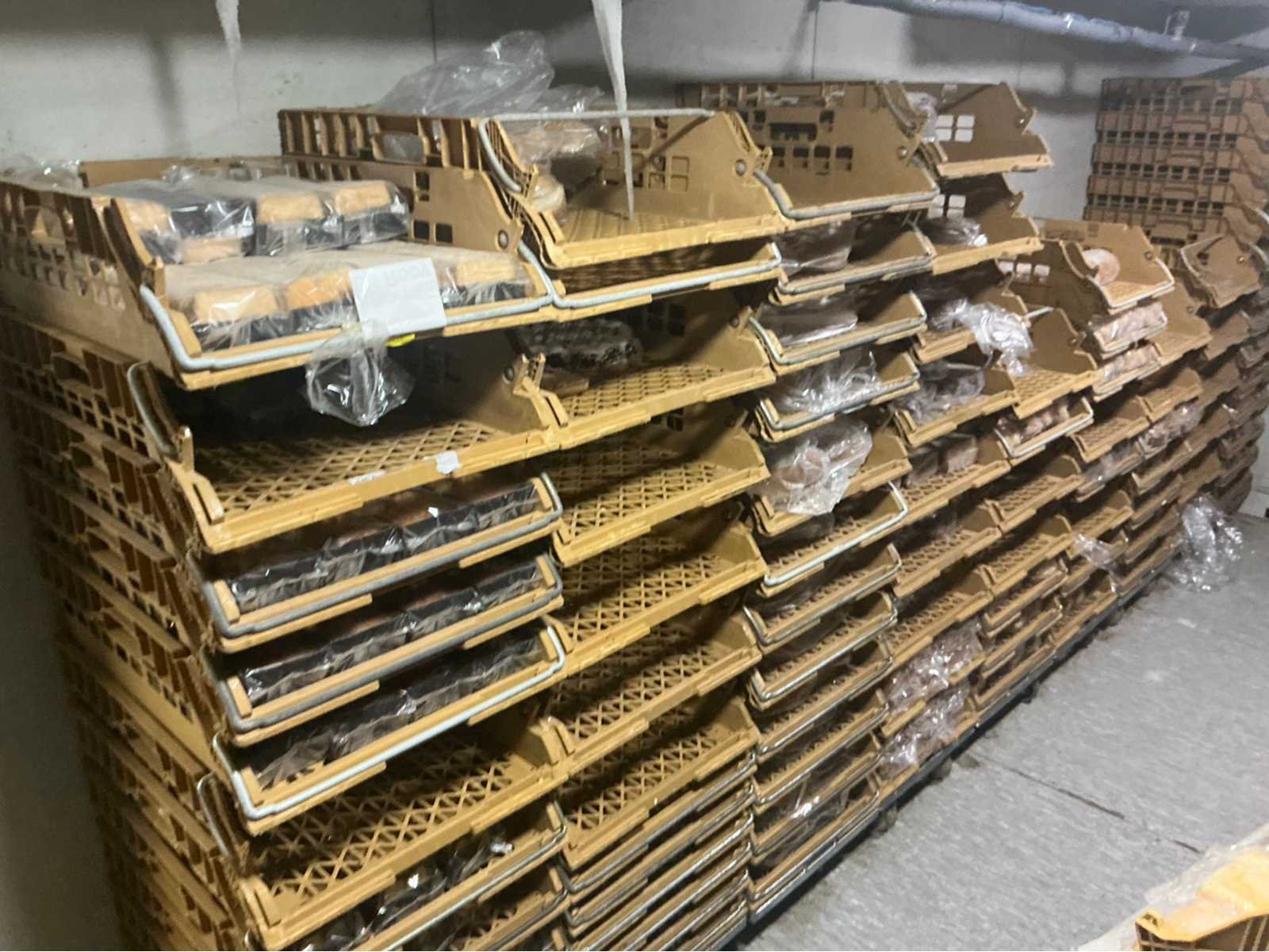 Ca 30 trolleys broodkratten met waaronder; diverse cakes, broodjes rozijnbroodjes, minibroodjes, diverse soorten vegetarische cakes