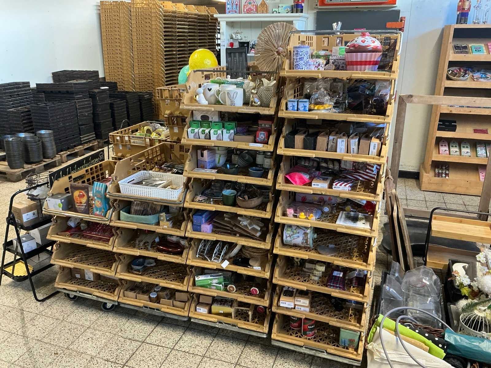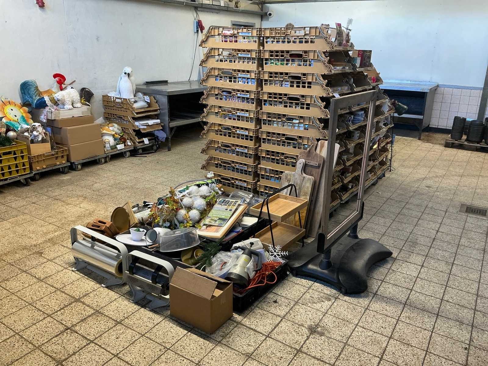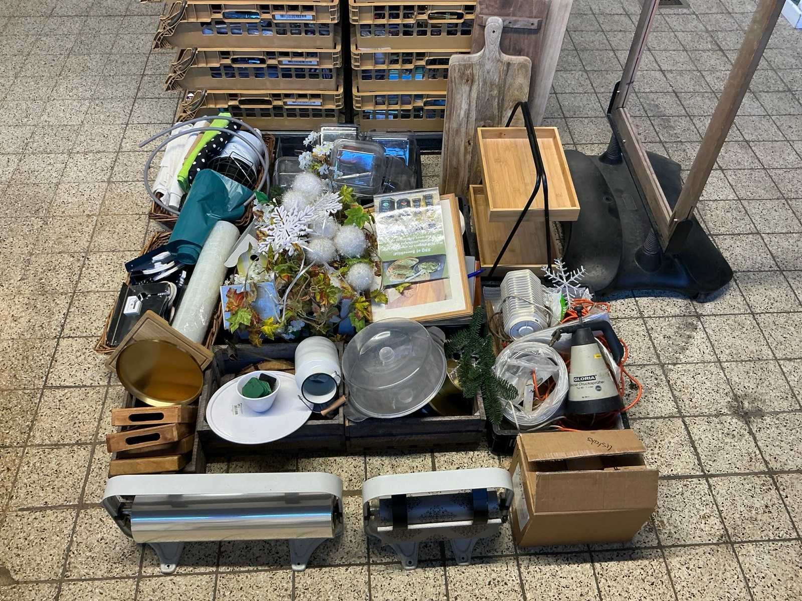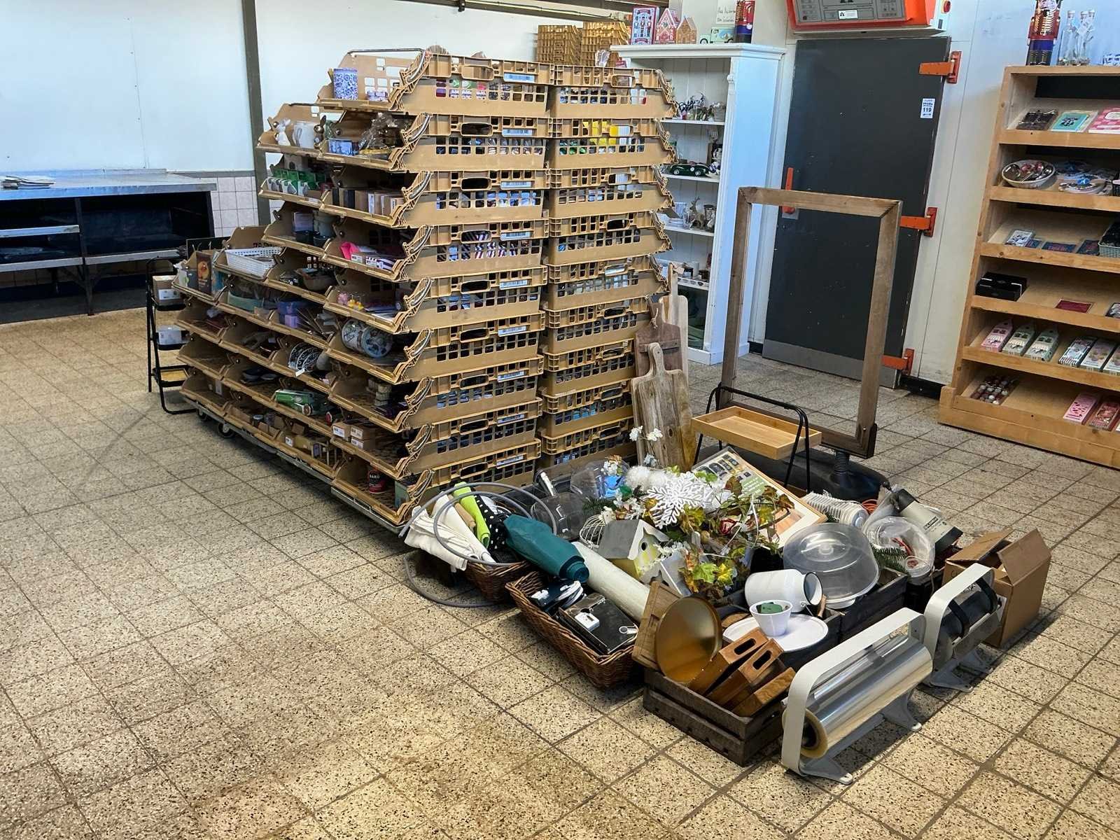 Inclusief broodkratten en dollies. Onder andere, stoepbord, decoratiemateriaal, drop, trommels en diversen