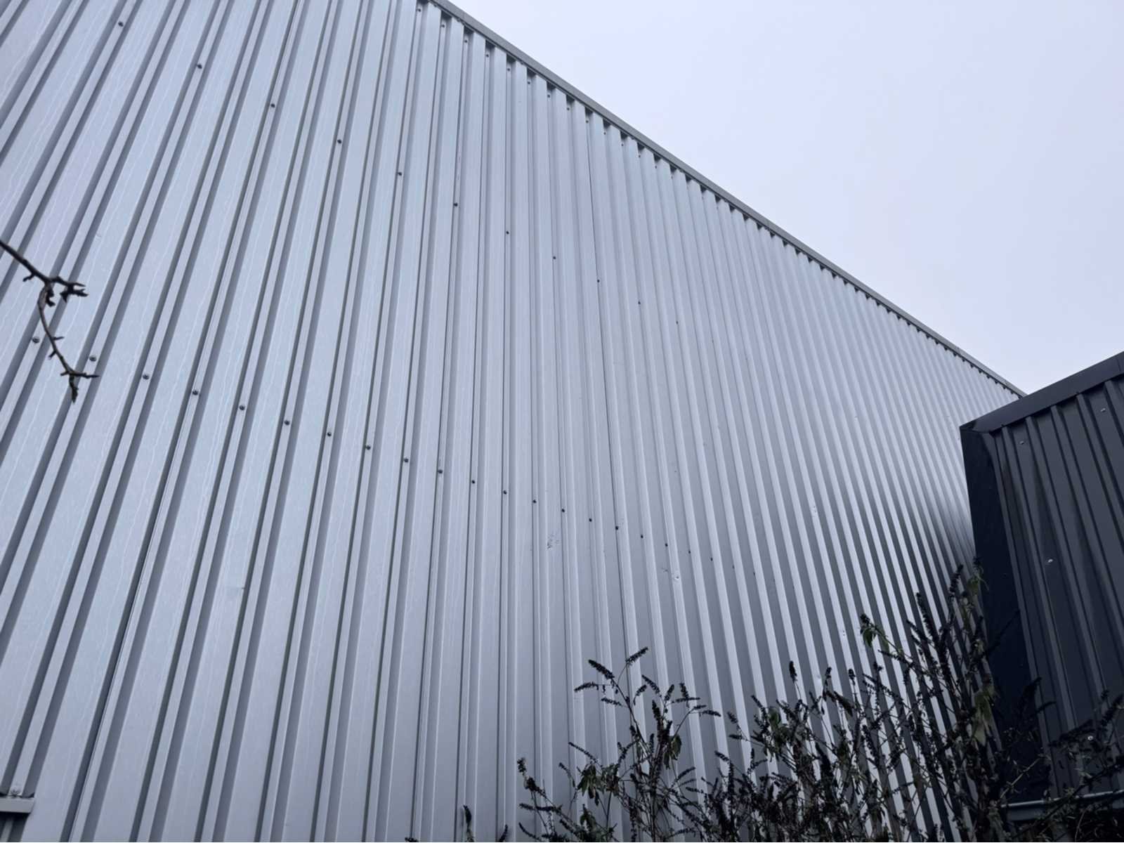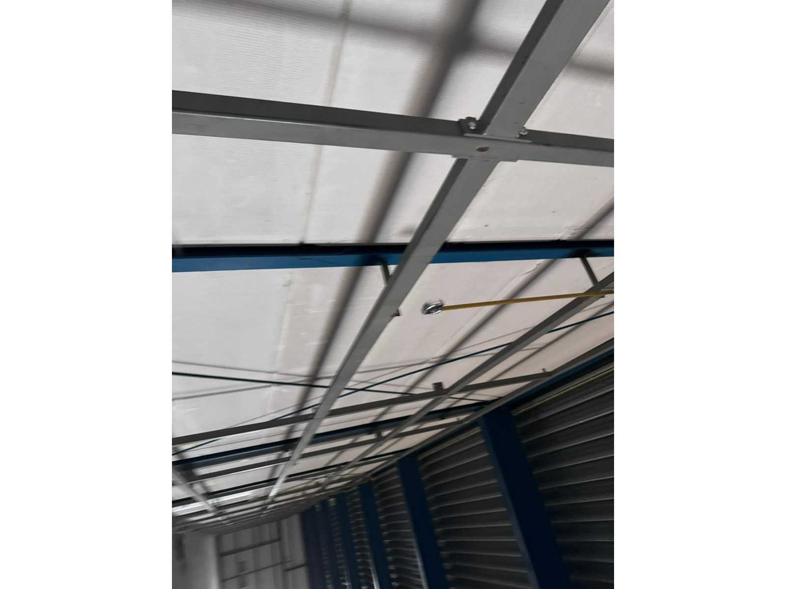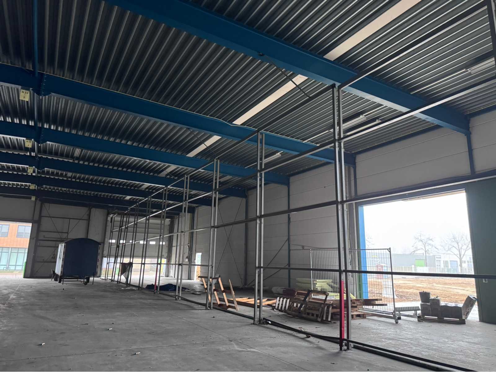 Vrije overspanning van 24400 mm; vakmaat ca. 5000 mm; constructie is blauw gecoat; staanders zijn IPE 220; spantbenen zijn IPE 550; constructie is voorzien van gevel schoren; dekschoren; drukbalken; voorgevel is bekleed met sandwich panelen; rechter zijgevel bekleed met sandwich panelen; achter gevel bekleed met damwand profiel platen; 1 zijgevel ontbreekt; zonder betonnen gevel beplating; dak is van stalen worm profiel platen; met isolatie; 1 schuifdeur van 5100 mm breed en 4470 mm hoog; 1 overheaddeur van 6040 mm breed en 4510 mm hoog; wordt gedemonteerd en transport klaar gemaakt door verkoper; kijkdag en afhalen volledig op afspraak; afhalen in omgeving Veenendaal; Nok hoogte: 6700mm Goot hoogte: 6700mm Totale afmeting L: 44800mm Totale afmeting Breedte: 24400mm