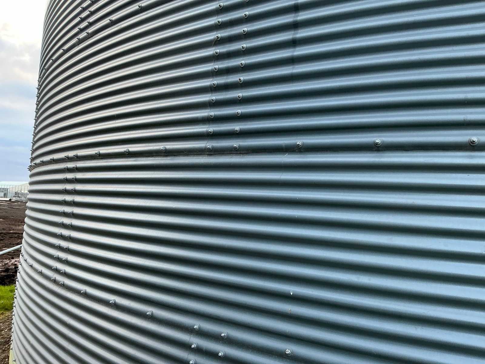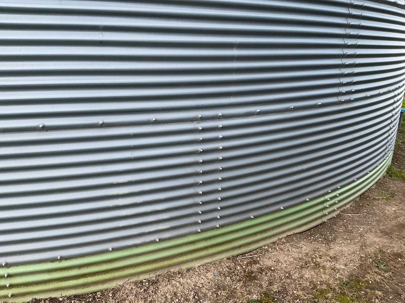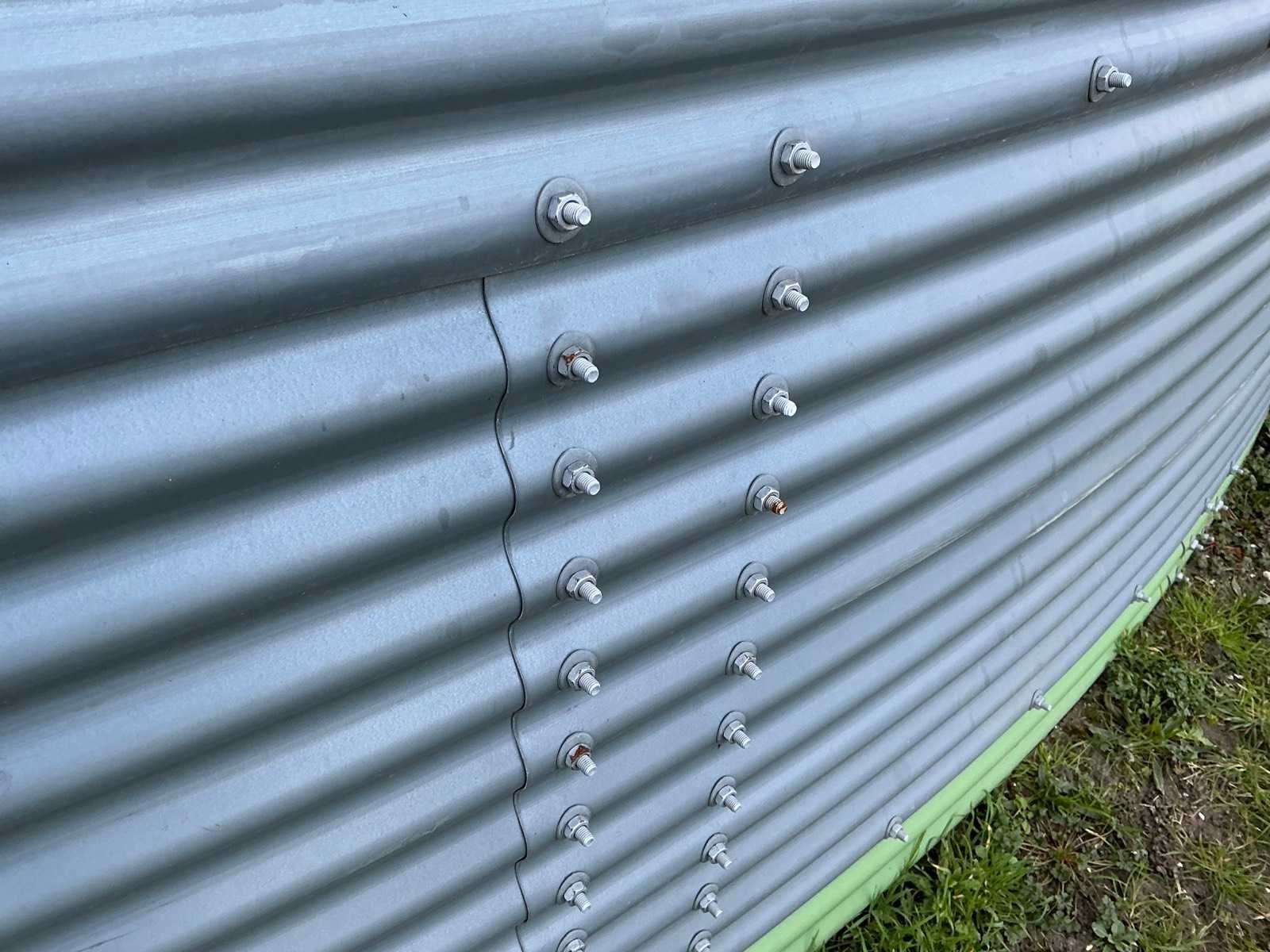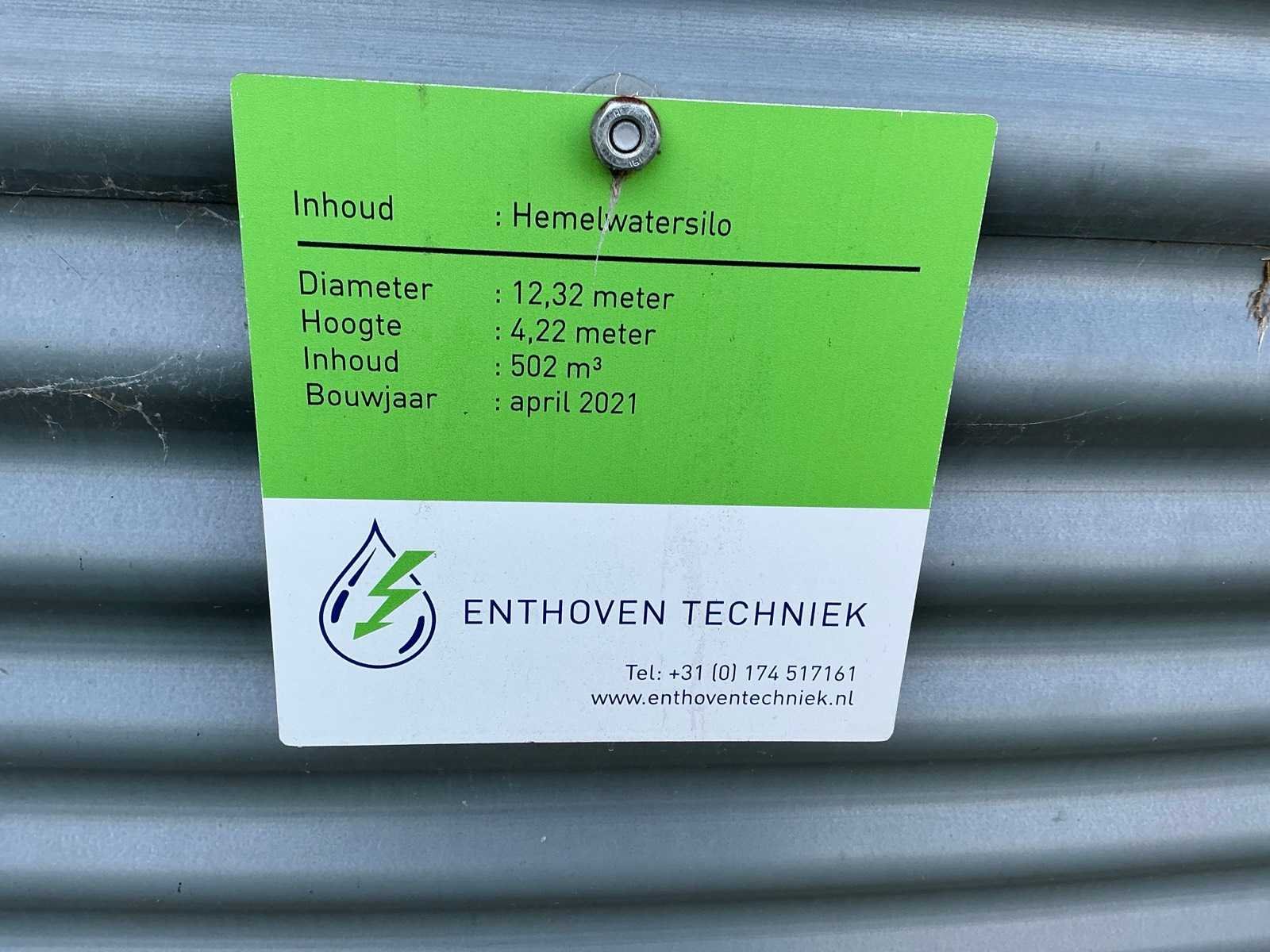Diameter 12320 mm; hoogte 4220 mm; Watersilo bestaande uit stalen platen; vilten binnenzijde; rubberen binnen zak; RVS ratels en vrijkomende bouten en moeren; wordt gedemonteerd en transport klaar gemaakt door verkoper; Verticaal: true