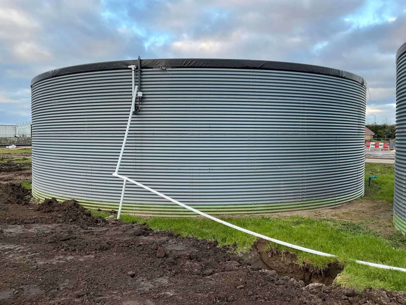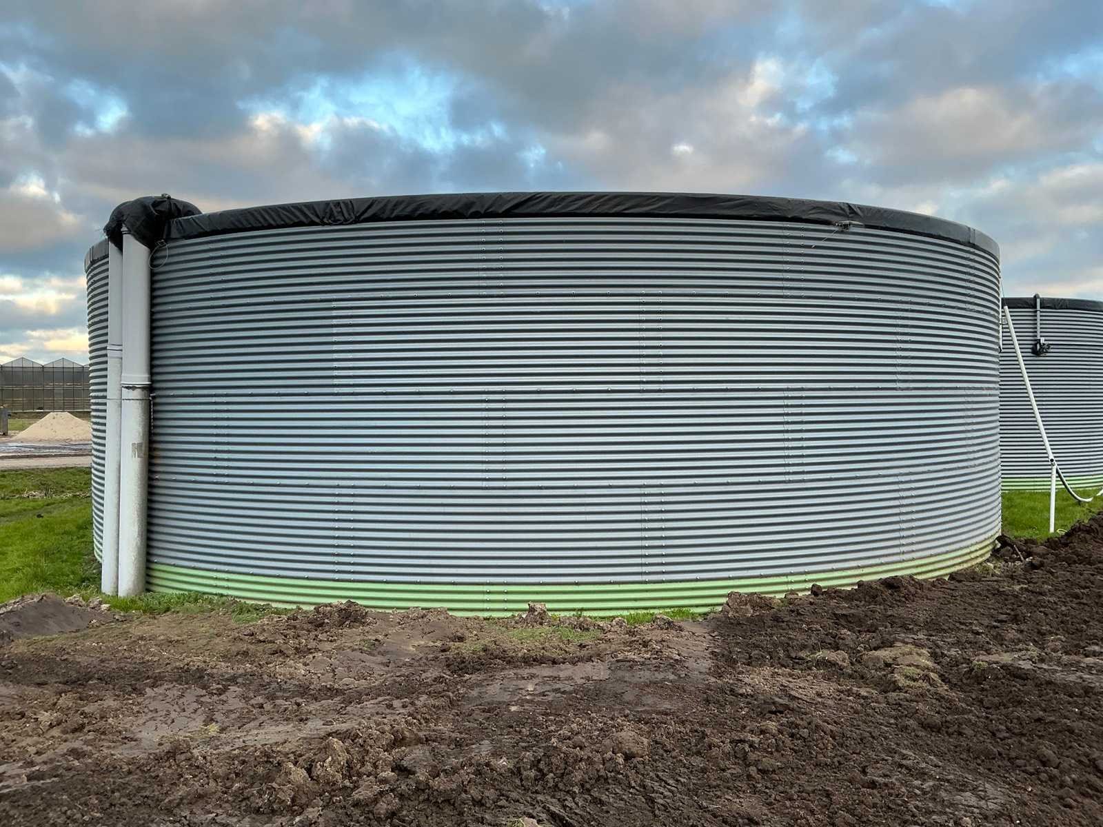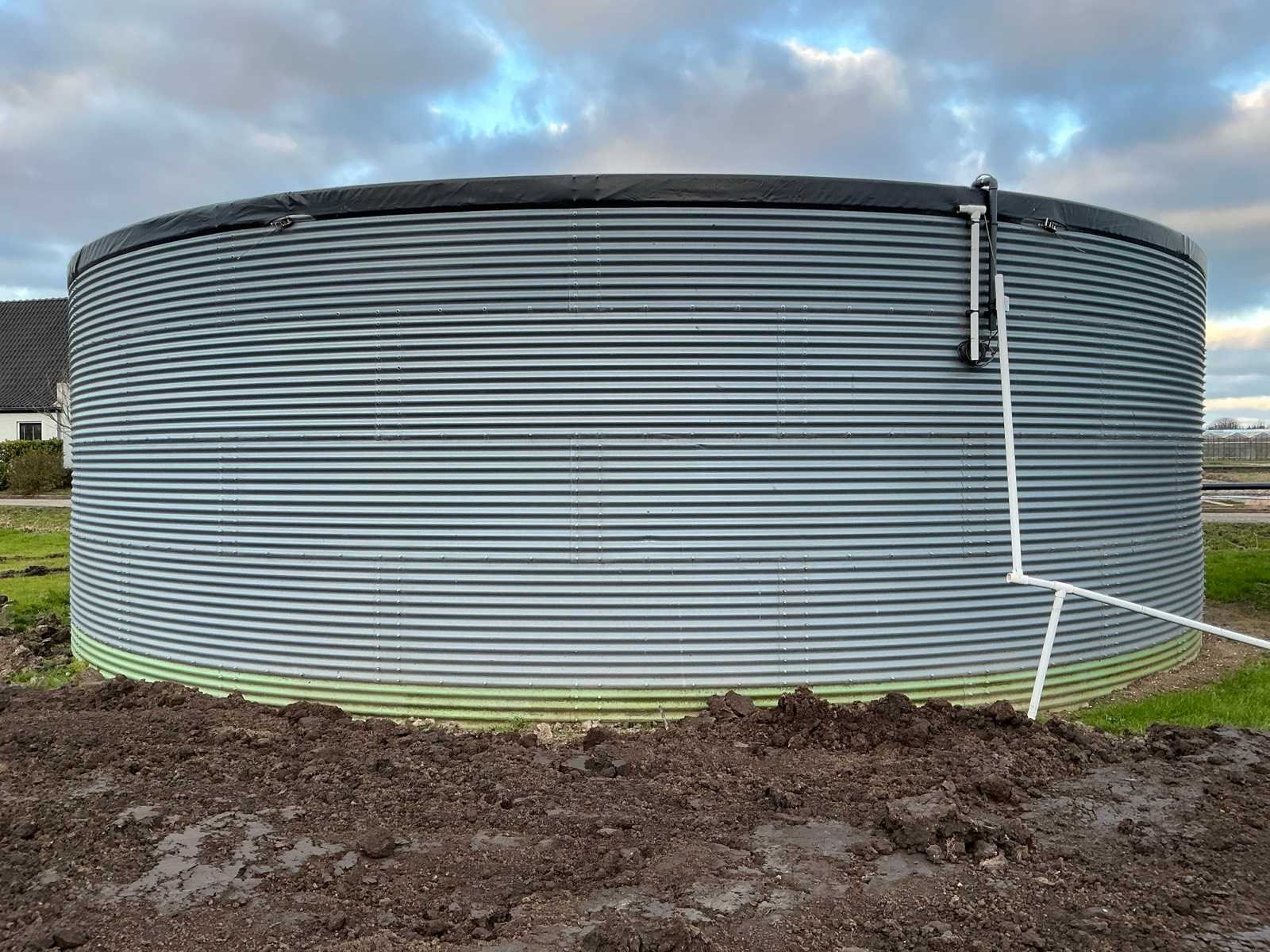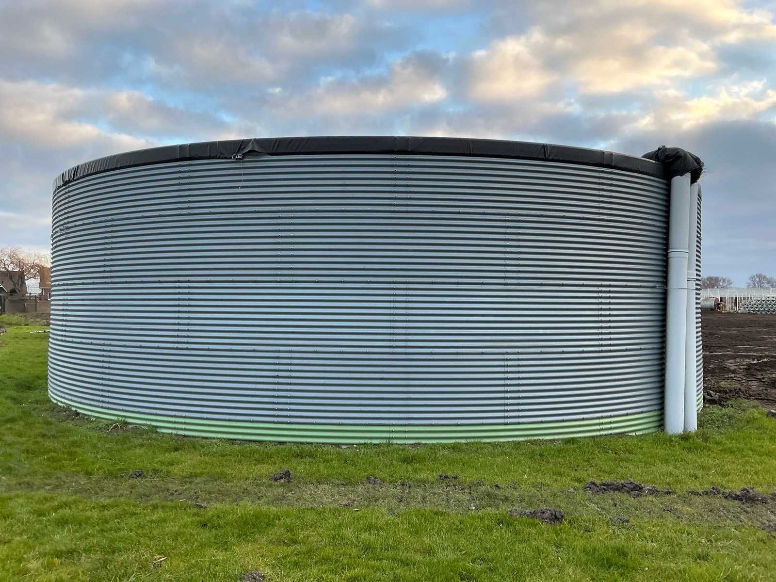 Diameter 12320 mm; hoogte 4220 mm; Watersilo bestaande uit stalen platen; vilten binnenzijde; rubberen binnen zak; RVS ratels en vrijkomende bouten en moeren; wordt gedemonteerd en transport klaar gemaakt door verkoper; Verticaal: true