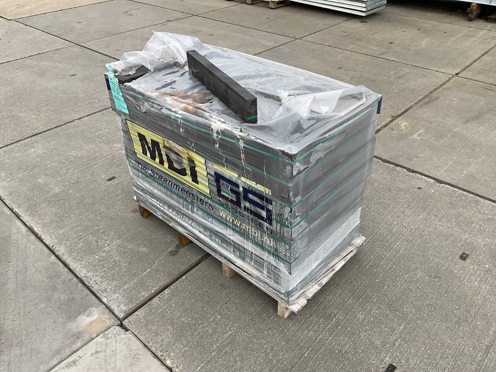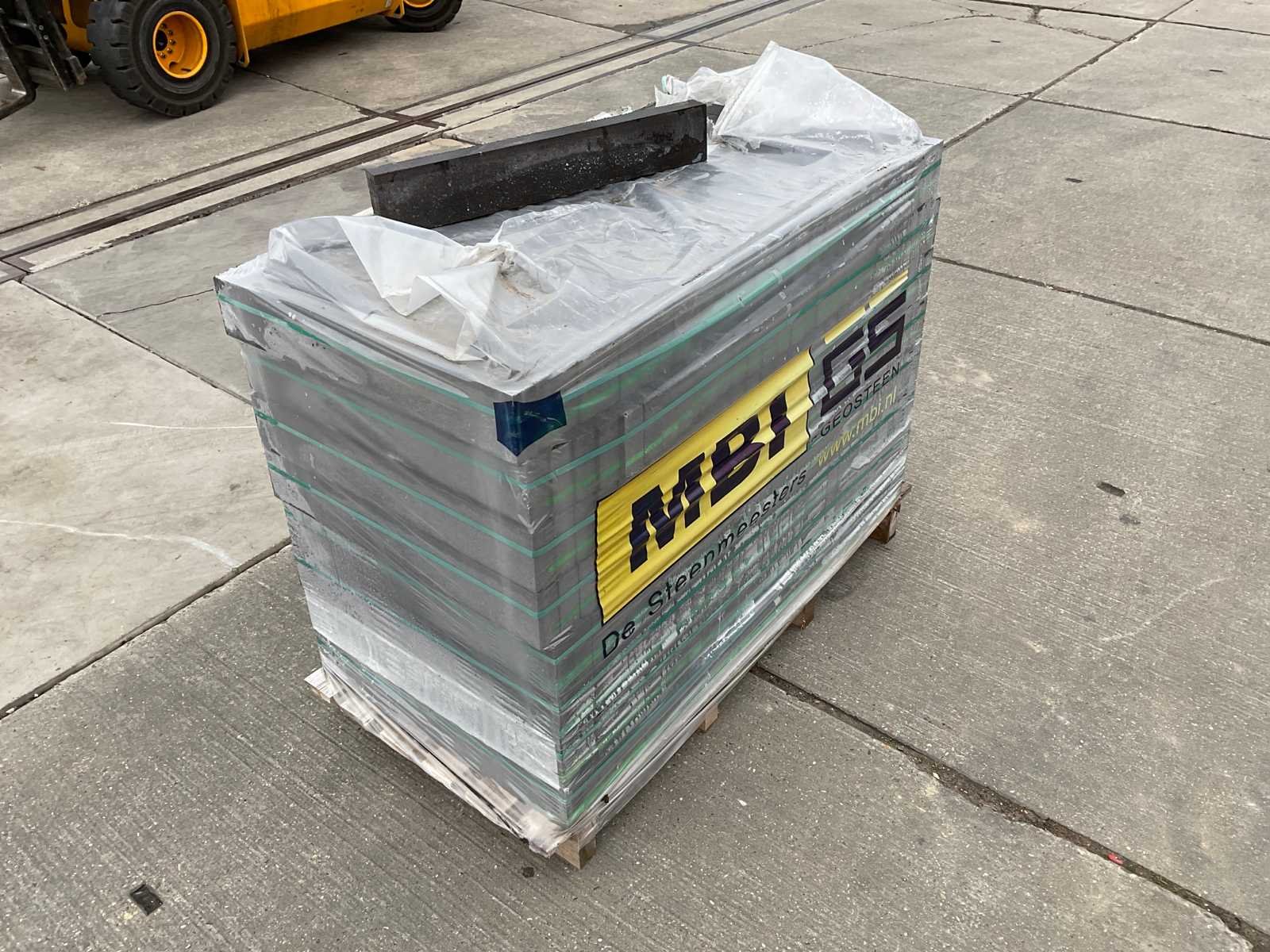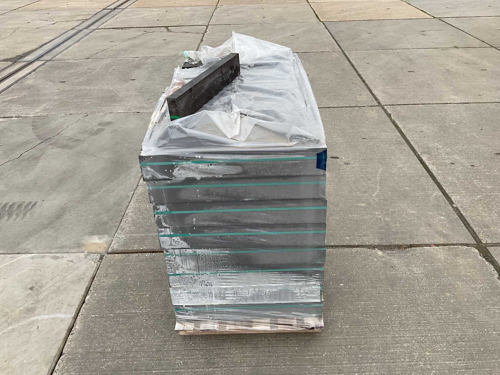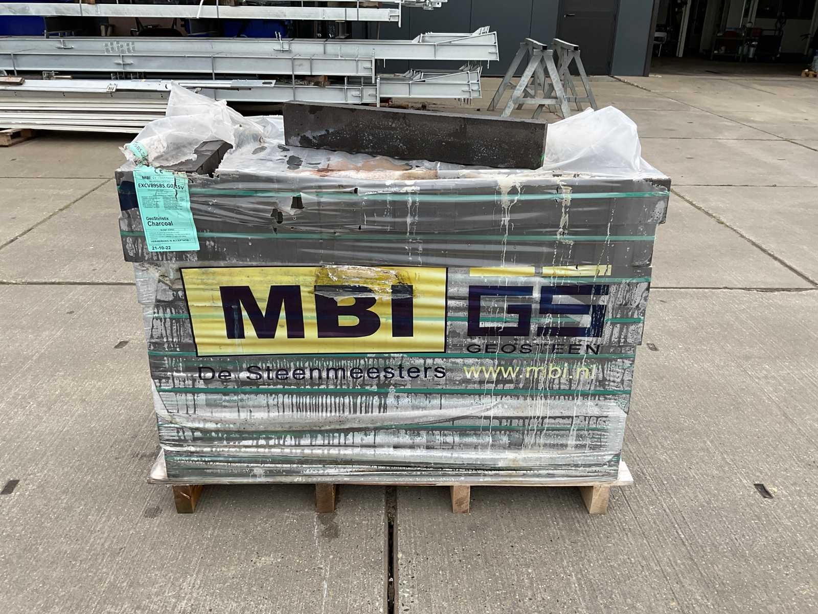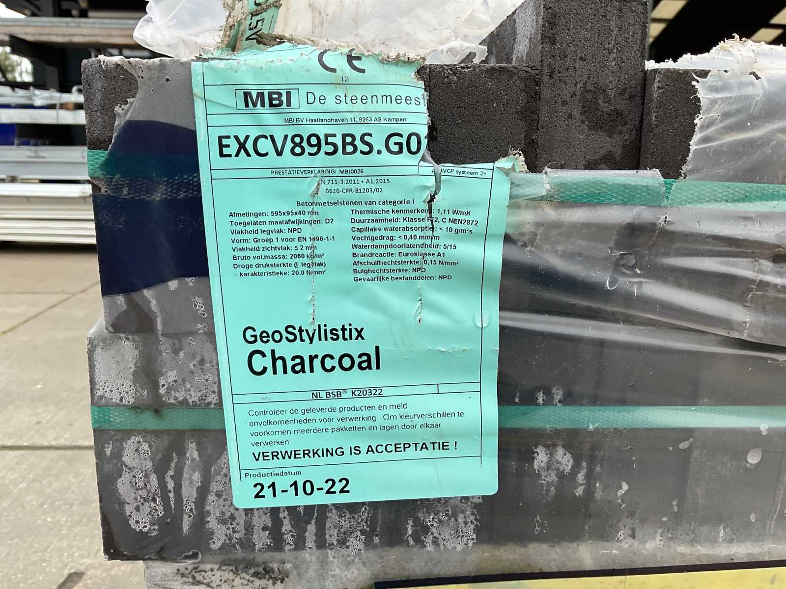 Pallet gevel steen; ongebruikt; afmetingen ca 595mm x 95mm x 40mm; aantal stuks op een pallet ca 224 stuks Merk: Mbi Model: Geostylistix charcoal Kleur: grijs