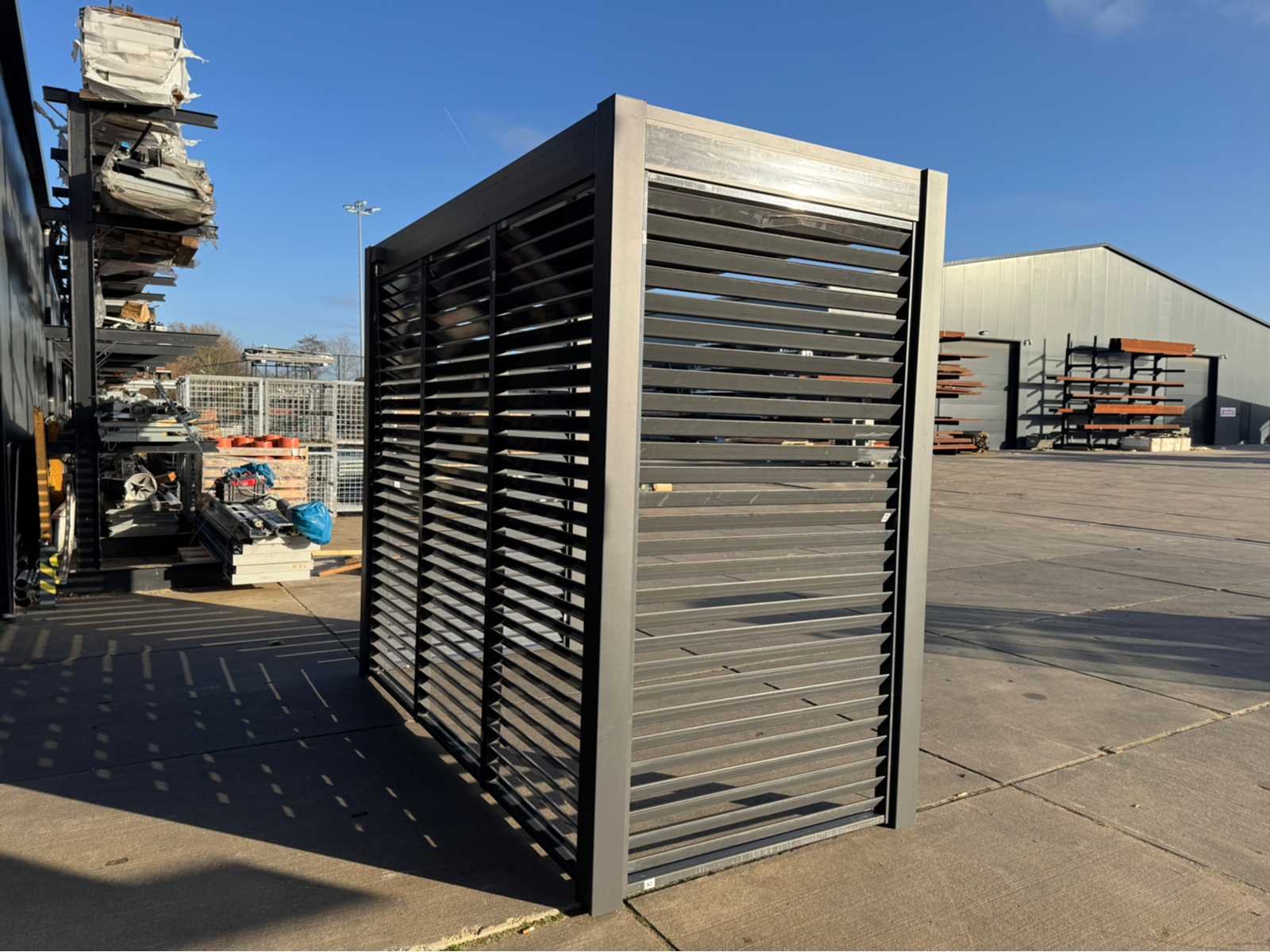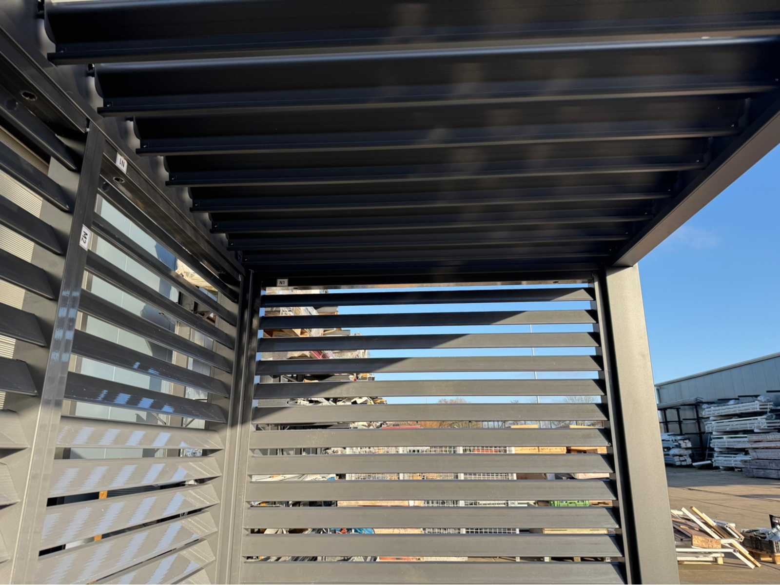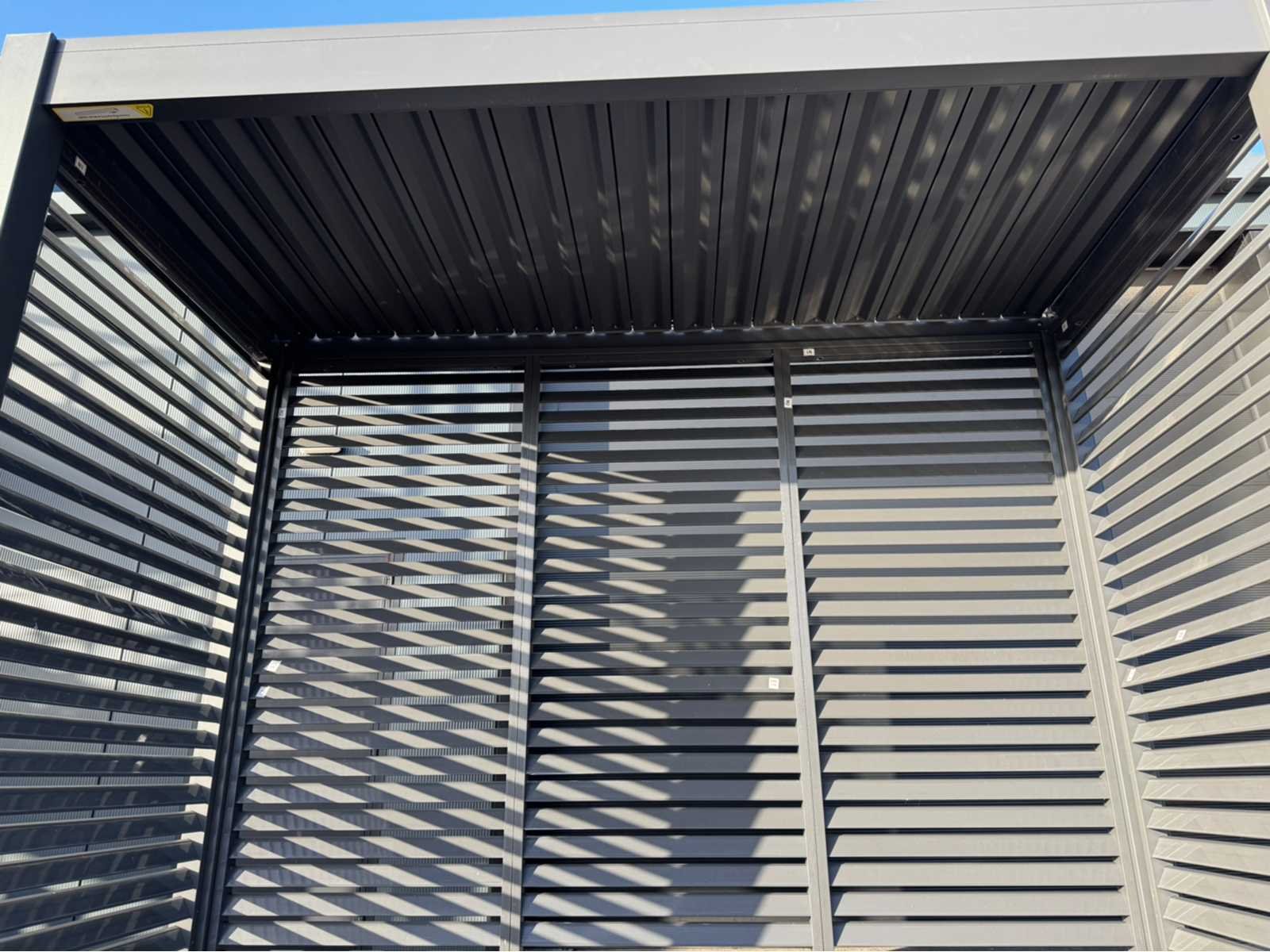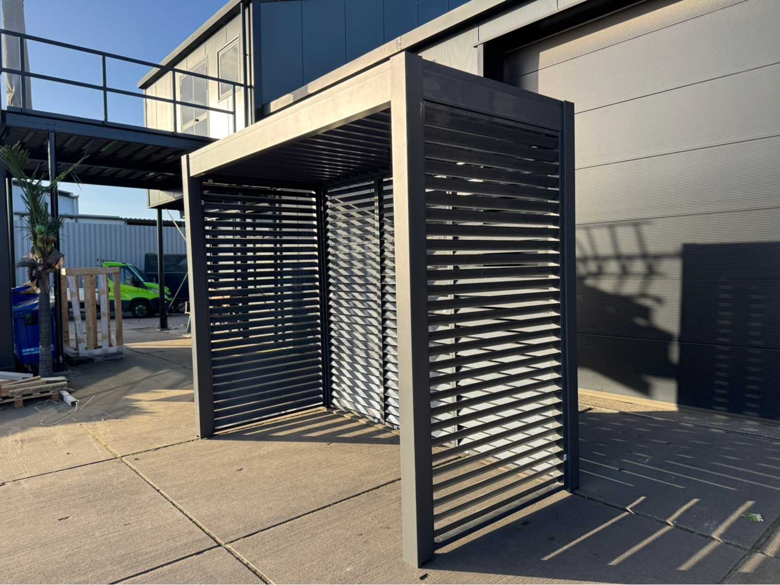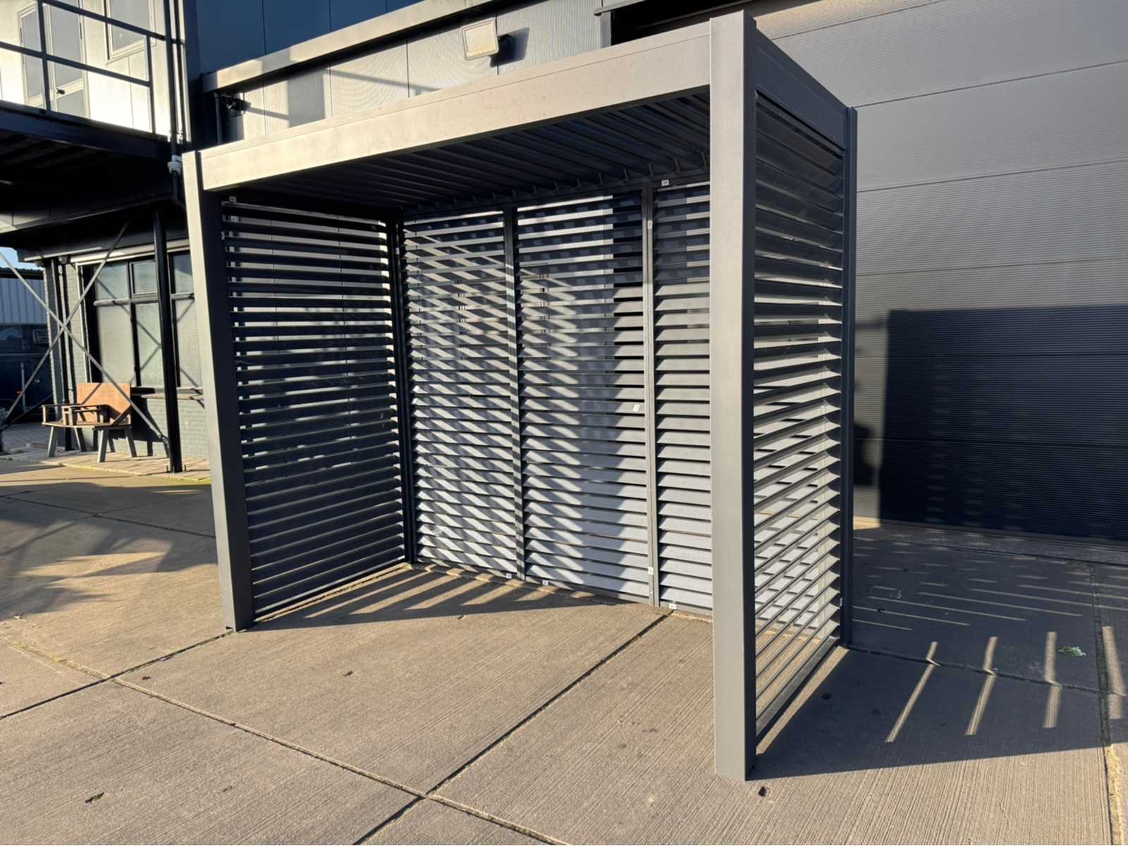 Ongebruikt; gedemonteerd geleverd in dozen; uiteraard inclusief al het benodigde klein materiaal zoals schroeven e.d; diepte is ca 1520mm; lamellen in het dak zijn open en dicht te doen dmv een handmatige slinger Lengte: 300cm Breedte: 152cm Hoogte: 255cm Materiaal: Aluminium