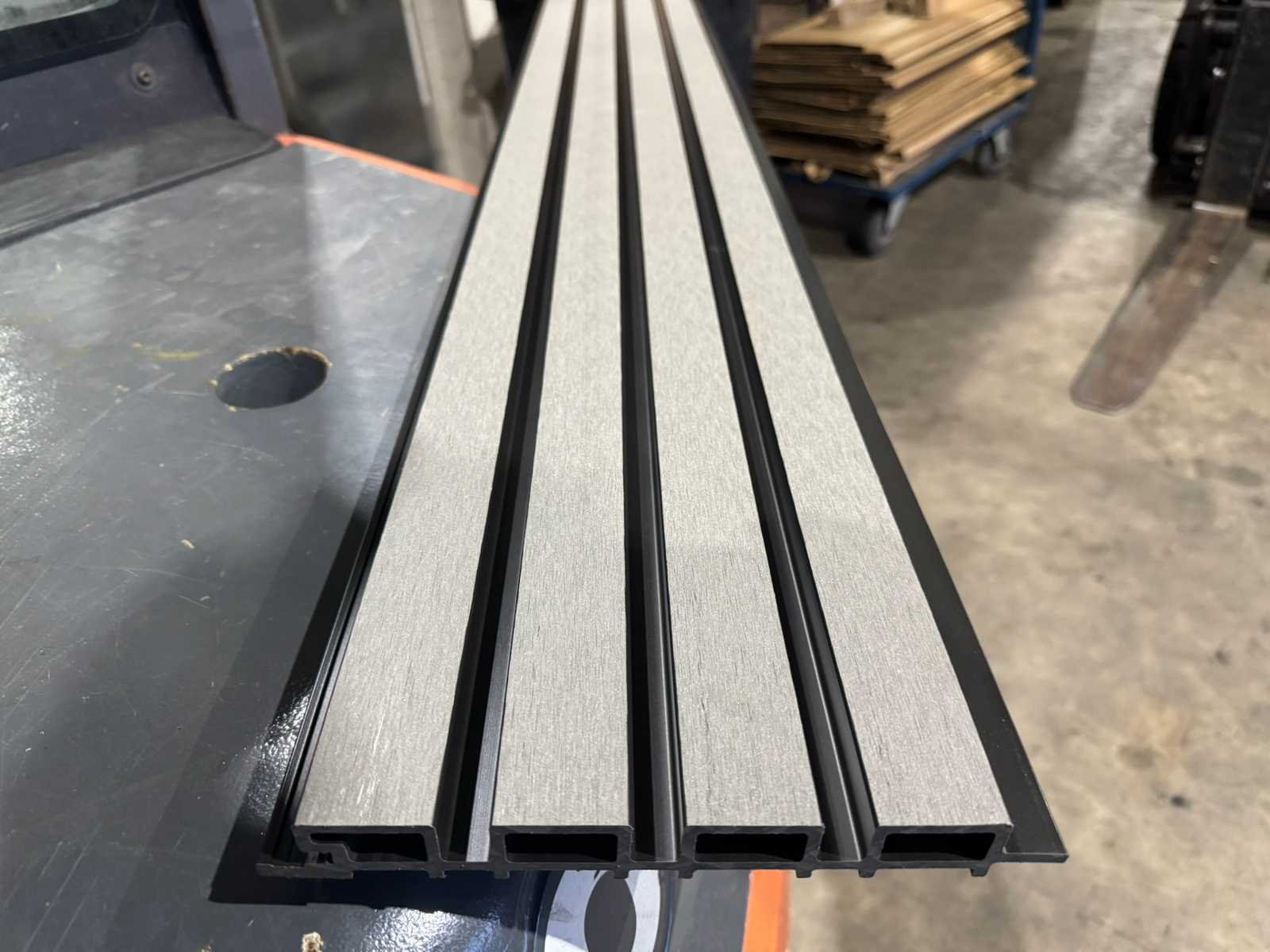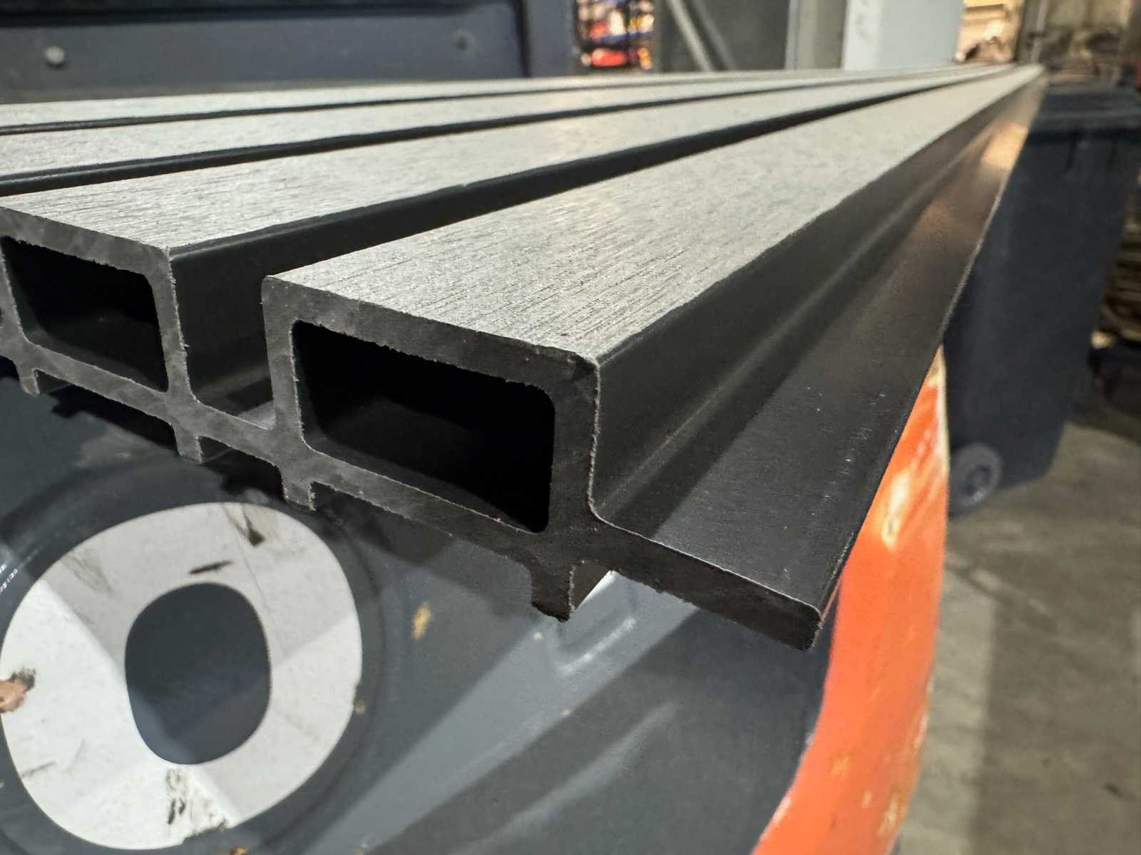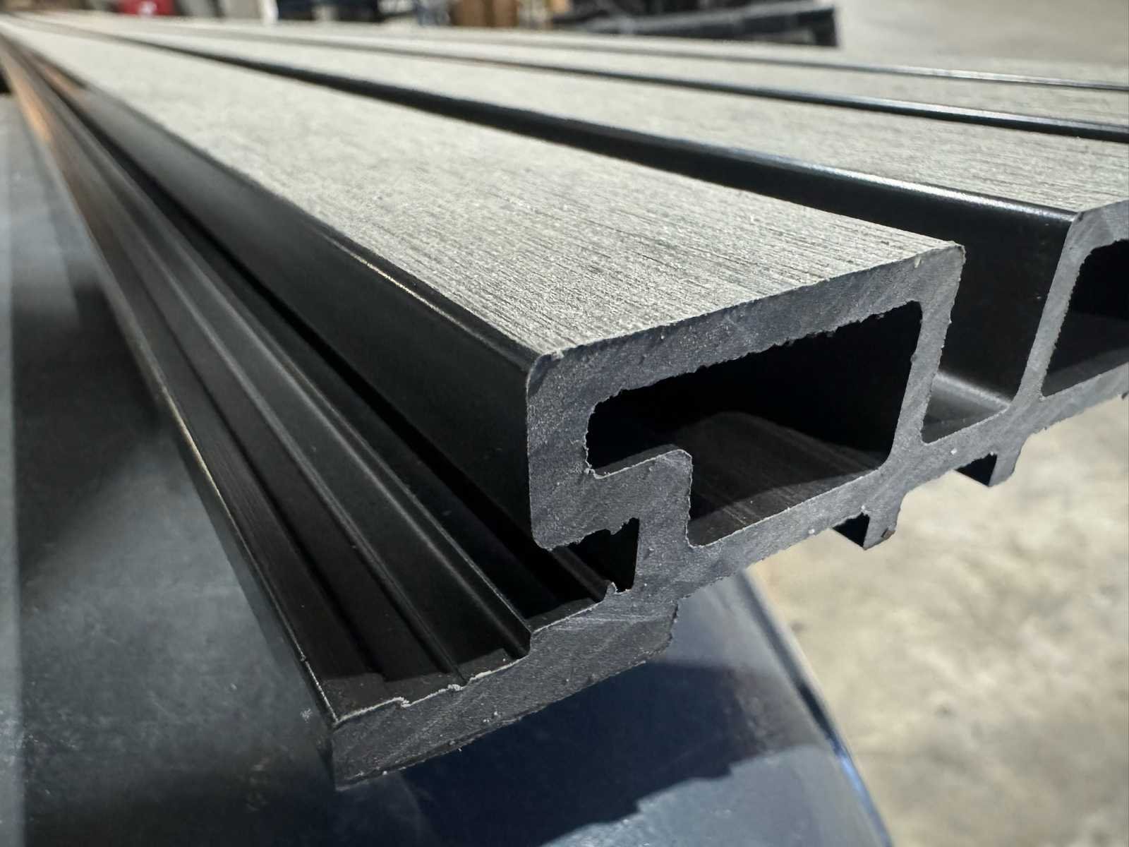 Lengte 2900 mm; breedte 219 mm; werkende breedte 200 mm; plank dikte 26 mm; kleur voorzijde geborsteld grijs; kleur tussen de voorzijdes is zwart; ongebruikte planken; gestapeld op 1 pallet; Materiaal: Composiet