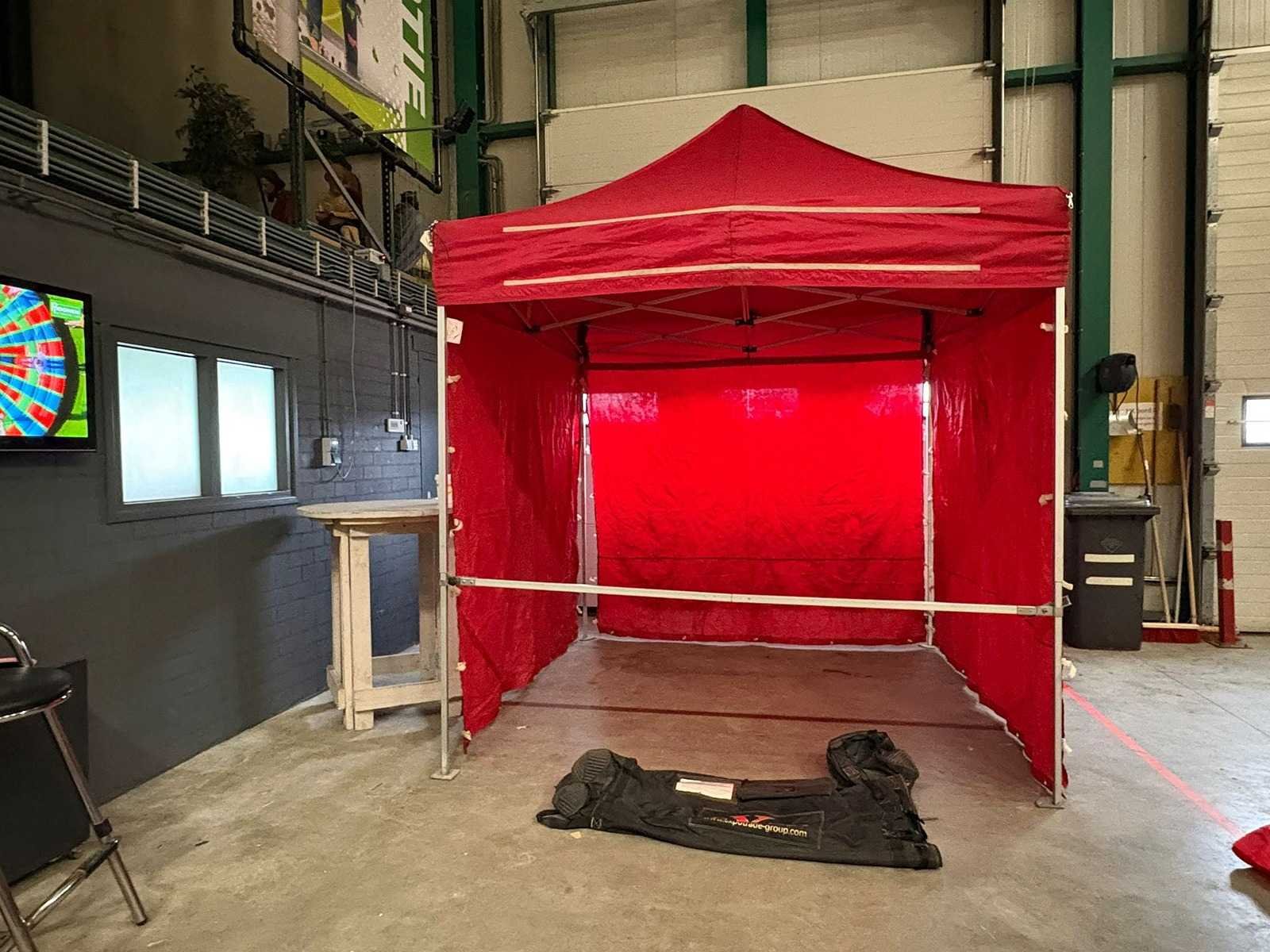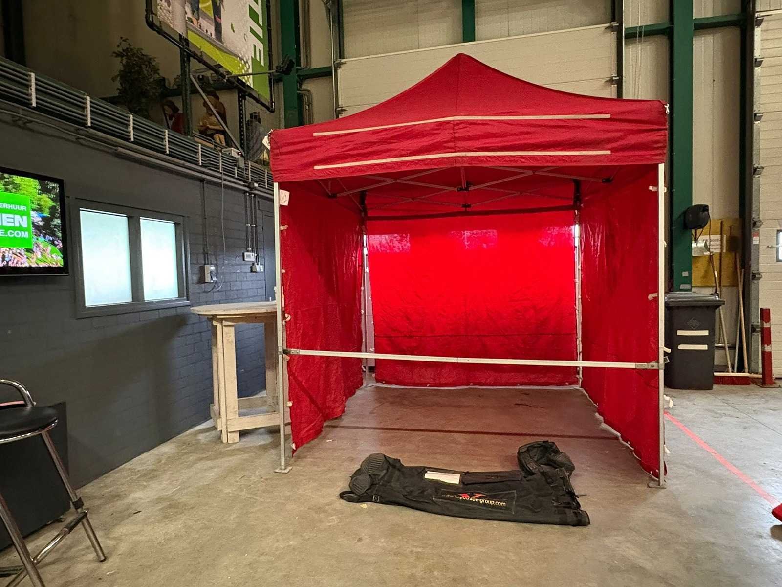 Stand - Promostand - Red Inclusief hoezen etc. Zie foto's. Kleur: Rood Lengte: 250cm Breedte: 250cm Hoogte: 330cm