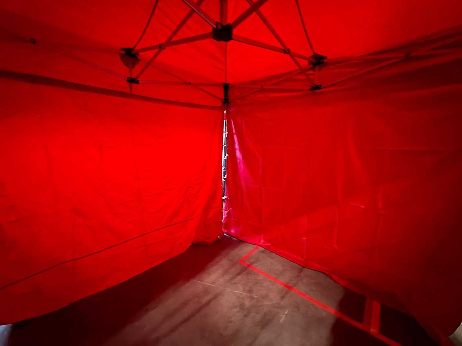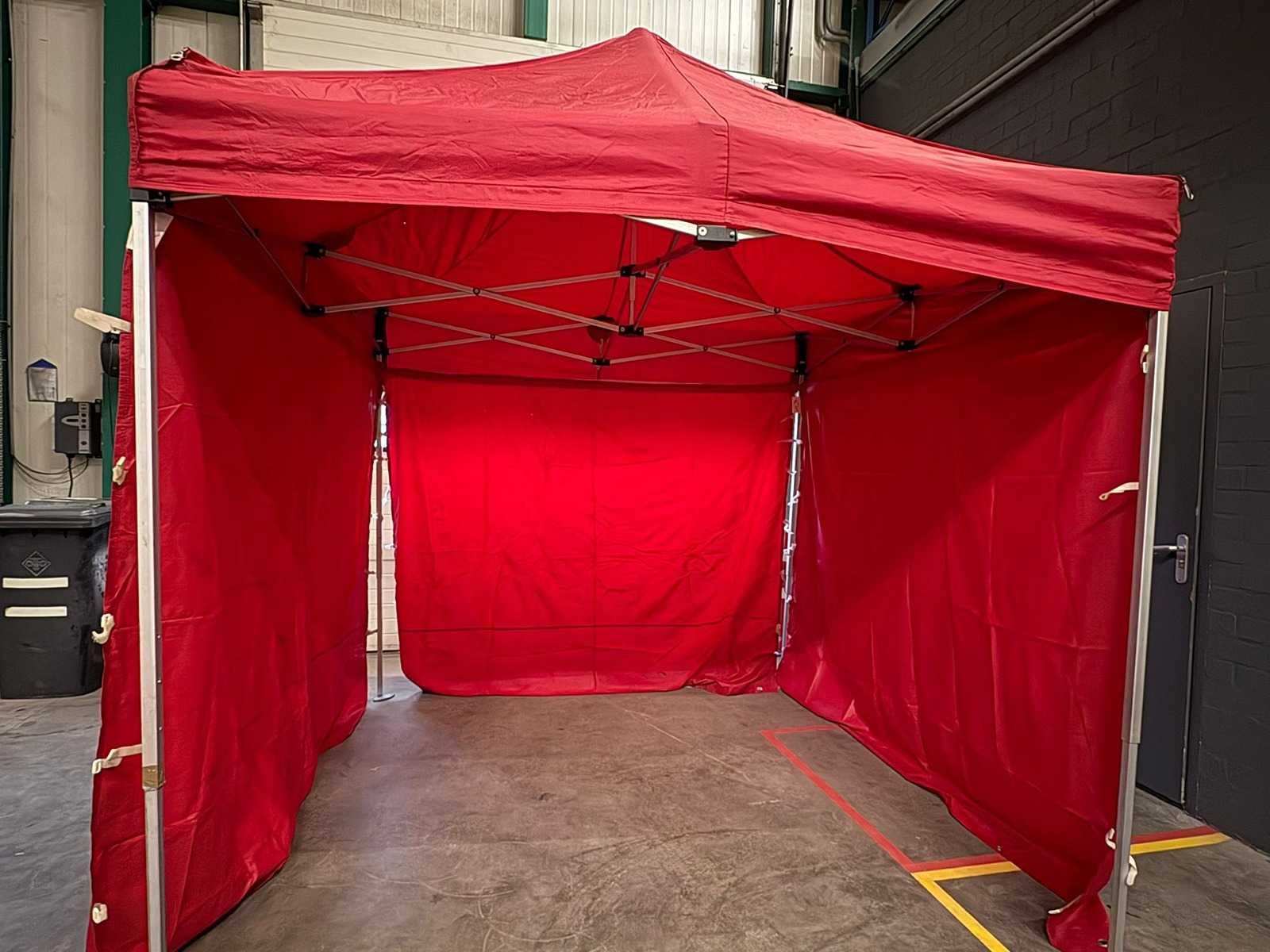 Stand - Promostand - Red Inclusief hoezen etc. Zie foto's. Kleur: Rood Lengte: 250cm Breedte: 250cm Hoogte: 330cm
