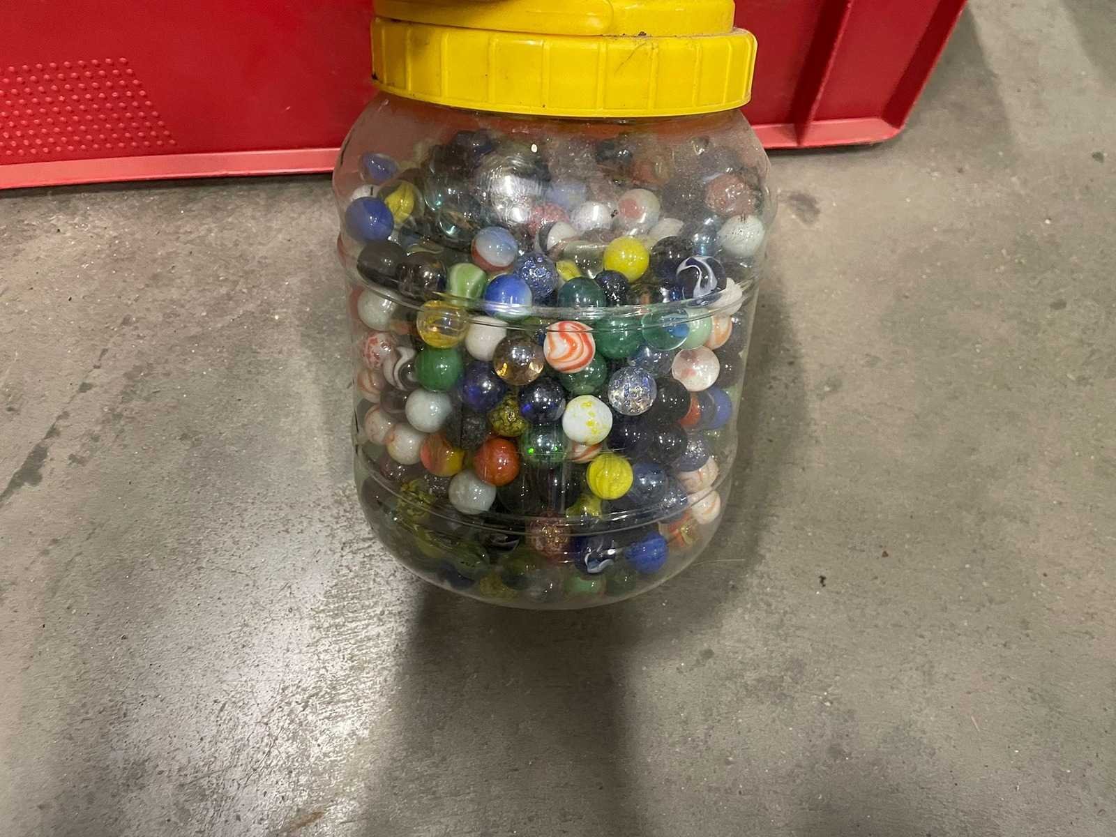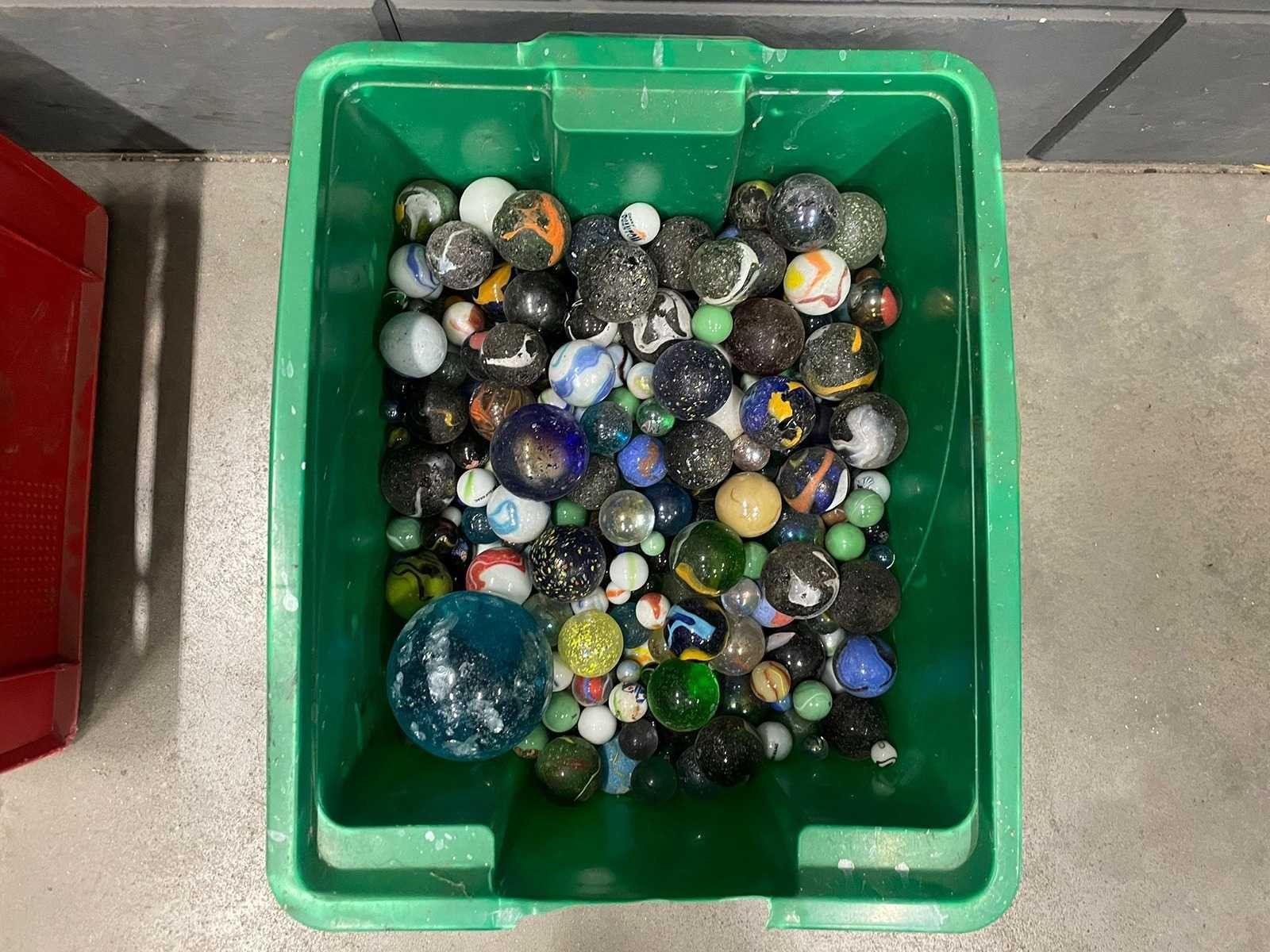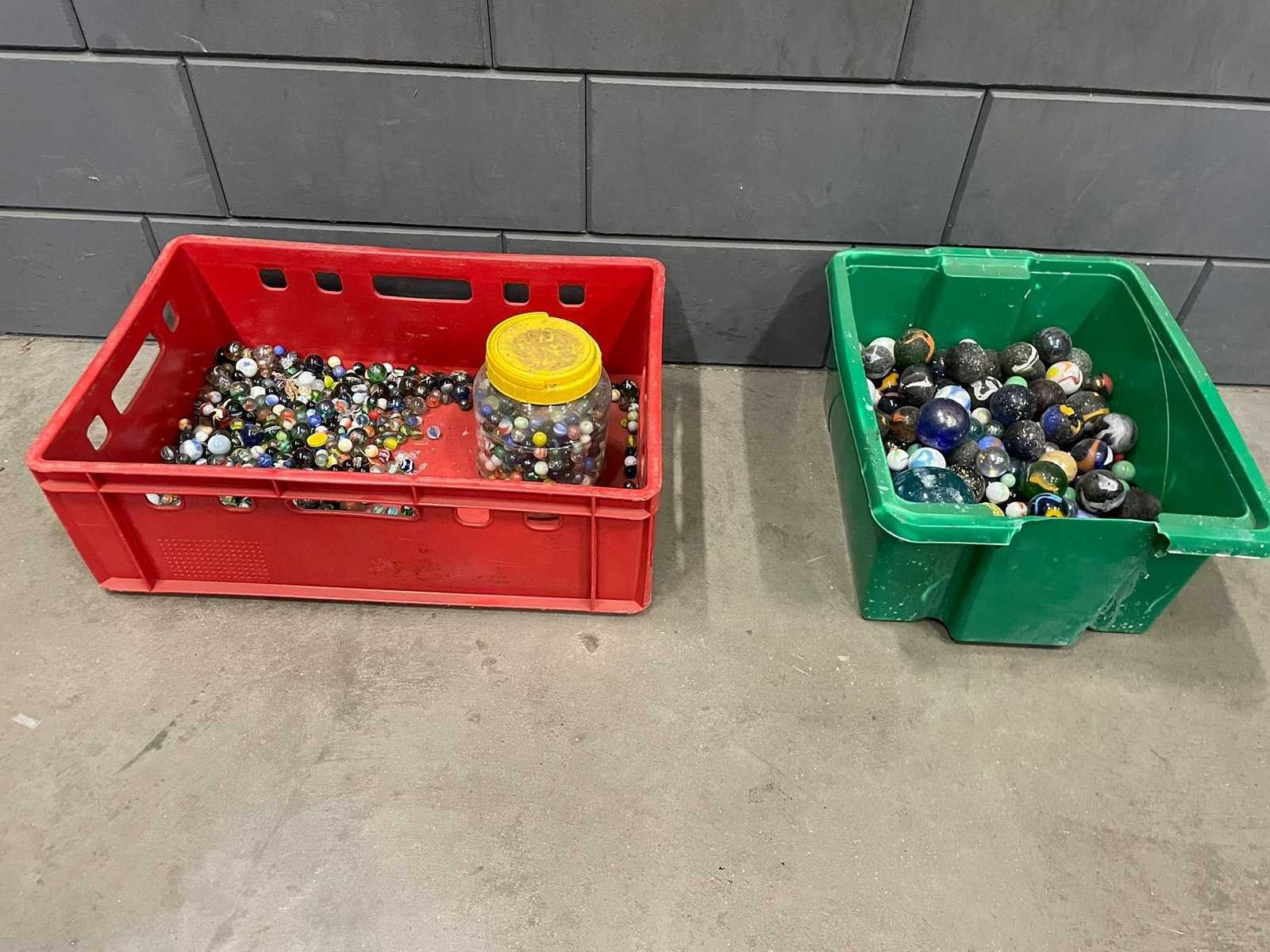 Diverse bakken met verschillende maten knikkers. Verkoop inclusief bakken/potten.