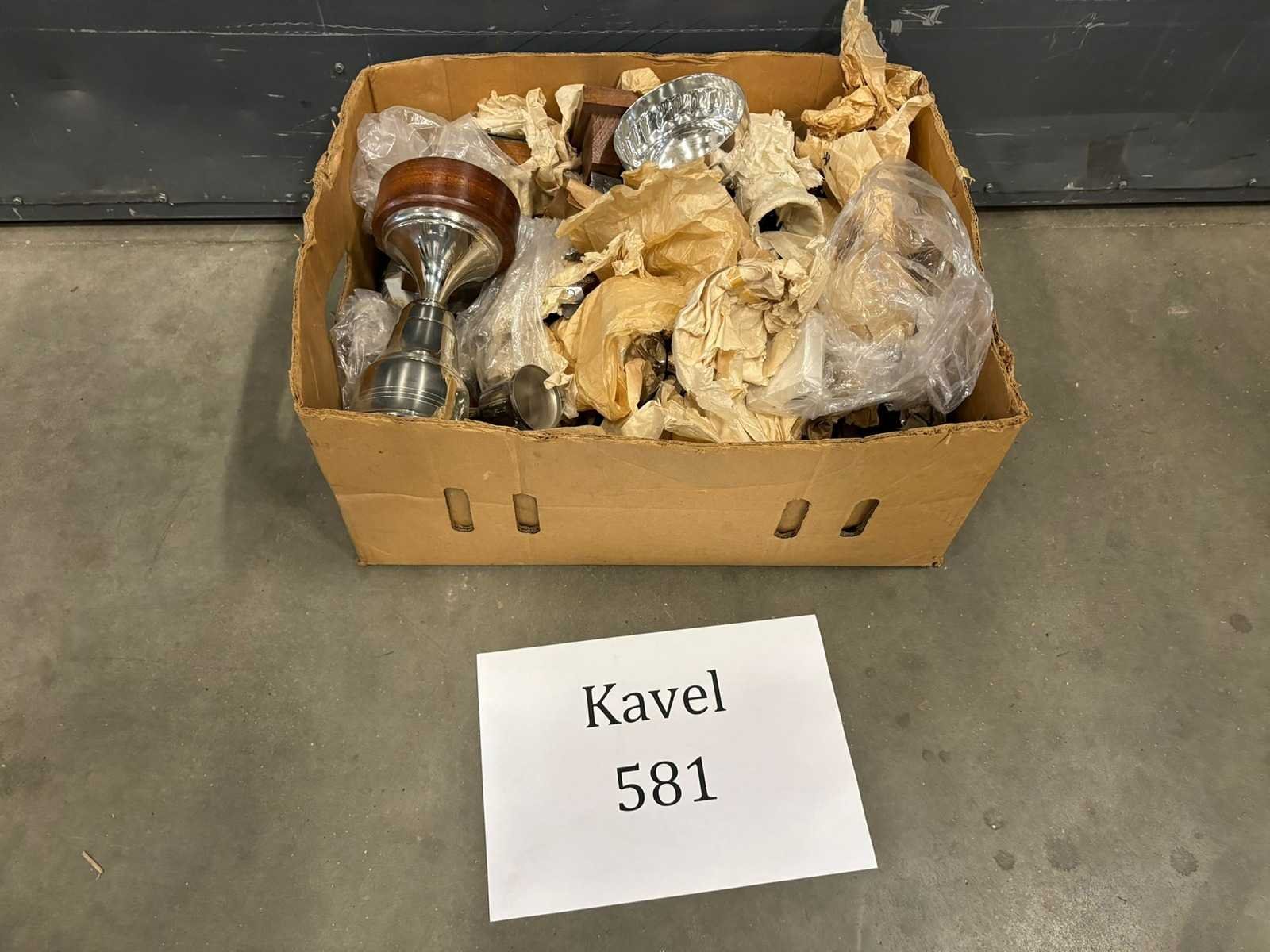 Doos vol verschillende soorten trofeeën Lengte: 43cm Breedte: 53cm Hoogte: 24cm
