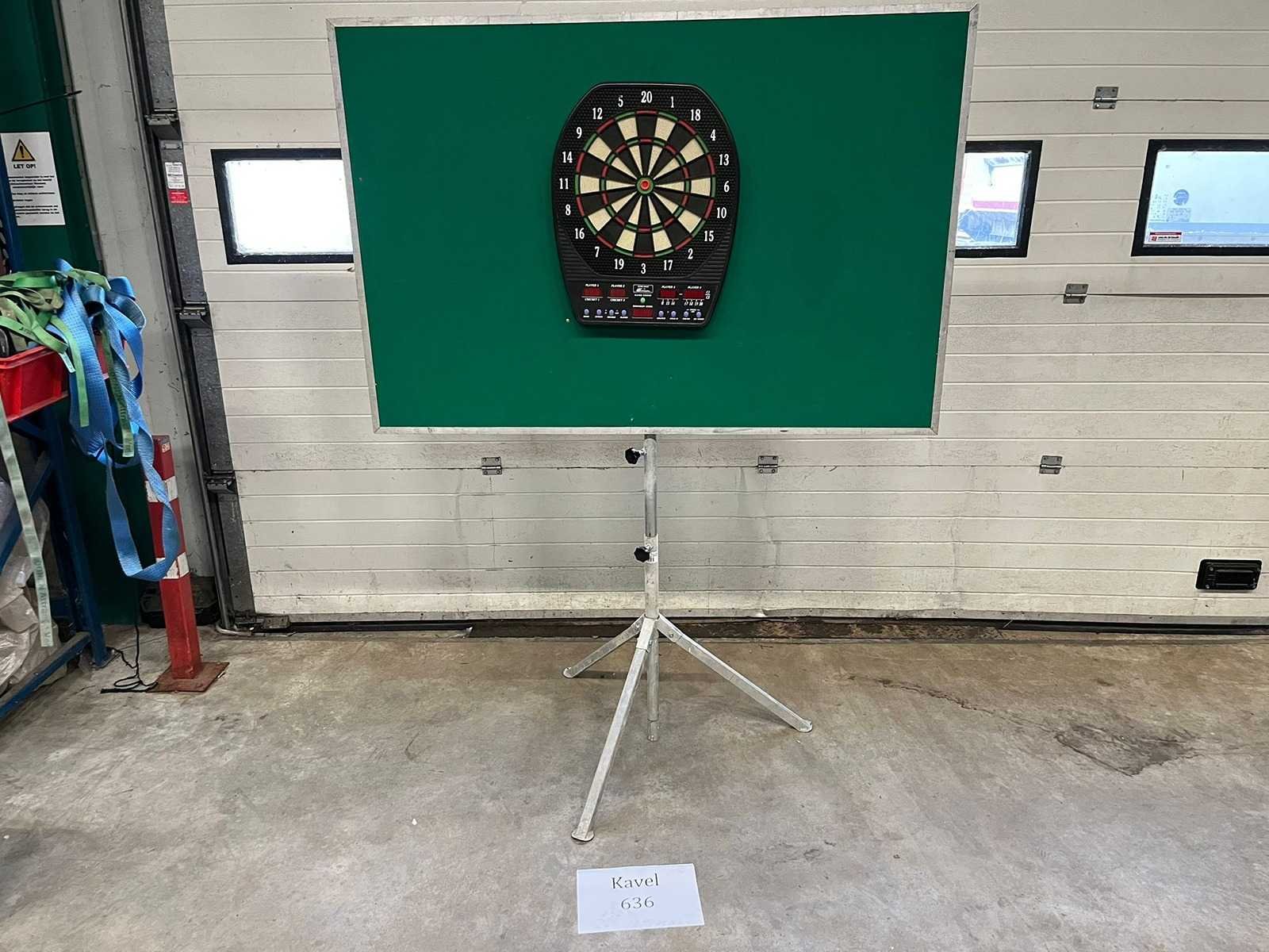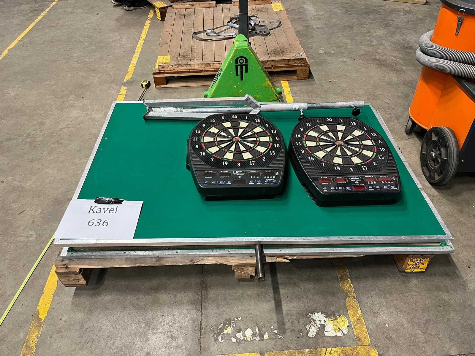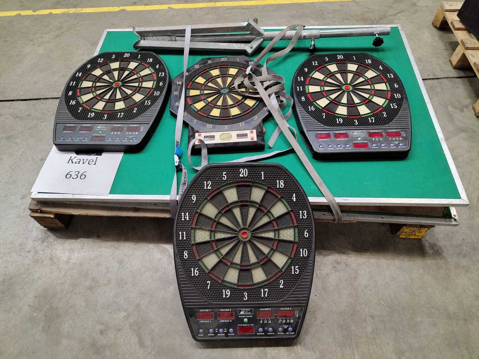 4x dartbord electronisch 2x groen achterpaneel 1x standaard 1x rode bak met pijltjes en onderdelen. Verkoop exclusief pallet en spanbanden. Lengte: 5cm Breedte: 50cm Hoogte: 60cm