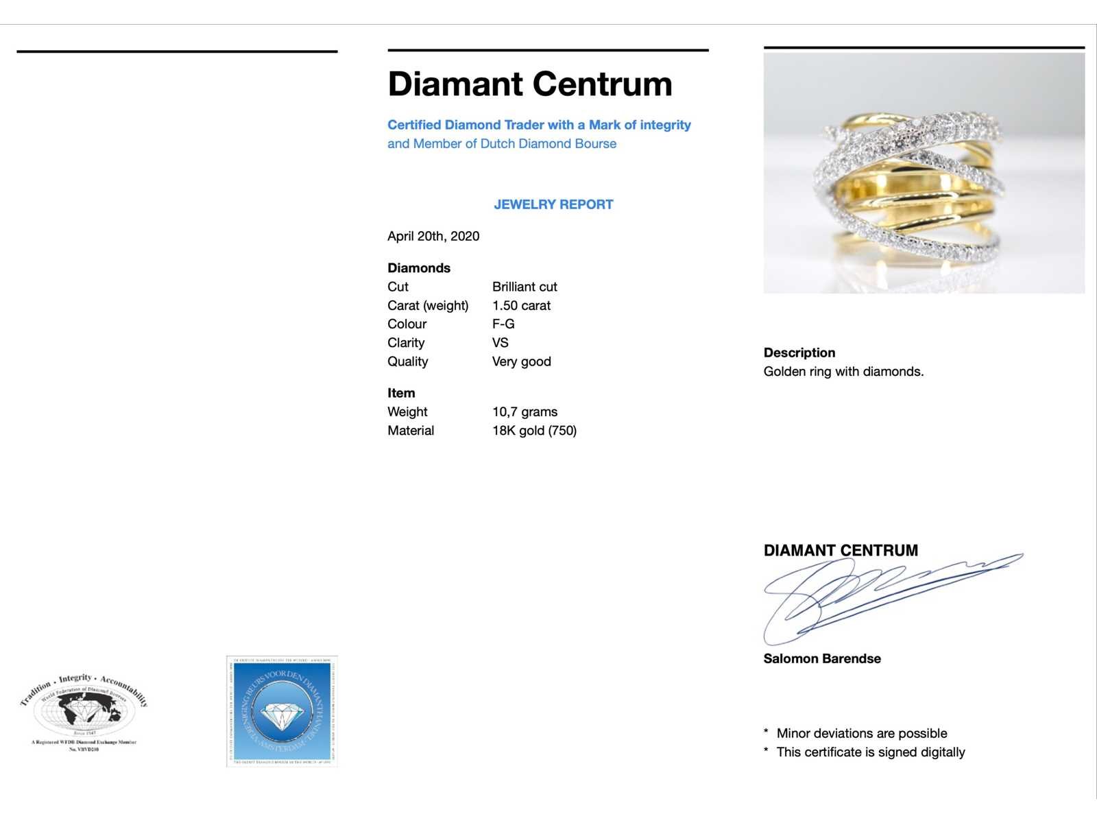 Samenvatting van gegevens Gouden design ring met diamanten Diamant: Natuurlijk; Slijpvorm: Briljant geslepen; Gewicht (carat): 1.50 carat; Kleur: F-G; Zuiverheid: VS; Slijpkwaliteit: Zeer mooi; Juweel: Ring; Gewicht: 10.7 gram; Ringmaat (op maat gemaakt*): 53 (17 mm); Materiaal: 18K goud (750); Conditie: Nieuw; Verpakking: Luxe sieradendoos; Toelichting: De kwaliteit is overgenomen van het rapport behorend bij item. De waardebepaling is een beoordeling van een gecertificeerde diamantair, gebaseerd op consumentenprijzen.; Consumentenprijs: € 10.780,- Within 14 days Materiaal: Goud Voornaamste diamant: Natuurlijk Gewicht diamant: 1.50ct Totaal gewicht: 10.7g Keurmerk: 750 Lage schatting: 8624€ Hoge schatting: 10780€ Kleur diamant: F-G Slijpvorm diamant: Briljant geslepen Slijpkwaliteit diamant: Zeer mooi Zuiverheidsgraad diamant: VS
