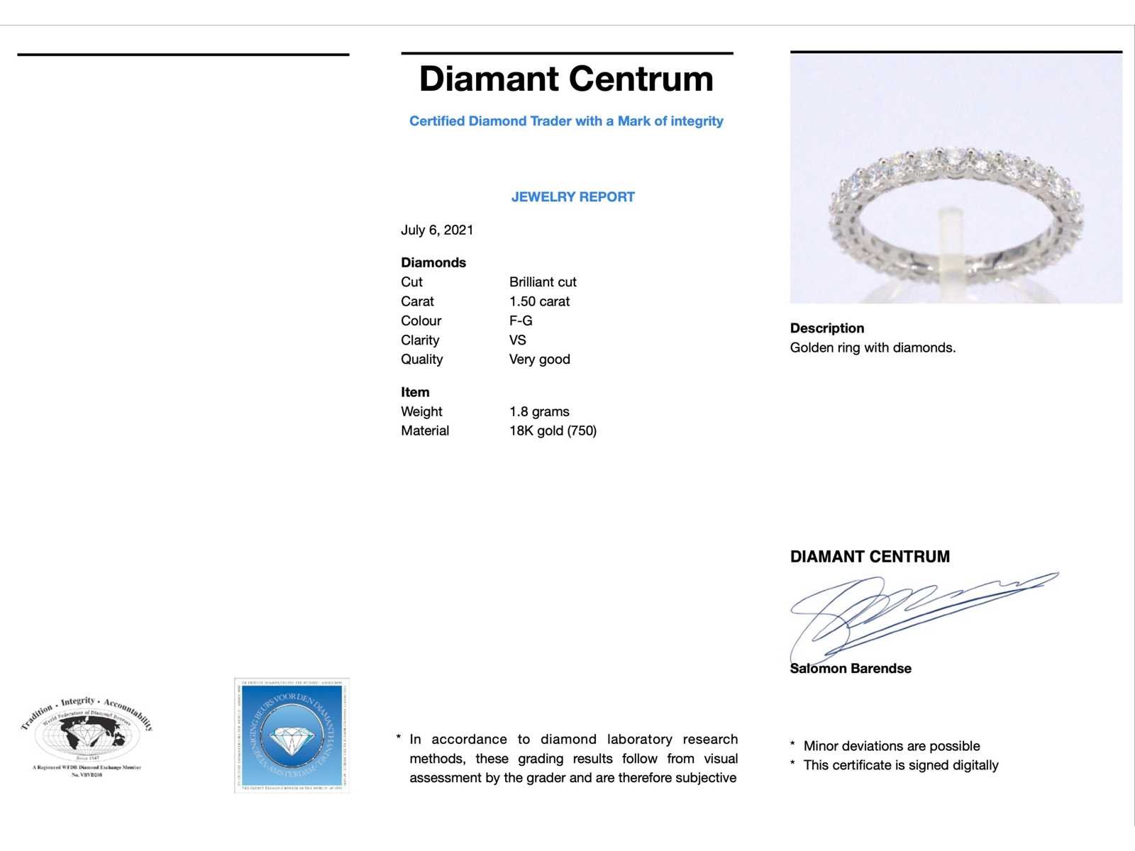 Samenvatting van gegevens Witgouden alliance ring met briljant geslepen diamant Diamant: Natuurlijk; Slijpvorm: Briljant geslepen; Gewicht (carat): 1.50 carat; Kleur: F-G; Zuiverheid: VS; Slijpkwaliteit: Zeer mooi; Juweel: Ring; Gewicht: 1.8 gram; Ringmaat (op maat gemaakt*): 52-53 (16.5 mm); Materiaal: 18K goud (750); Conditie: Nieuw; Verpakking: Luxe sieradendoos; Toelichting: De kwaliteit is overgenomen van het rapport behorend bij item. De waardebepaling is een beoordeling van een gecertificeerde diamantair, gebaseerd op consumentenprijzen.; Consumentenprijs: € 7.823,- Within 14 days Materiaal: Goud Voornaamste diamant: Natuurlijk Gewicht diamant: 1.50ct Totaal gewicht: 1.8g Keurmerk: 750 Lage schatting: 6258.400000000001€ Hoge schatting: 7823€ Kleur diamant: F-G Slijpvorm diamant: Briljant geslepen Slijpkwaliteit diamant: Zeer mooi Zuiverheidsgraad diamant: VS