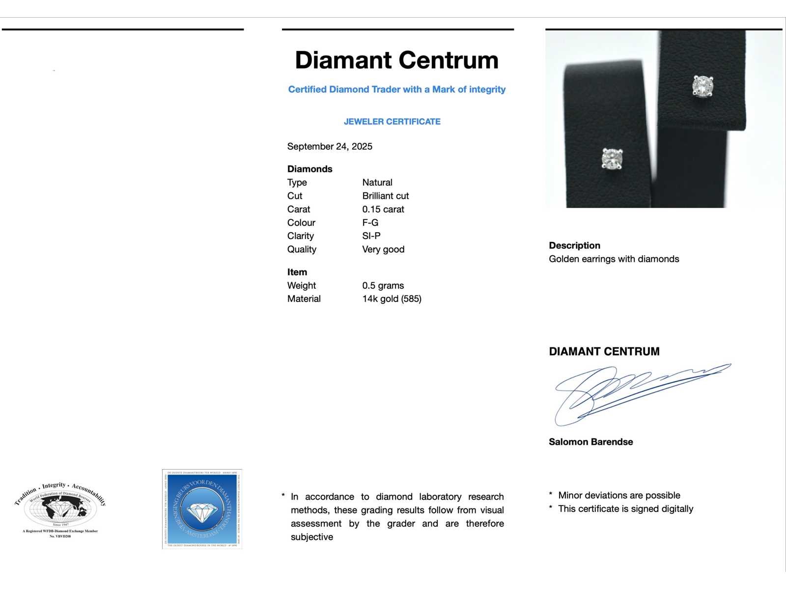Samenvatting van gegevens Witgouden oorbellen met diamant Diamant: Natuurlijk; Aantal: 2 stuks; Slijpvorm: Briljant geslepen; Gewicht (carat): 0.15 carat; Kleur: F-G; Zuiverheid: SI-P; Slijpkwaliteit: Zeer mooi; Juweel: Oorbellen; Gewicht: 0.5 gram; Materiaal: 14 karaat (585); Conditie: Nieuw; Verpakking: Luxe sieradendoos; Toelichting: De kwaliteit is overgenomen van het rapport behorend bij item. De waardebepaling is een beoordeling van een gecertificeerde diamantair, gebaseerd op consumentenprijzen.; Consumentenprijs: € 840,- Within 14 days Voornaamste diamant: Natuurlijk Kleur diamant: F-G Gewicht diamant: 0.15ct Slijpvorm diamant: Briljant geslepen Slijpkwaliteit diamant: Zeer mooi Zuiverheidsgraad diamant: SI-P Totaal gewicht: 0.5g Keurmerk: 585 Lage schatting: 672€ Hoge schatting: 840€