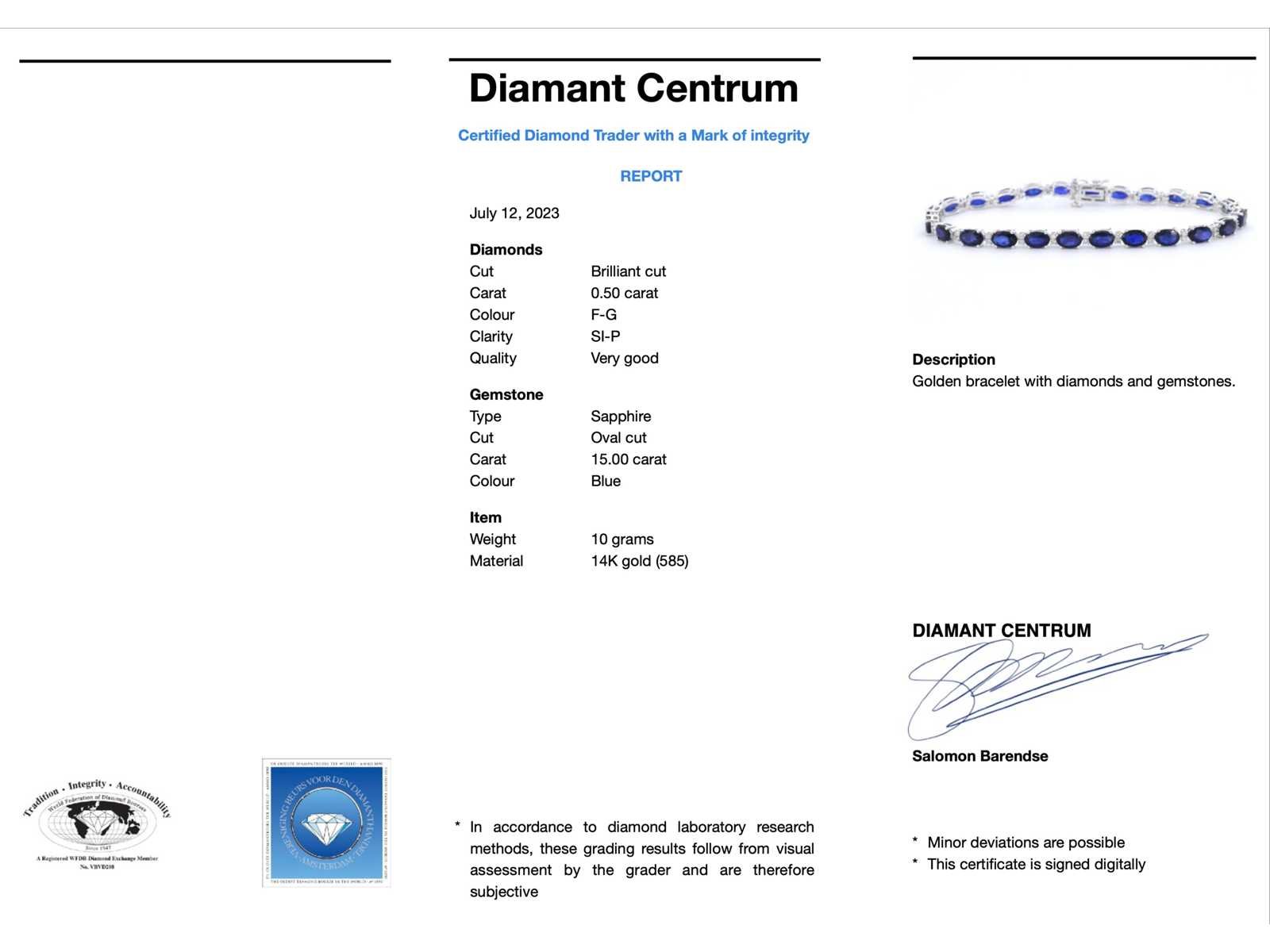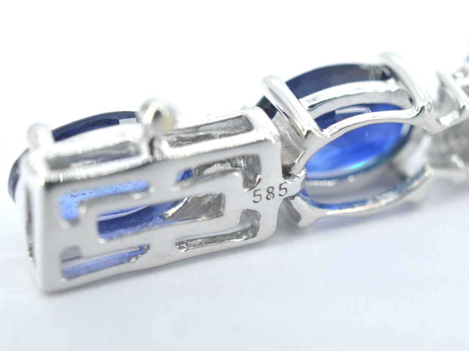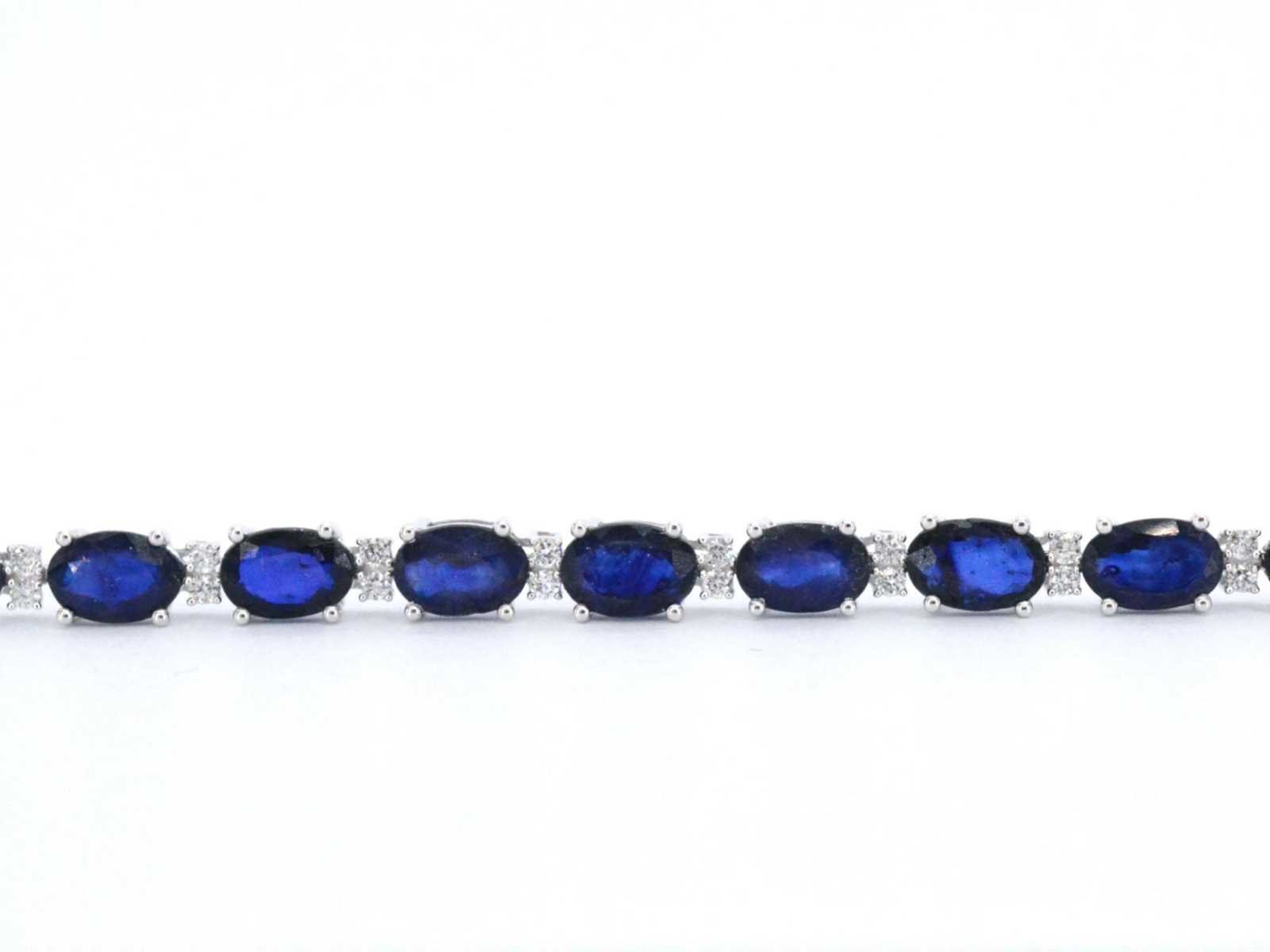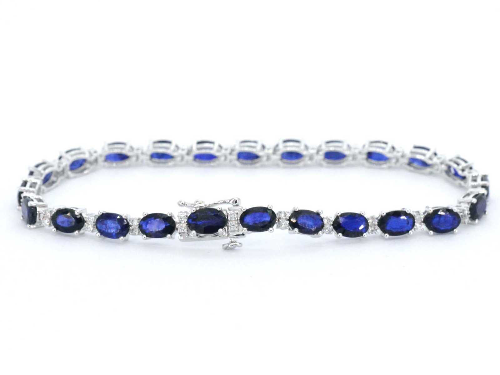 Samenvatting van gegevens Witgouden tennisarmband met diamanten en saffier Diamant: Natuurlijk; Slijpvorm: Briljant geslepen; Gewicht (carat): 0.50 carat; Kleur: F-G; Zuiverheid: SI-P; Slijpkwaliteit: Zeer mooi; Edelsteen: Saffier; Slijpvorm: Ovaal; Gewicht (carat): 15.00 carat; Kleur: saffier; Zuiverheid: Met natuurlijke insluitsels; Slijpkwaliteit: Very good; Juweel: Armband; Gewicht: 10 gram; Afmetingen/lengte: 18 cm; Materiaal: 14k goud (585); Conditie: Nieuw; Verpakking: Luxe sieradendoos; Toelichting: De kwaliteit is overgenomen van het rapport behorend bij item. De waardebepaling is een beoordeling van een gecertificeerde diamantair, gebaseerd op consumentenprijzen.; Consumentenprijs: € 6.230,- Within 14 days Materiaal: Goud Voornaamste diamant: Natuurlijk Kleur diamant: F-G Gewicht diamant: 0.50ct Slijpvorm diamant: Briljant geslepen Slijpkwaliteit diamant: Zeer mooi Zuiverheidsgraad diamant: SI-P Edelsteen: Saffier Kleur edelsteen: saffier Slijpvorm edelsteen: Ovaal Slijpkwaliteit edelsteen: Very good Zuiverheidsgraad edelsteen: Met natuurlijke insluitsels Totaal gewicht: 10g Keurmerk: 585 Lage schatting: 4984€ Hoge schatting: 6230€
