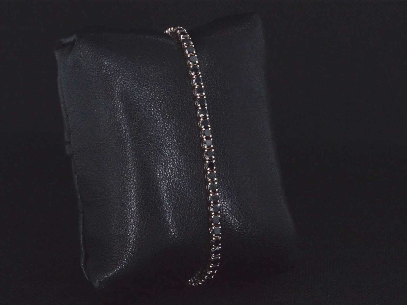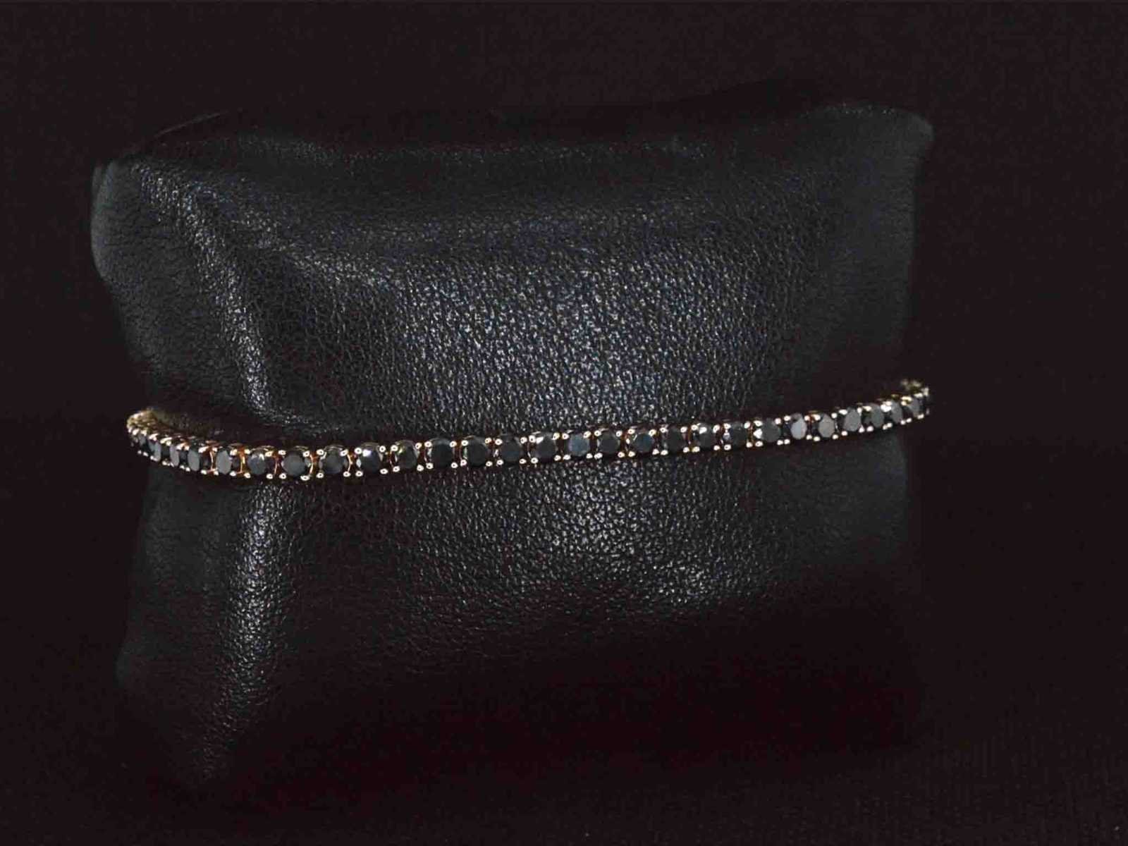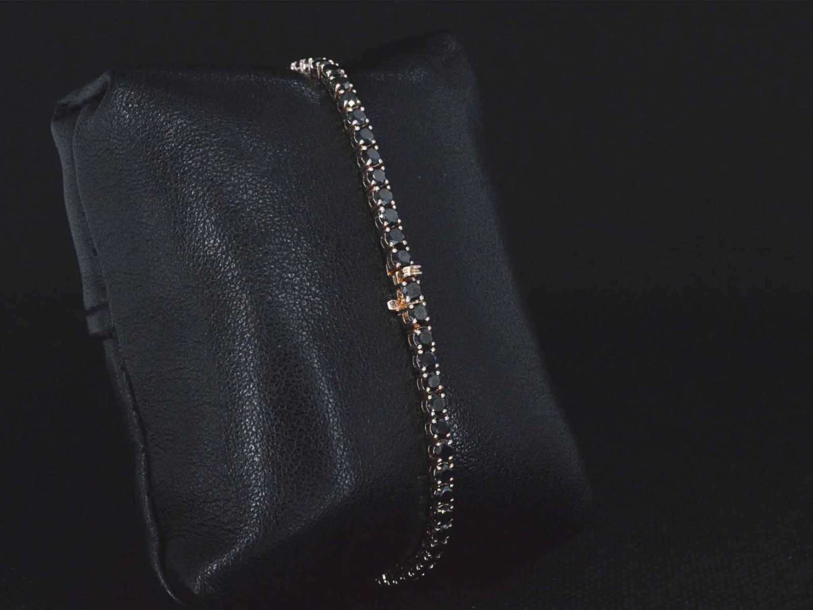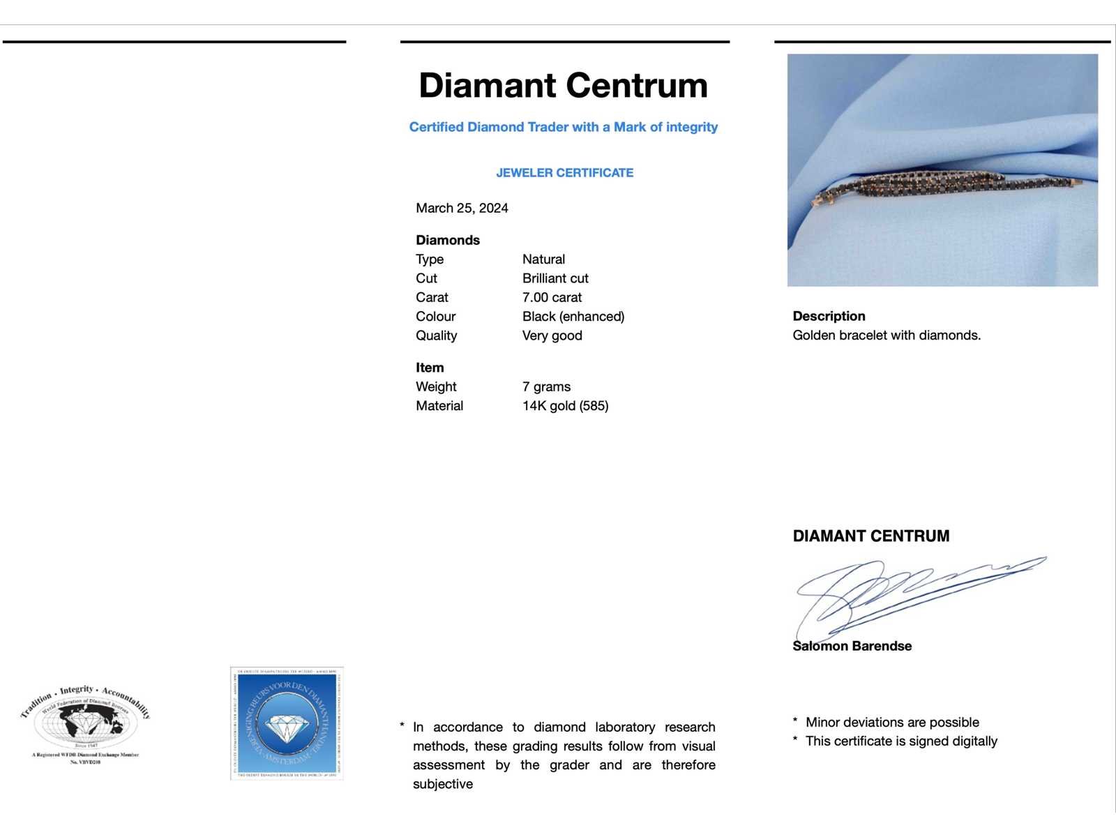 Samenvatting van gegevens Rosegouden armband met 7.00 carat zwarte Briljant geslepen diamanten Diamant: Natuurlijk; Aantal: 67 stuks; Slijpvorm: Briljant geslepen; Gewicht (carat): 7.00 carat; Kleur: Zwart (enhanced); Slijpkwaliteit: Zeer mooi; Juweel: Armband; Gewicht: 7 gram; Afmetingen/lengte: 18 cm; Materiaal: 14k goud (585); Conditie: Nieuw; Verpakking: Luxe sieradendoos; Toelichting: De kwaliteit is overgenomen van het rapport behorend bij item. De waardebepaling is een beoordeling van een gecertificeerde diamantair, gebaseerd op consumentenprijzen.; Consumentenprijs: € 5.040,- Within 14 days Materiaal: Goud Voornaamste diamant: Natuurlijk Kleur diamant: Zwart (enhanced) Gewicht diamant: 7.00ct Slijpvorm diamant: Briljant geslepen Slijpkwaliteit diamant: Zeer mooi Totaal gewicht: 7g Keurmerk: 585 Lage schatting: 4032€ Hoge schatting: 5040€