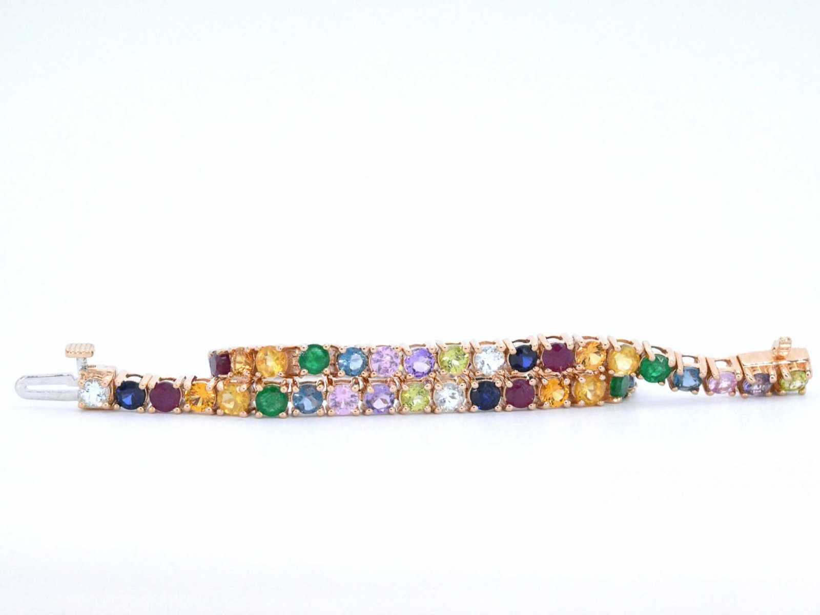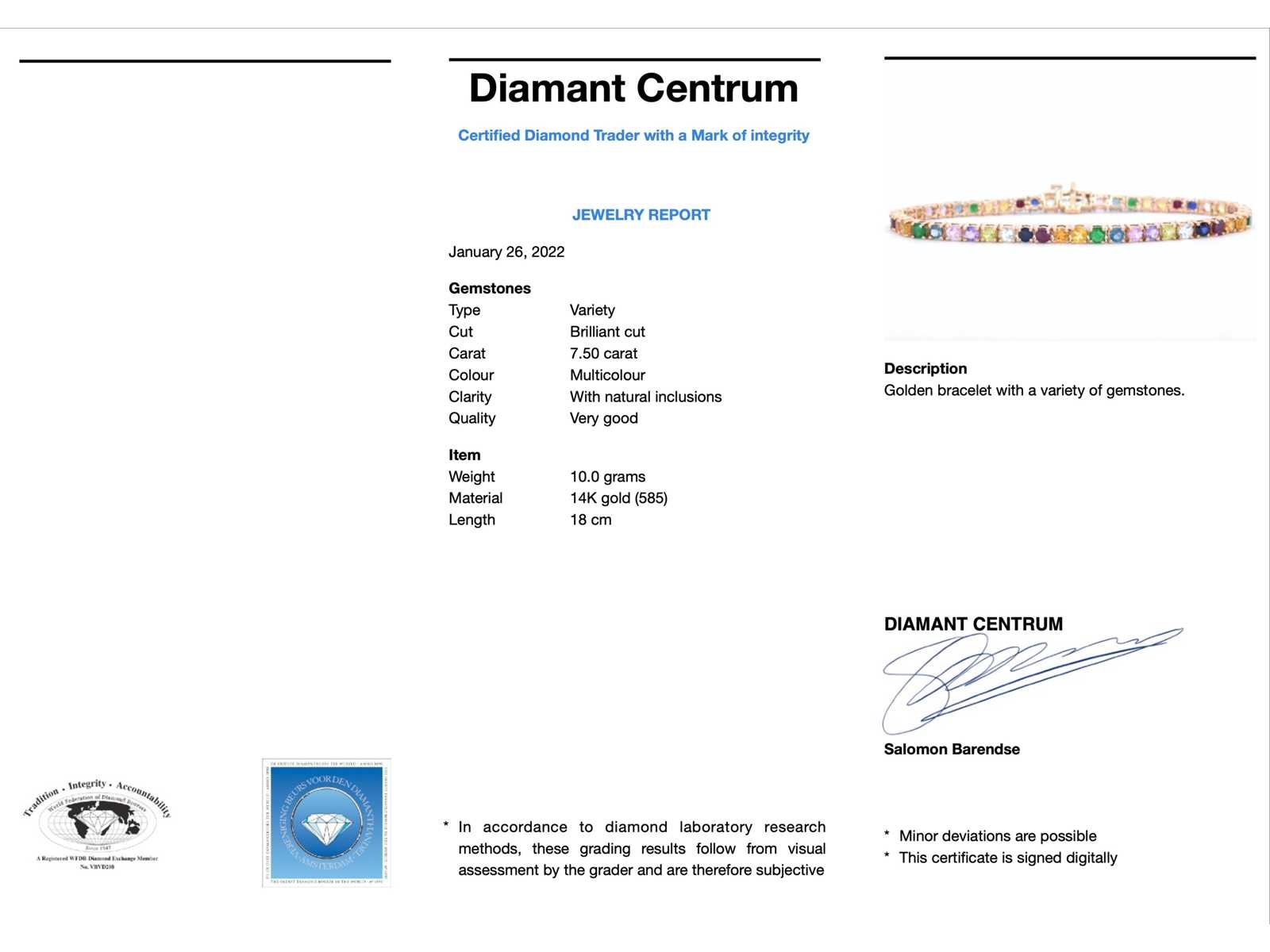 Samenvatting van gegevens Rosegouden tennisarmband met multi colour edelstenen Edelsteen: Regenboog; Slijpvorm: Briljant geslepen; Gewicht (carat): 7.50 carat; Kleur: multicolour; Zuiverheid: Met natuurlijke insluitsels; Slijpkwaliteit: Very good; Juweel: Armband; Gewicht: 10 gram; Afmetingen/lengte: 18 cm; Materiaal: 14k goud (585); Conditie: Nieuw; Verpakking: Luxe sieradendoos; Toelichting: De kwaliteit is overgenomen van het rapport behorend bij item. De waardebepaling is een beoordeling van een gecertificeerde diamantair, gebaseerd op consumentenprijzen.; Consumentenprijs: € 5.968,- Within 14 days Materiaal: Goud Edelsteen: Regenboog Kleur edelsteen: multicolour Slijpvorm edelsteen: Briljant geslepen Slijpkwaliteit edelsteen: Very good Zuiverheidsgraad edelsteen: Met natuurlijke insluitsels Totaal gewicht: 10g Keurmerk: 585 Lage schatting: 4774.400000000001€ Hoge schatting: 5968€
