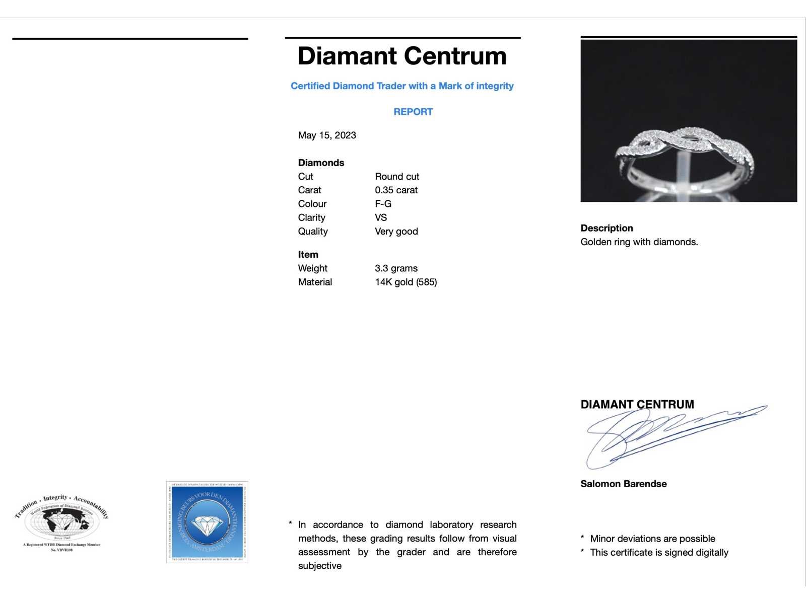 Samenvatting van gegevens Witgouden ring met diamanten Diamant: Natuurlijk; Slijpvorm: Rond geslepen; Gewicht (carat): 0.35 carat; Kleur: F-G; Zuiverheid: VS; Slijpkwaliteit: Zeer mooi; Juweel: Ring; Gewicht: 3.3 gram; Ringmaat (op maat gemaakt*): 53 (17 mm); Materiaal: 14 karaat (585); Conditie: Nieuw; Verpakking: Luxe sieradendoos; Toelichting: De kwaliteit is overgenomen van het rapport behorend bij item. De waardebepaling is een beoordeling van een gecertificeerde diamantair, gebaseerd op consumentenprijzen.; Consumentenprijs: € 2.398,- Within 14 days Voornaamste diamant: Natuurlijk Gewicht diamant: 0.35ct Totaal gewicht: 3.3g Keurmerk: 585 Lage schatting: 1918.4€ Hoge schatting: 2398€ Kleur diamant: F-G Slijpvorm diamant: Rond geslepen Slijpkwaliteit diamant: Zeer mooi Zuiverheidsgraad diamant: VS