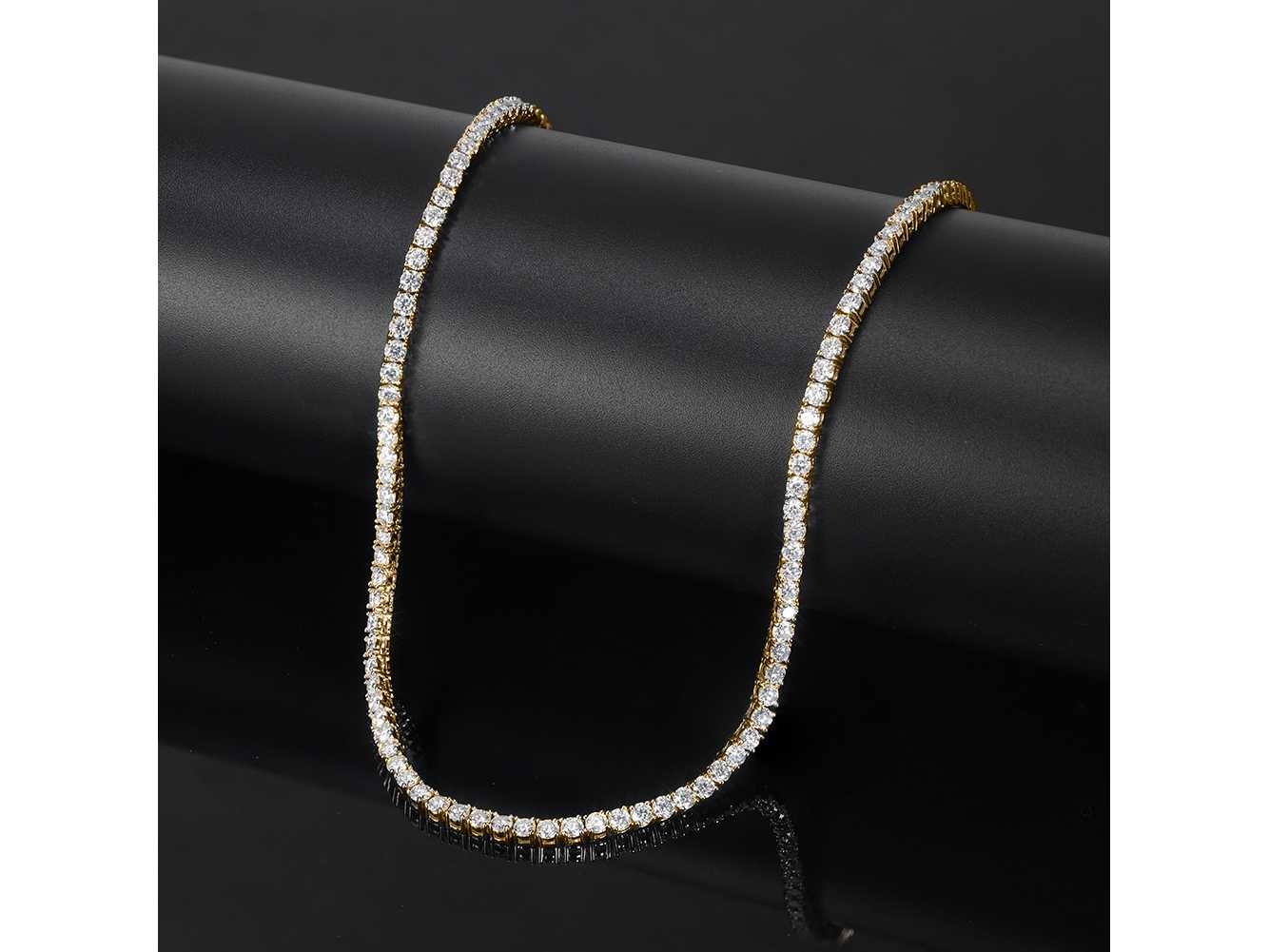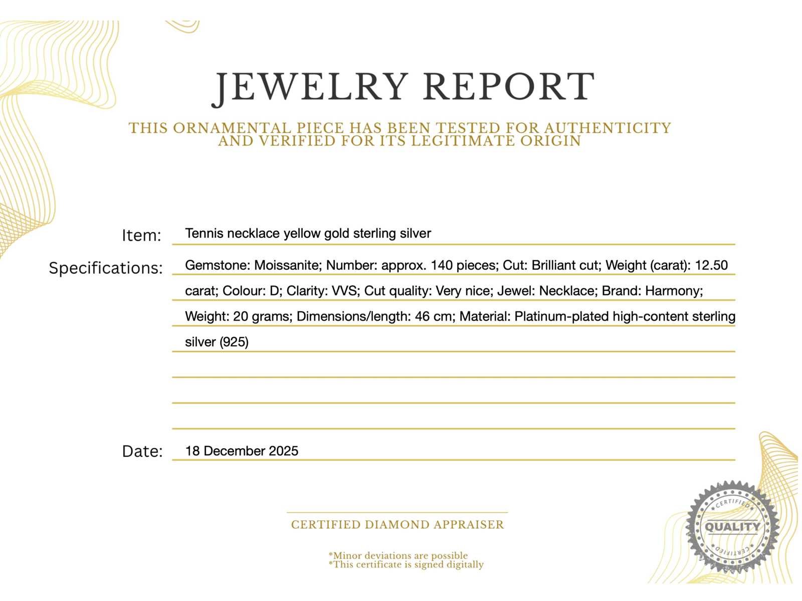 Samenvatting van gegevens Tennis collier geel goud sterling zilver Edelsteen: Moissaniet; Aantal: ca. 140 stuks; Slijpvorm: Briljant geslepen; Gewicht (carat): 12.50 carat; Kleur: D; Zuiverheid: VVS; Slijpkwaliteit: Zeer mooi; Juweel: Halsketting; Merk: Harmony; Gewicht: 20 gram; Afmetingen/lengte: 46 cm; Materiaal: Geplatineerd hoog gehalte sterling zilver (925); Conditie: Nieuw; Verpakking: Sieradendoos of fluwelen etui; Toelichting: De kwaliteit is overgenomen van het rapport behorend bij item. De waardebepaling is een beoordeling van een gecertificeerde diamantair, gebaseerd op consumentenprijzen.; Consumentenprijs: € 2.000,- Within 14 days Materiaal: Zilver Edelsteen: Moissaniet Kleur edelsteen: D Totaal gewicht: 20g Keurmerk: 925 Lage schatting: 1600€ Hoge schatting: 2000€ Slijpkwaliteit edelsteen: Zeer mooi Slijpvorm edelsteen: Briljant geslepen Zuiverheidsgraad edelsteen: VVS
