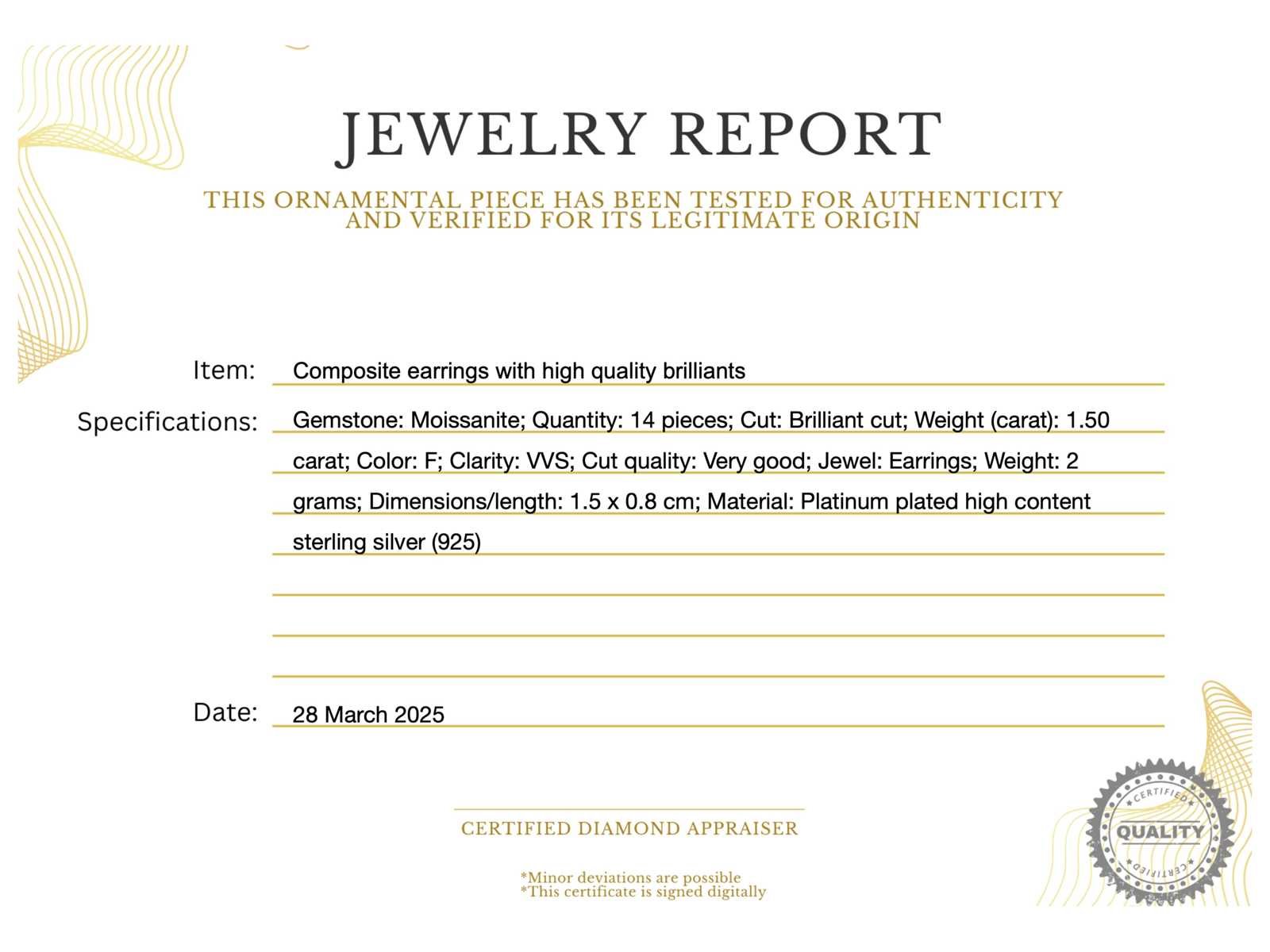 Samenvatting van gegevens Samengestelde oorbellen met briljante van hoge kwaliteit Edelsteen: Moissaniet; Aantal: 14 stuks; Slijpvorm: Briljant geslepen; Gewicht (carat): 1.50 carat; Kleur: F; Zuiverheid: VVS; Slijpkwaliteit: Zeer mooi; Juweel: Oorbellen; Merk: Harmony; Gewicht: 2 gram; Afmetingen/lengte: 1.5 x 0.8 cm; Materiaal: Geplatineerd hoog gehalte sterling zilver (925); Conditie: Nieuw; Verpakking: Sieradendoos of fluwelen etui; Extra informatie: Het gemeten gewicht van de edelstenen is volgens diamant maten; Consumentenprijs: € 600,- Within 14 days Materiaal: Zilver Edelsteen: Moissaniet Kleur edelsteen: F Slijpvorm edelsteen: Briljant geslepen Slijpkwaliteit edelsteen: Zeer mooi Zuiverheidsgraad edelsteen: VVS Totaal gewicht: 2g Keurmerk: 925 Lage schatting: 480€ Hoge schatting: 600€
