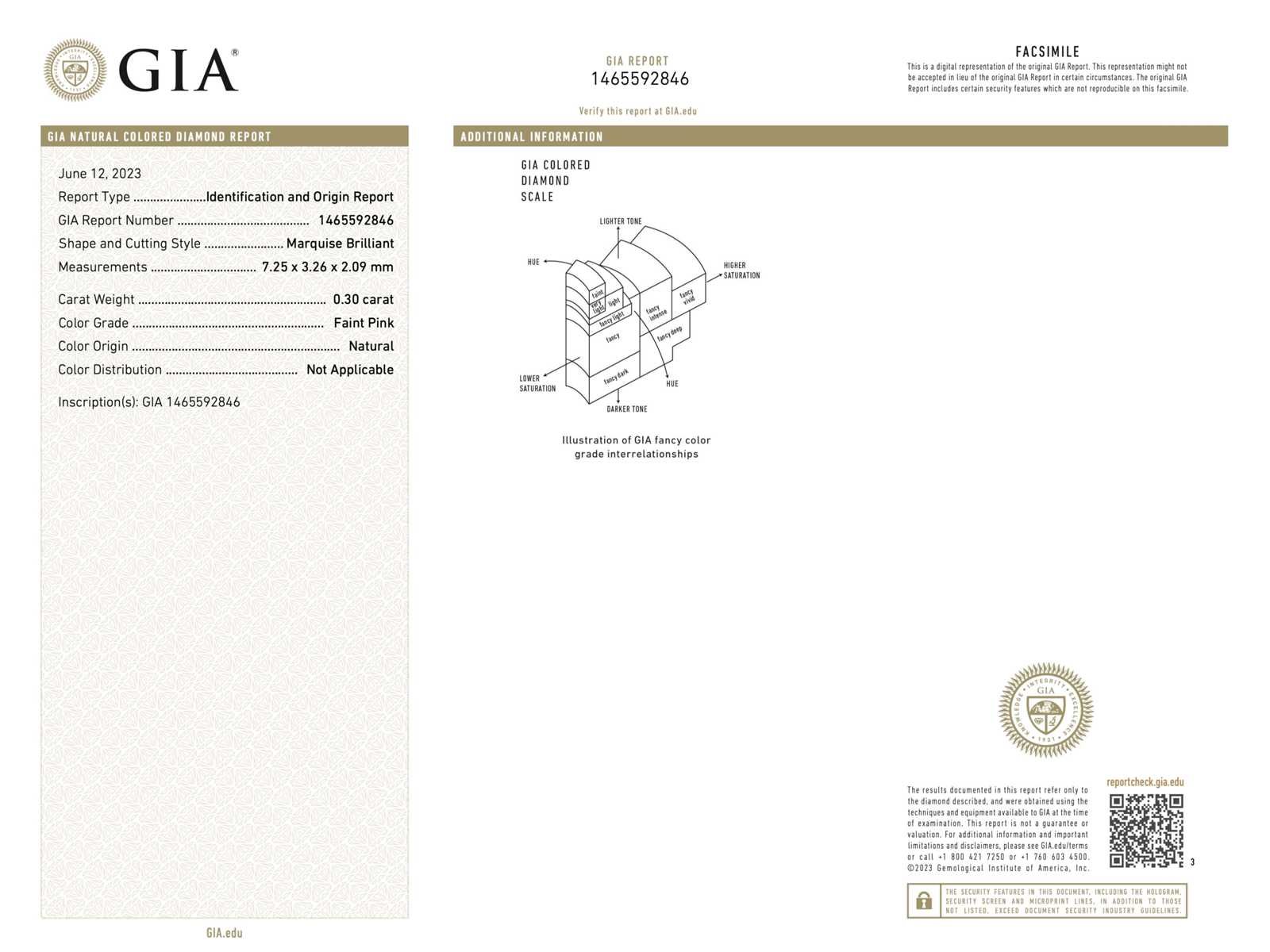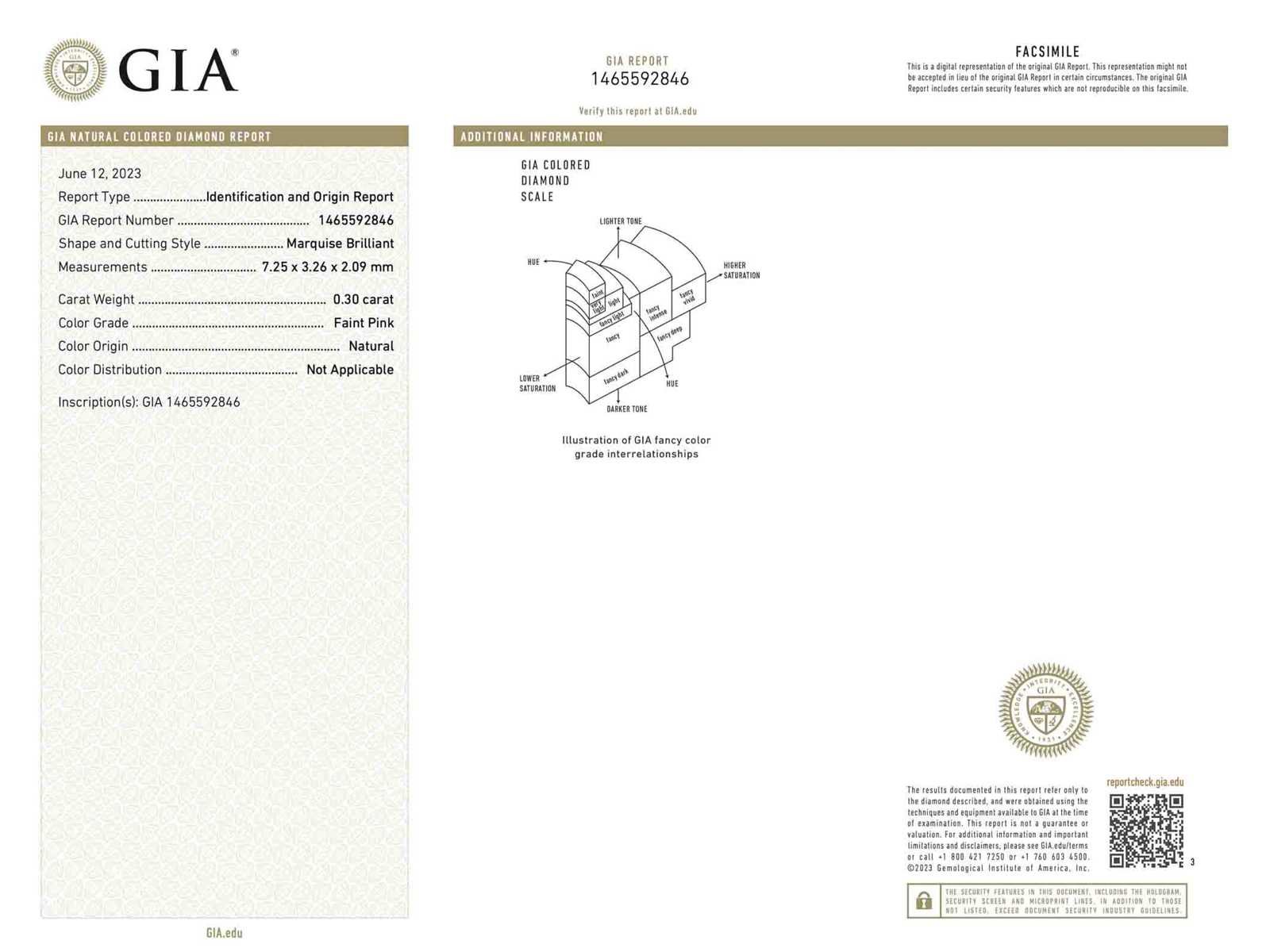 Samenvatting van gegevens Diamant - 0.30 carat echte natuurlijke roze diamant Diamant: Natuurlijk; Aantal: 1 stuk; Slijpvorm: Marquise geslepen; Gewicht (carat): 0.30 carat; Kleur: Faint pink; Certificaat: GIA; Certificaat nummer: 1465592846; Conditie: Nieuw; Verpakking: Edelsteendoos; Toelichting: De kwaliteit is overgenomen van het rapport behorend bij item. De waardebepaling is een beoordeling van een gecertificeerde diamantair, gebaseerd op consumentenprijzen.; Consumentenprijs: € 9.900,- Within 14 days Voornaamste diamant: Natuurlijk Kleur diamant: Faint pink Gewicht diamant: 0.30ct Slijpvorm diamant: Marquise geslepen Certificaat: GIA Lage schatting: 7920€ Hoge schatting: 9900€