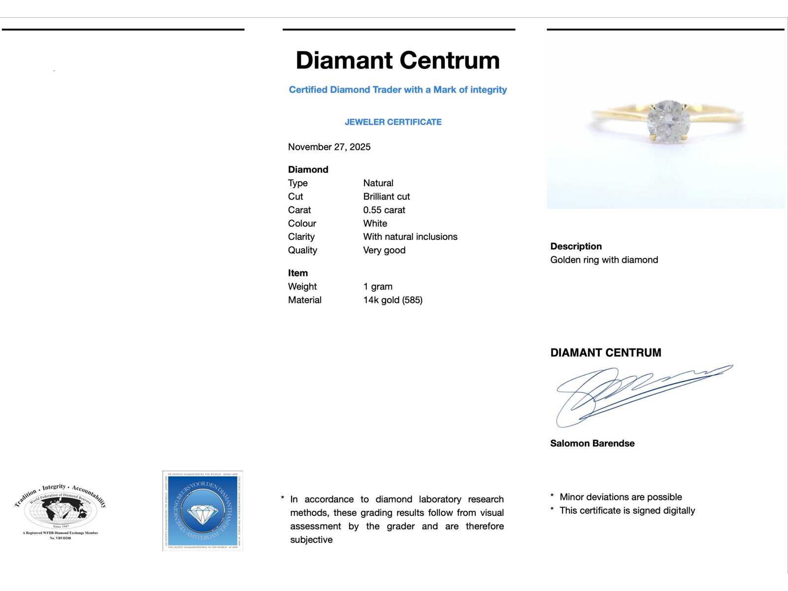 Samenvatting van gegevens Gouden ring solitair met natuurlijke briljant geslepen diamanten Diamant: Natuurlijk; Aantal: 1 stuk; Slijpvorm: Briljant geslepen; Gewicht (carat): 0.55 carat; Kleur: Wit; Zuiverheid: Met natuurlijke insluitsels; Slijpkwaliteit: Zeer mooi; Juweel: Ring; Gewicht: 1 gram; Ringmaat (op maat gemaakt*): 54 (17.25 mm); Materiaal: 14k goud (585); Conditie: Nieuw; Verpakking: Luxe sieradendoos; Toelichting: De kwaliteit is overgenomen van het rapport behorend bij item. De waardebepaling is een beoordeling van een gecertificeerde diamantair, gebaseerd op consumentenprijzen.; Consumentenprijs: € 1.820,- Within 14 days Materiaal: Goud Voornaamste diamant: Natuurlijk Gewicht diamant: 0.55ct Totaal gewicht: 1g Keurmerk: 585 Lage schatting: 1456€ Hoge schatting: 1820€ Kleur diamant: Wit Slijpvorm diamant: Briljant geslepen Slijpkwaliteit diamant: Zeer mooi Zuiverheidsgraad diamant: Met natuurlijke insluitsels