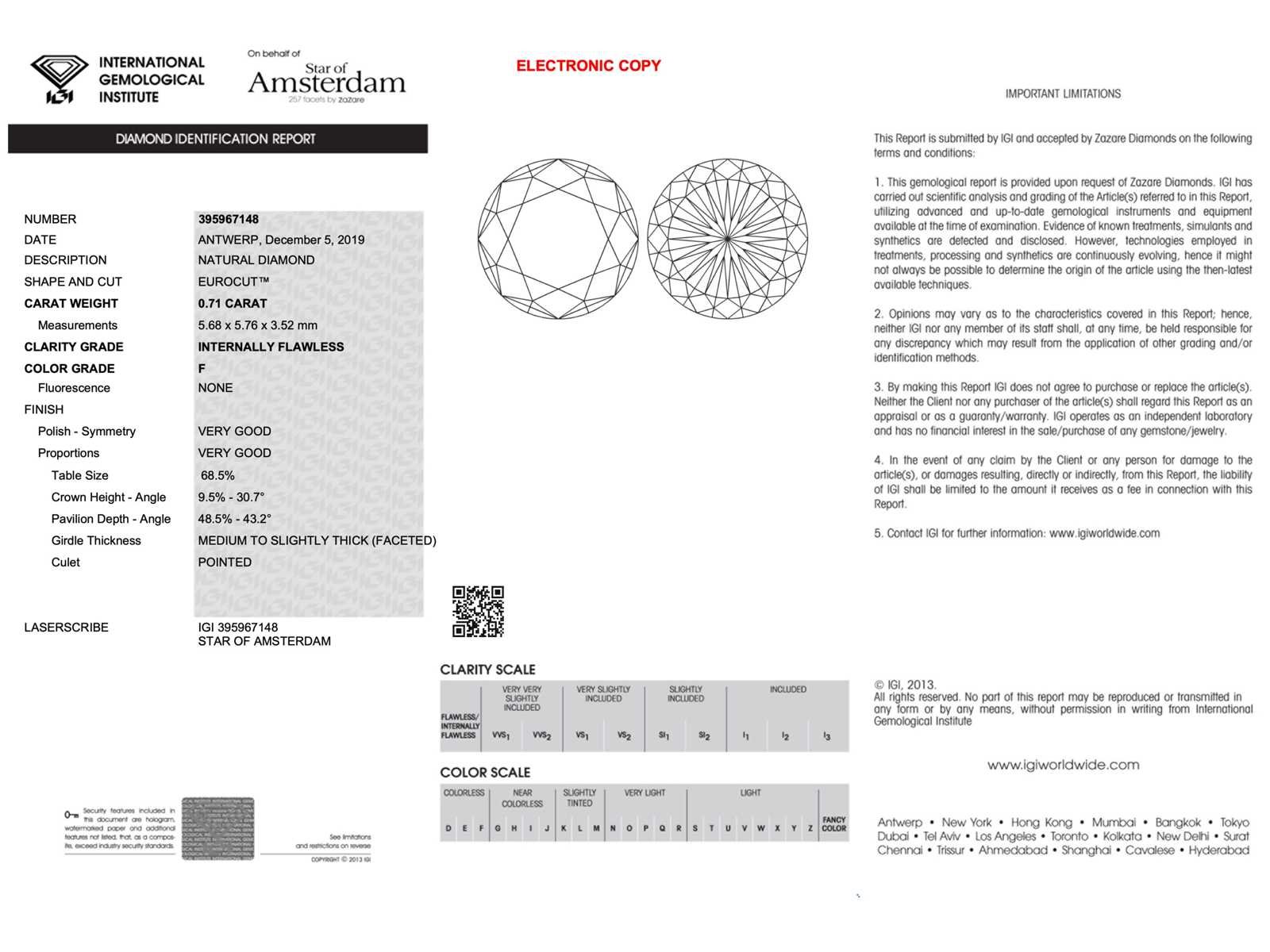 Samenvatting van gegevens Diamant - 0.71 carat echte natuurlijke "Star of Amsterdam" diamant (gecertificeerd) Diamant: Natuurlijk; Aantal: 1 stuk; Slijpvorm: Euro cut; Gewicht (carat): 0.71 carat; Kleur: F; Zuiverheid: IF; Certificaat: IGI; Certificaat nummer: 395967148; Merk: 257 facetten 'Star of Amsterdam'; Conditie: Nieuw; Verpakking: Edelsteendoos; Toelichting: De kwaliteit is overgenomen van het rapport behorend bij item. De waardebepaling is een beoordeling van een gecertificeerde diamantair, gebaseerd op consumentenprijzen.; Consumentenprijs: € 12.000,- Within 14 days Voornaamste diamant: Natuurlijk Kleur diamant: F Gewicht diamant: 0.71ct Slijpvorm diamant: Euro cut Zuiverheidsgraad diamant: IF Certificaat: IGI Lage schatting: 9600€ Hoge schatting: 12000€