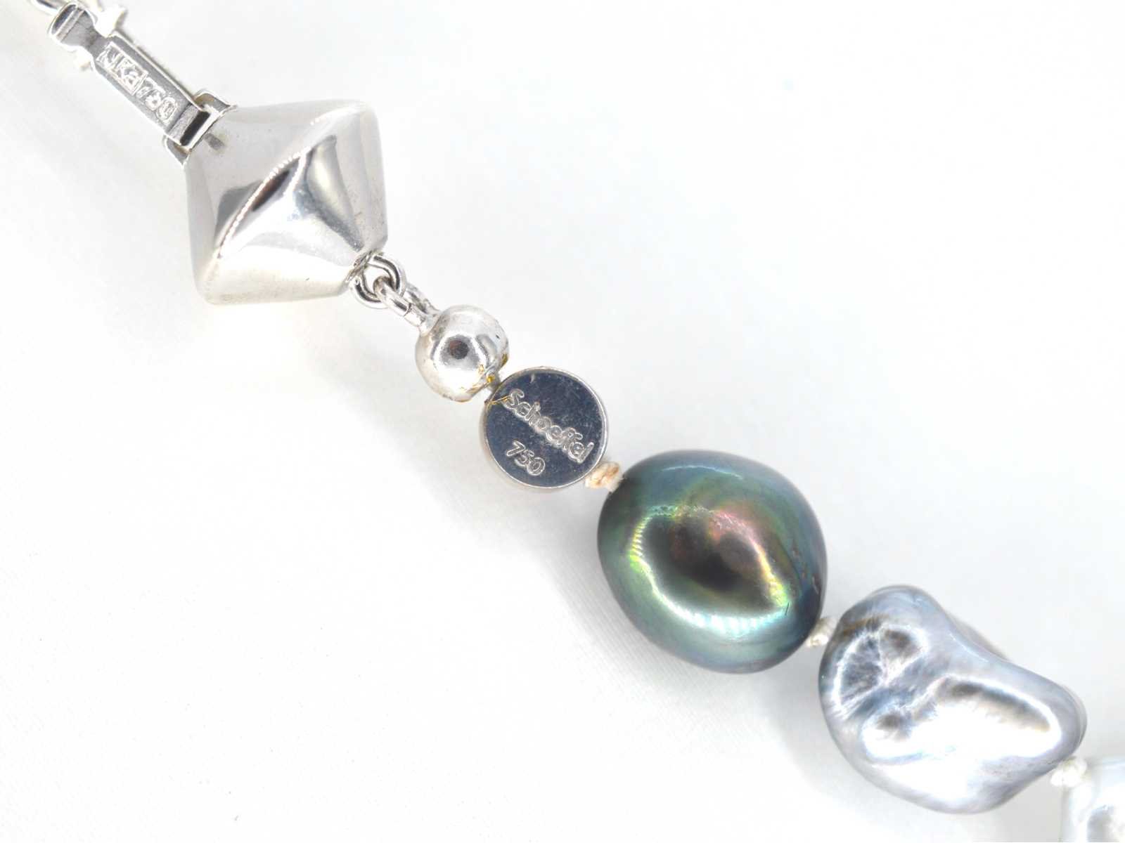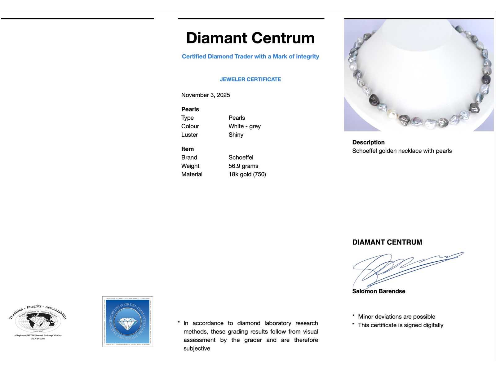 Samenvatting van gegevens Schoeffel - Barok parel ketting met witgouden sluiting Parel: Parels; Kleur: wit - grijs ; Luster: Glanzend; Juweel: Halsketting; Merk: Schoeffel; Gewicht: 40 gram; Afmetingen/lengte: 48 cm; Materiaal: 18K goud (750); Conditie: Zo goed als nieuw; Verpakking: Luxe sieradendoos; Toelichting: De kwaliteit is overgenomen van het rapport behorend bij item. De waardebepaling is een beoordeling van een gecertificeerde diamantair, gebaseerd op consumentenprijzen.; Consumentenprijs: € 5.775,- Within 14 days Materiaal: Goud Totaal gewicht: 40g Keurmerk: 750 Lage schatting: 4620€ Hoge schatting: 5775€