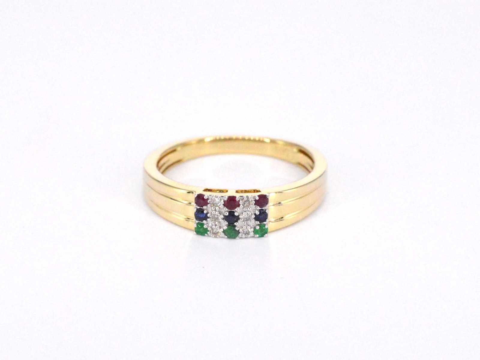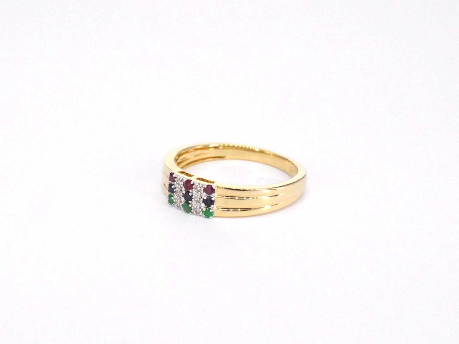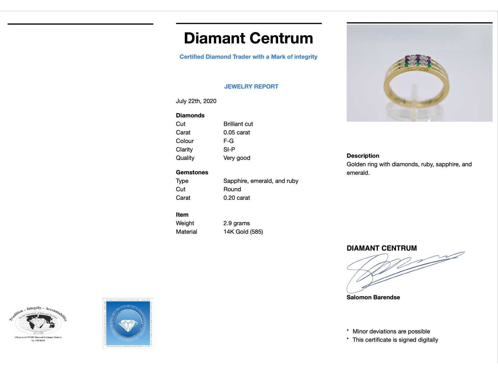 Samenvatting van gegevens Gouden ring met diamant en multicolour edelstenen Diamant: Natuurlijk; Slijpvorm: Briljant geslepen; Gewicht (carat): 0.05 carat; Kleur: F-G; Zuiverheid: SI-P; Slijpkwaliteit: Zeer mooi; Edelsteen: Saffier, smaragd en robijn; Slijpvorm: Rond geslepen; Gewicht (carat): 0.20 carat; Juweel: Ring; Gewicht: 2.9 gram; Ringmaat (op maat gemaakt*): 54 (17.25 mm); Materiaal: 14k goud (585); Conditie: Nieuw; Verpakking: Luxe sieradendoos; Toelichting: De kwaliteit is overgenomen van het rapport behorend bij item. De waardebepaling is een beoordeling van een gecertificeerde diamantair, gebaseerd op consumentenprijzen.; Consumentenprijs: € 1.698,- Within 14 days Materiaal: Goud Voornaamste diamant: Natuurlijk Gewicht diamant: 0.05ct Edelsteen: Saffier, smaragd en robijn Totaal gewicht: 2.9g Keurmerk: 585 Lage schatting: 1358.4€ Hoge schatting: 1698€ Kleur diamant: F-G Slijpvorm diamant: Briljant geslepen Slijpkwaliteit diamant: Zeer mooi Zuiverheidsgraad diamant: SI-P Slijpvorm edelsteen: Rond geslepen