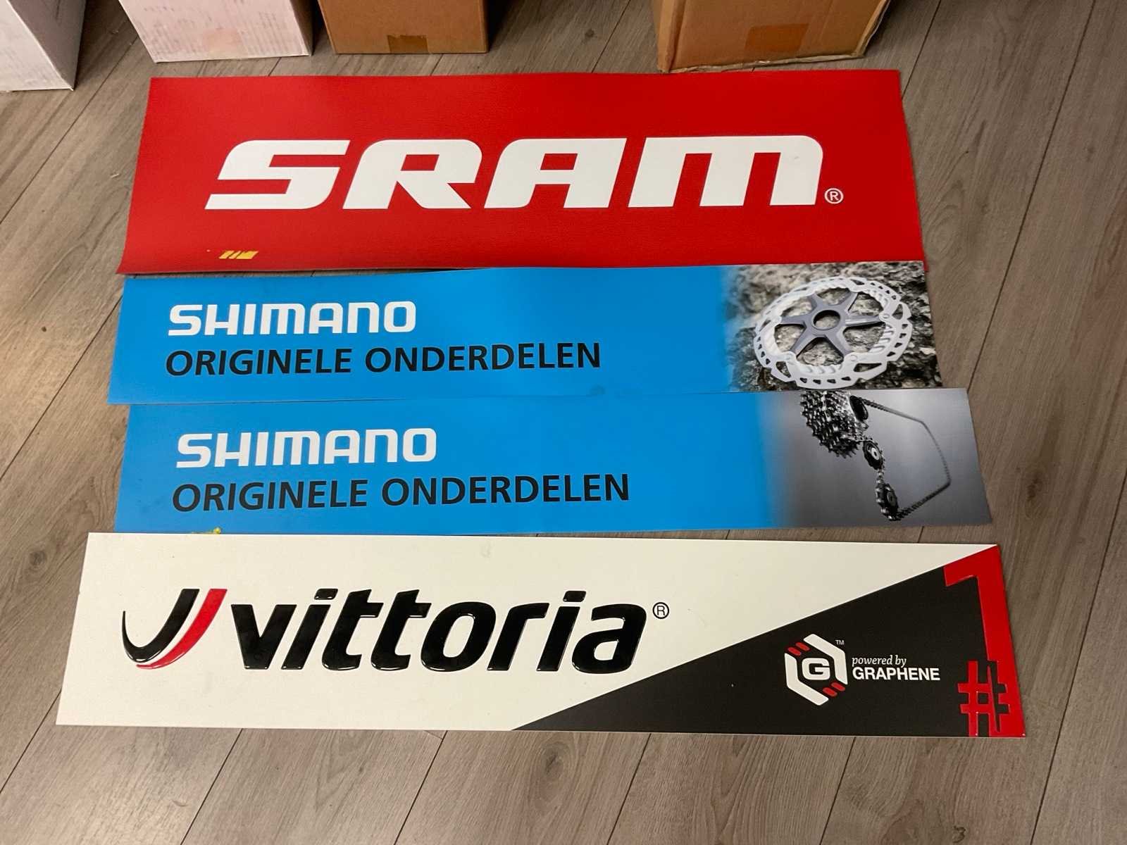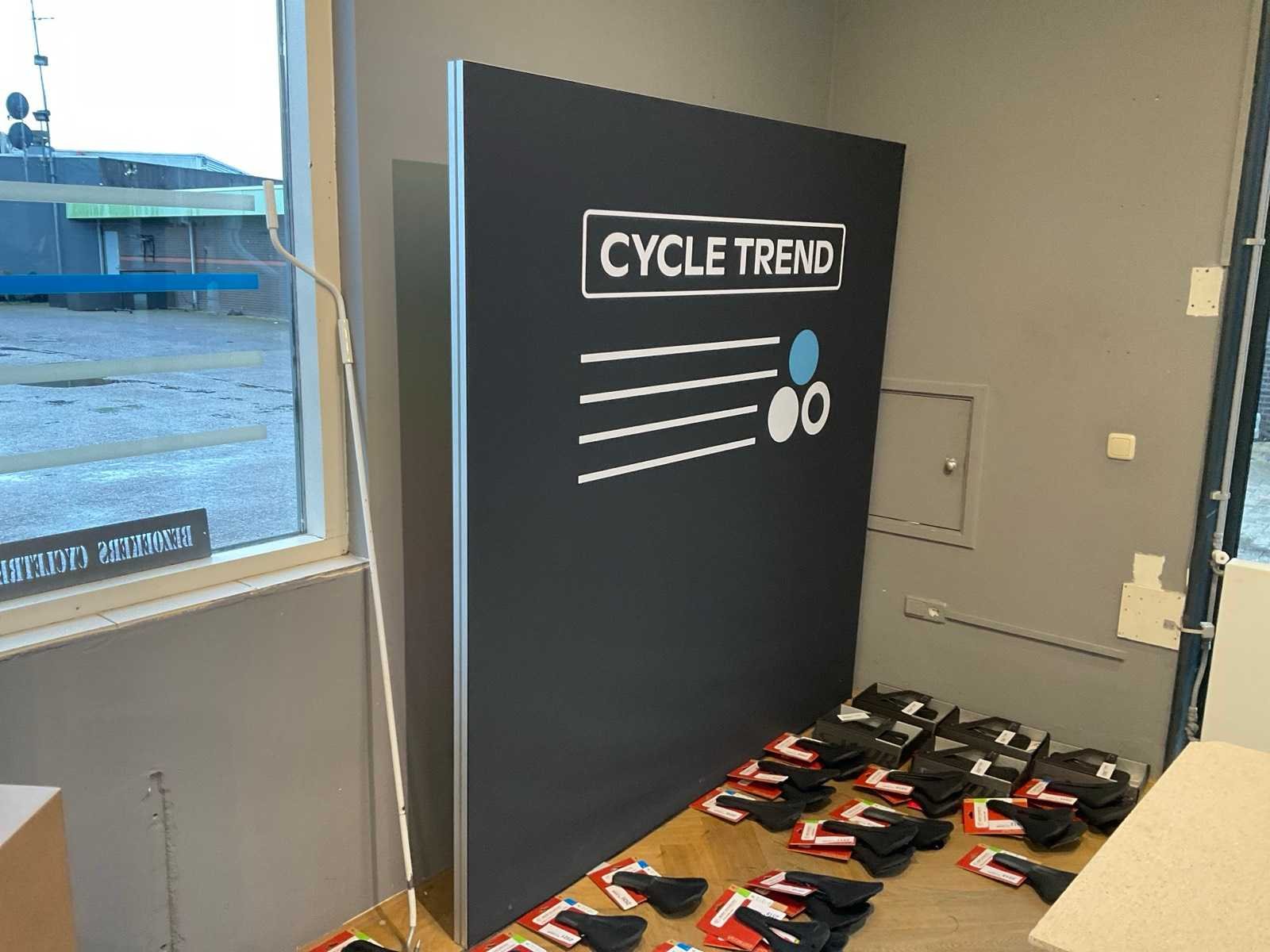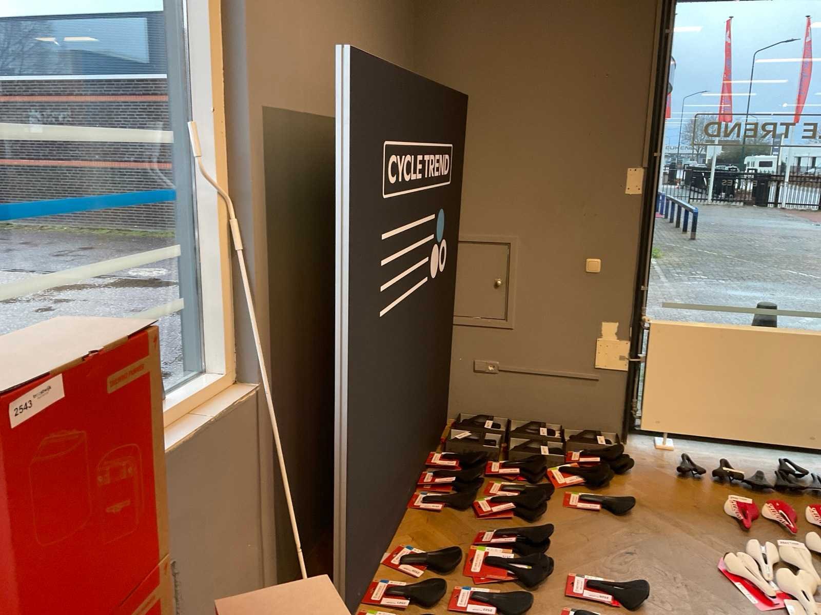 Bestaande uit: Shimano licht reclame (demonteren achter plafonddeel), Shimano wand reclame (circa 375x200 cm), Cycle trend stoepbord (circa 140x90x150 cm) en wandbord (circa 190x200 cm), Wahoo reclamezuil met monitor(circa 60x65x185 cm), Cycle trend wandreclame (circa 300x180 cm)
