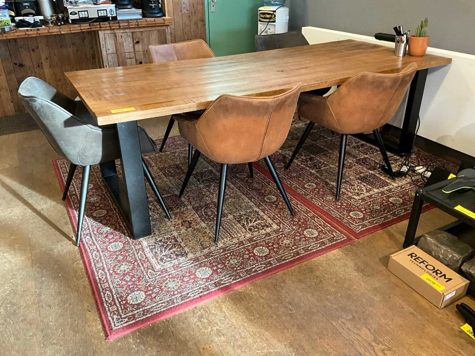 Bestaande uit: 1x tafel 240x100x75cm, 5x stoel diverse kleuren en 2x vloerkleed