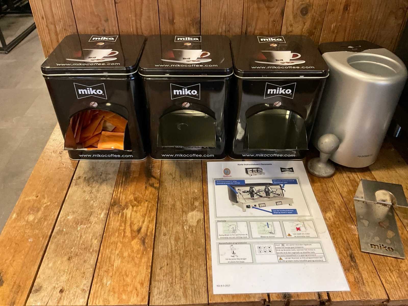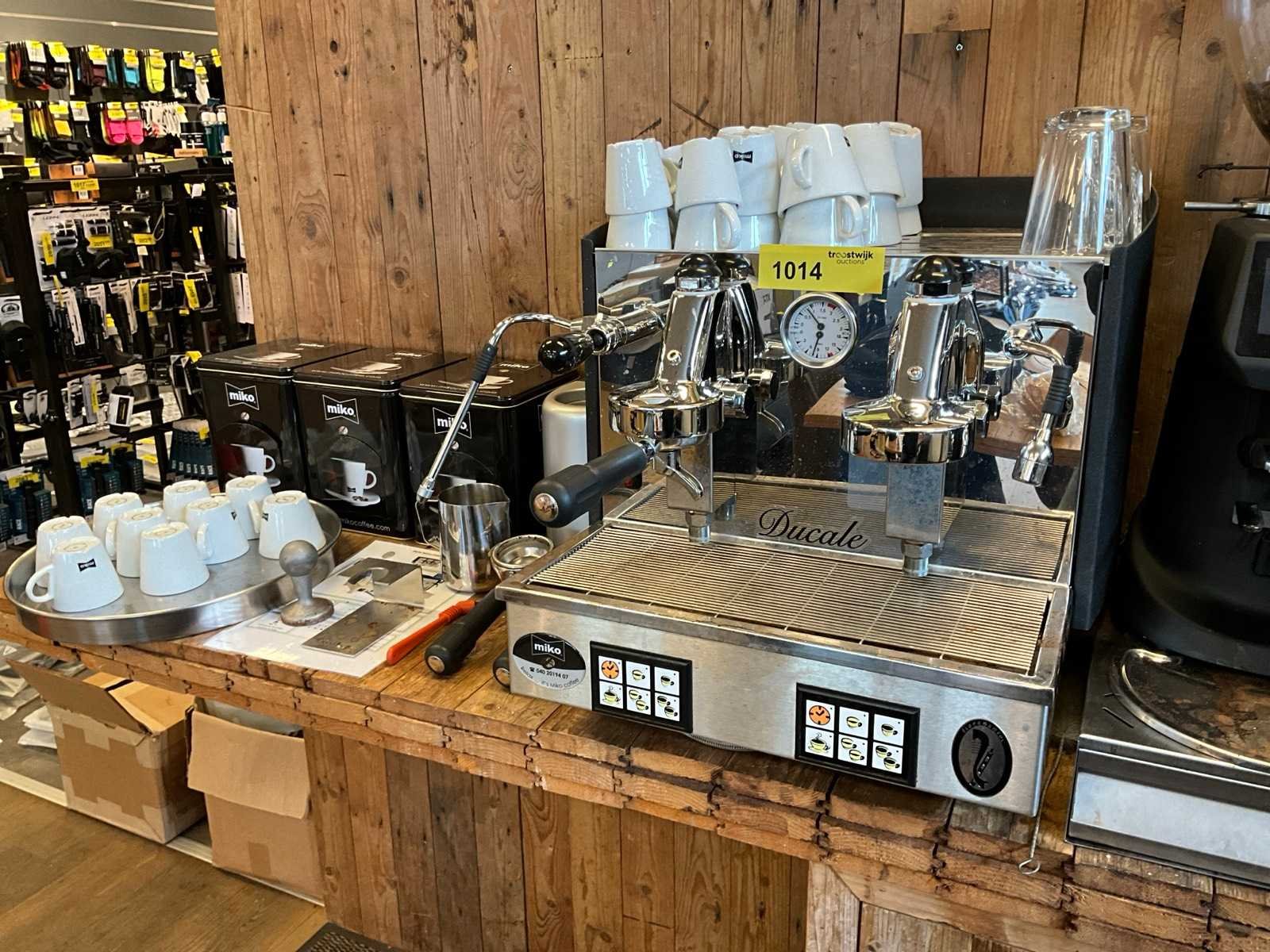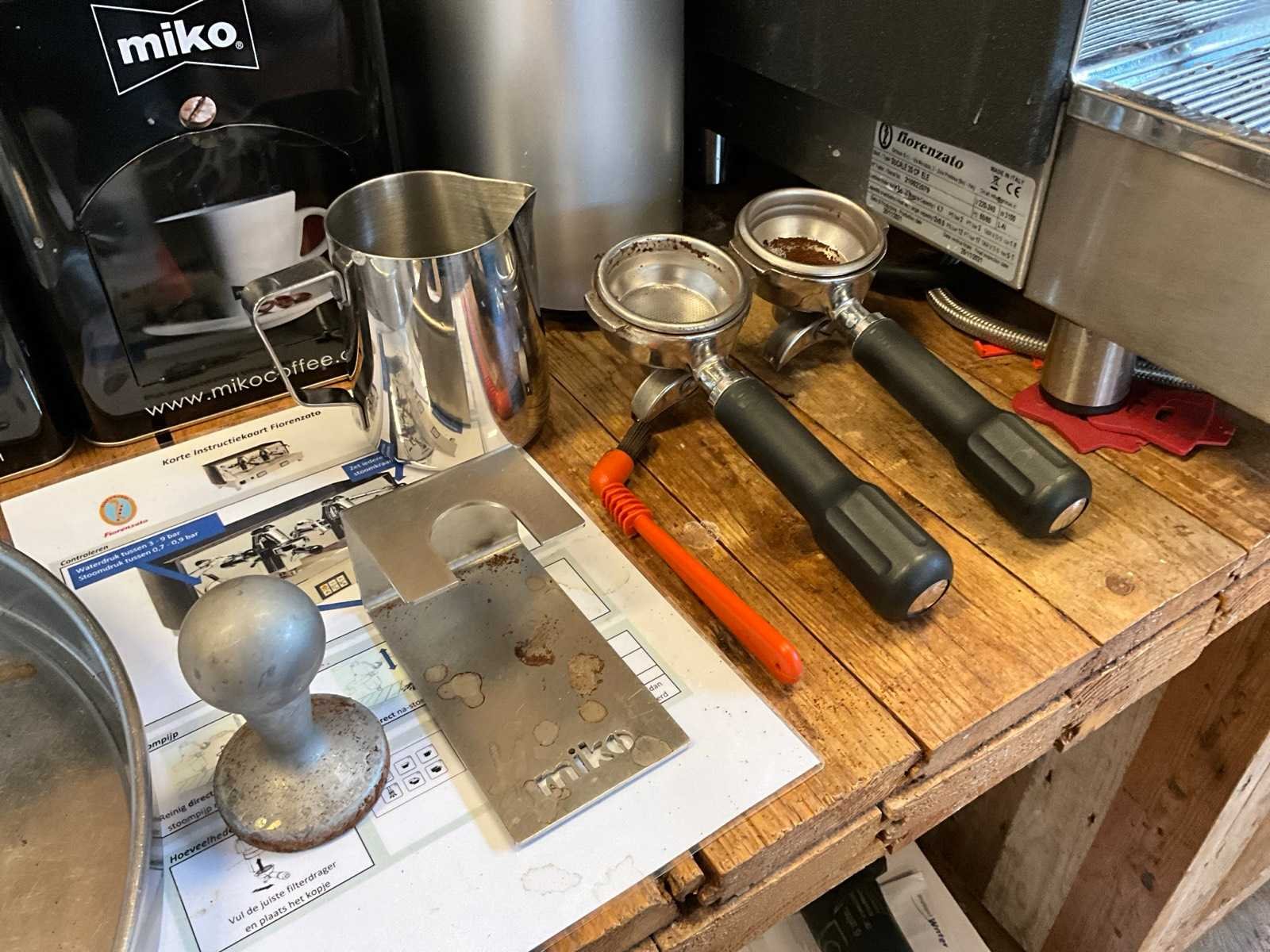Voorzien van: stoompijp en aparte heetwater uitloop; 1x filterdrager enkele uitloop, 2x filterdrager dubbele uitloop, pistonhouder, waterontharder, kopjes, stamper, melkverwarmer, blikken voor koffie accessoires, inhoud lades. Merk: Fiorenzato Model: Ducale 2 groeps Pompdruk: 0.9 Inhoud waterreservoir: 12l Lengte: 50cm Breedte: 50cm Hoogte: 42cm