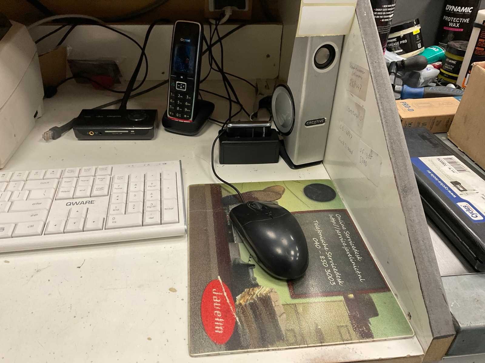 Bestaande uit: scherm, 2x toetsenbord, 2x labelprinter, 2x muis, 2x Creative speaker , scanner, telefoon.