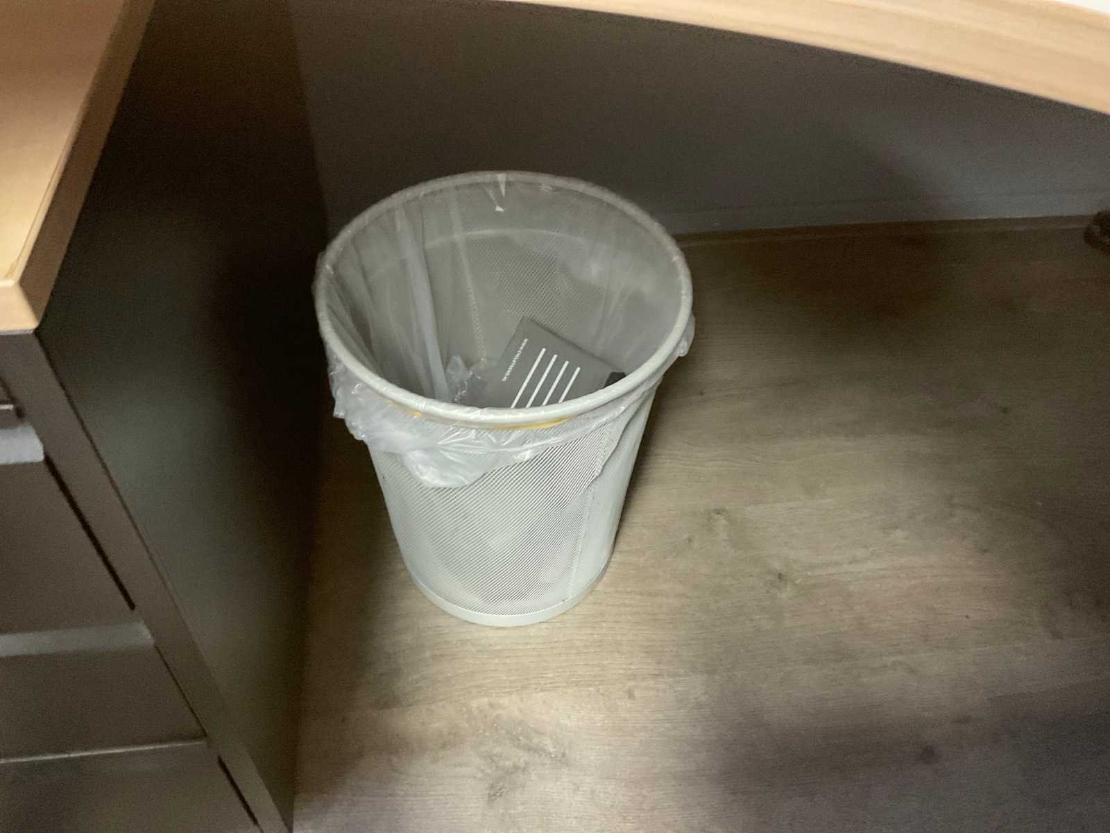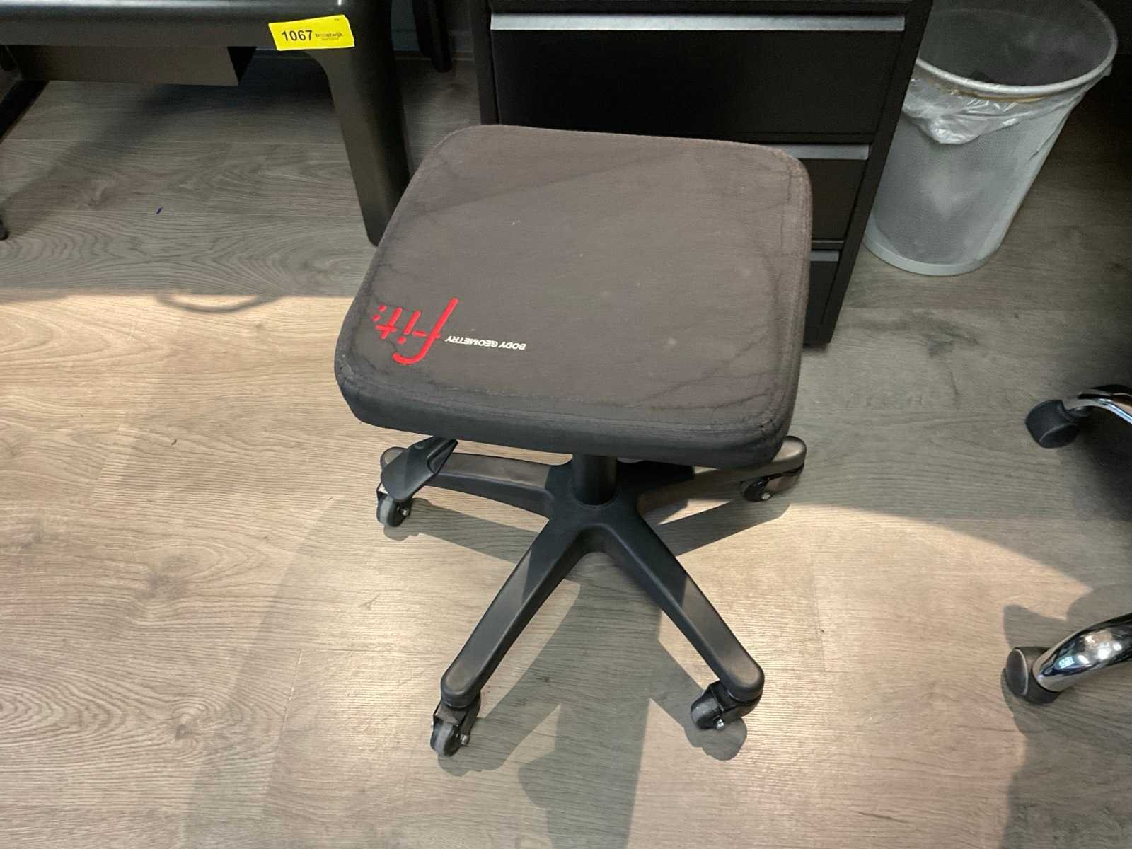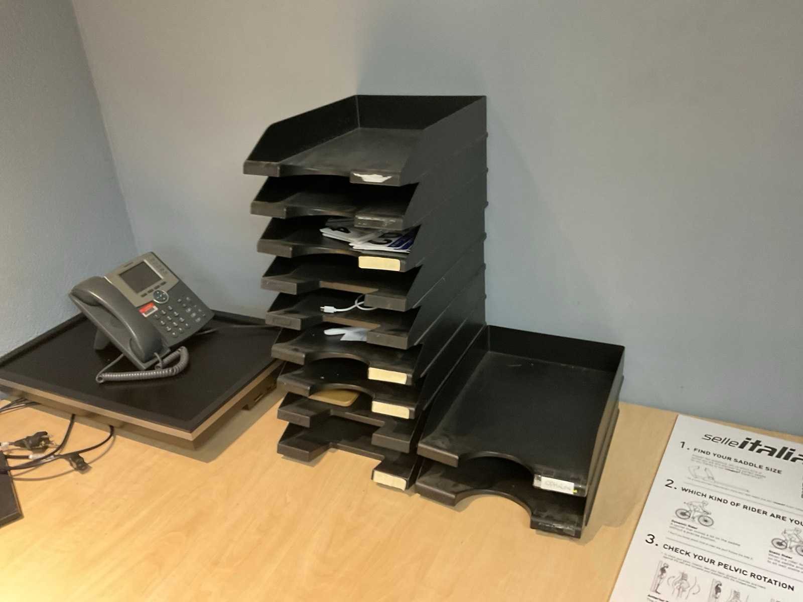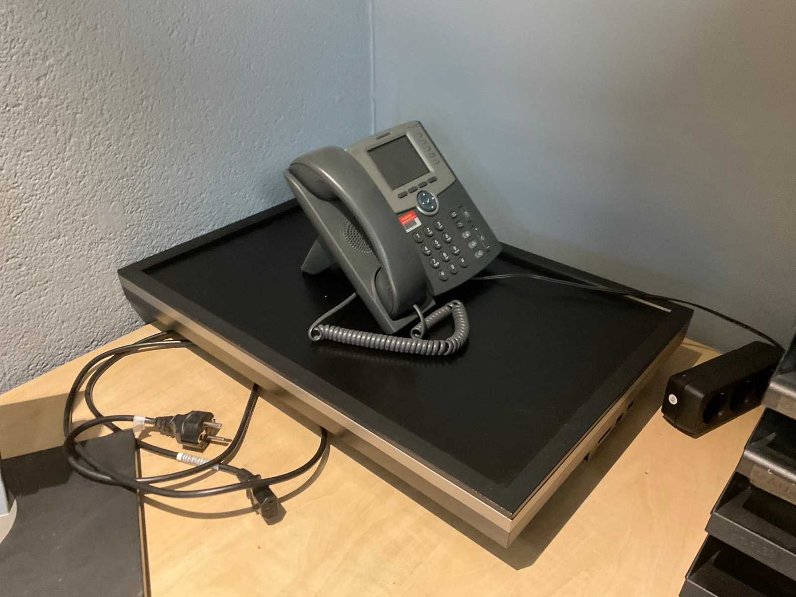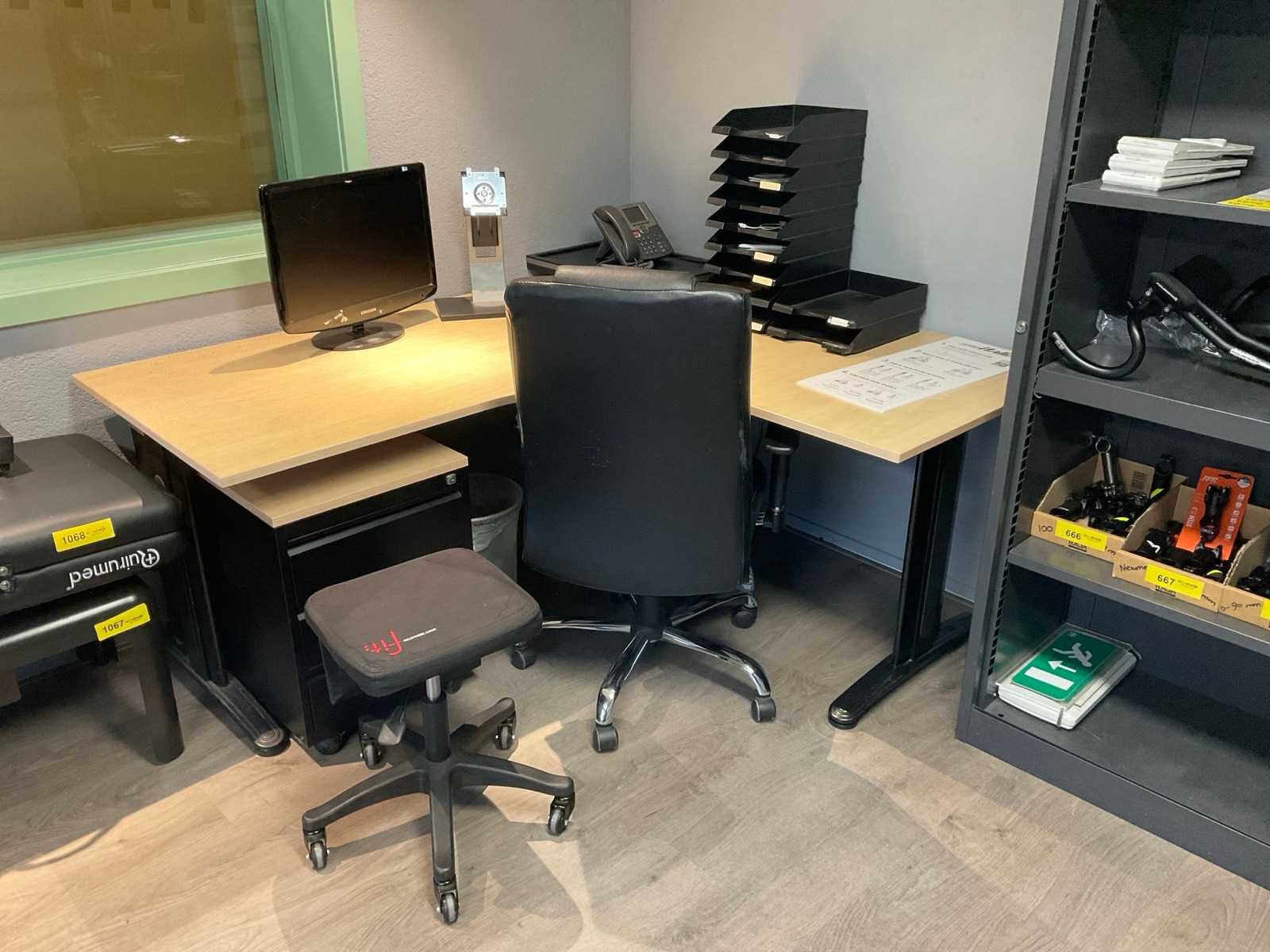 Bestaande uit: hoek bureau (180x160x75 cm), bureaustoel, krukje, ladenkast, 2x scherm, telefoon, bakjes, prullenbak.